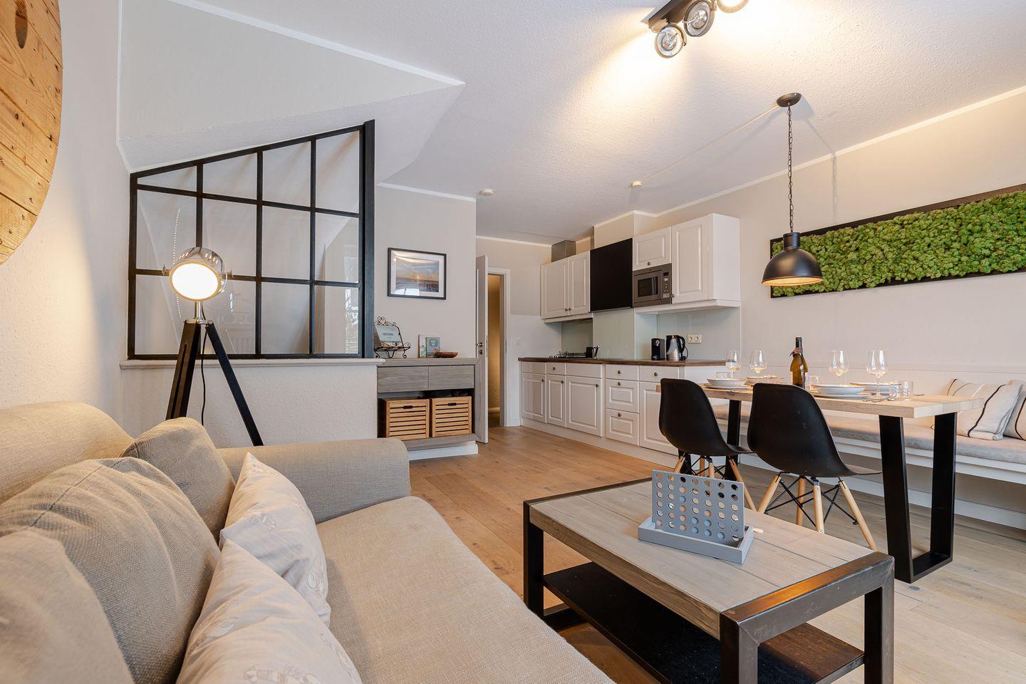 Auf zwei Ebenen und rund 60 m² bietet das Küstennest Raum für bis zu vier Personen. Der Wohnbereich ist offen, lichtdurchflutet und genau der richtige Ort für gemeinsames Ankommen – morgens mit Kaffee, nach einem Strandtag oder in den ruhigeren Abendstunden. Die Küche ist vollständig ausgestattet und selbstverständlich Teil des Raumes, funktional und hochwertig, ohne den Wohncharakter zu verlieren.