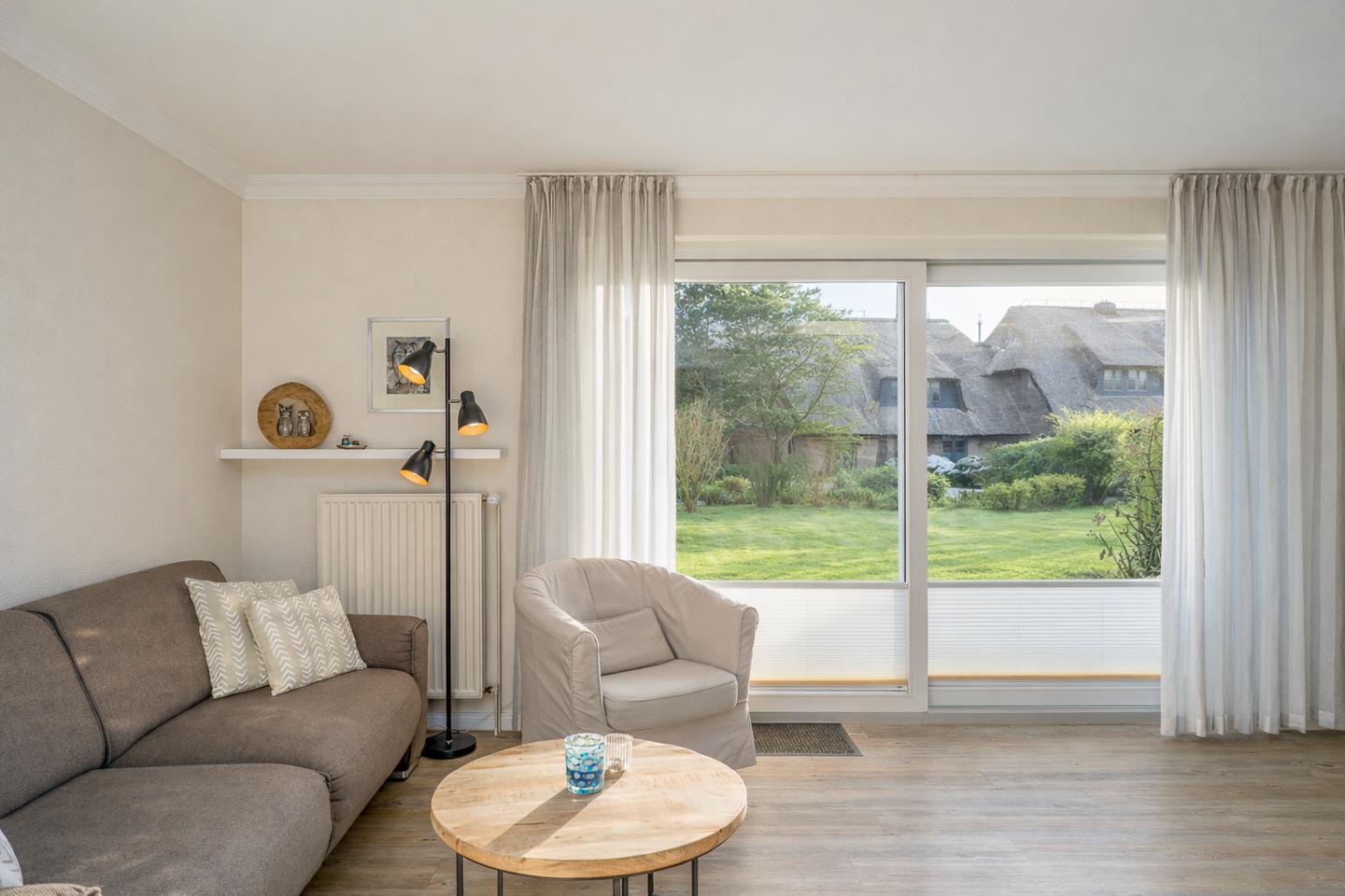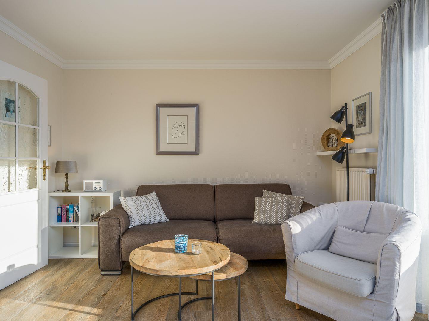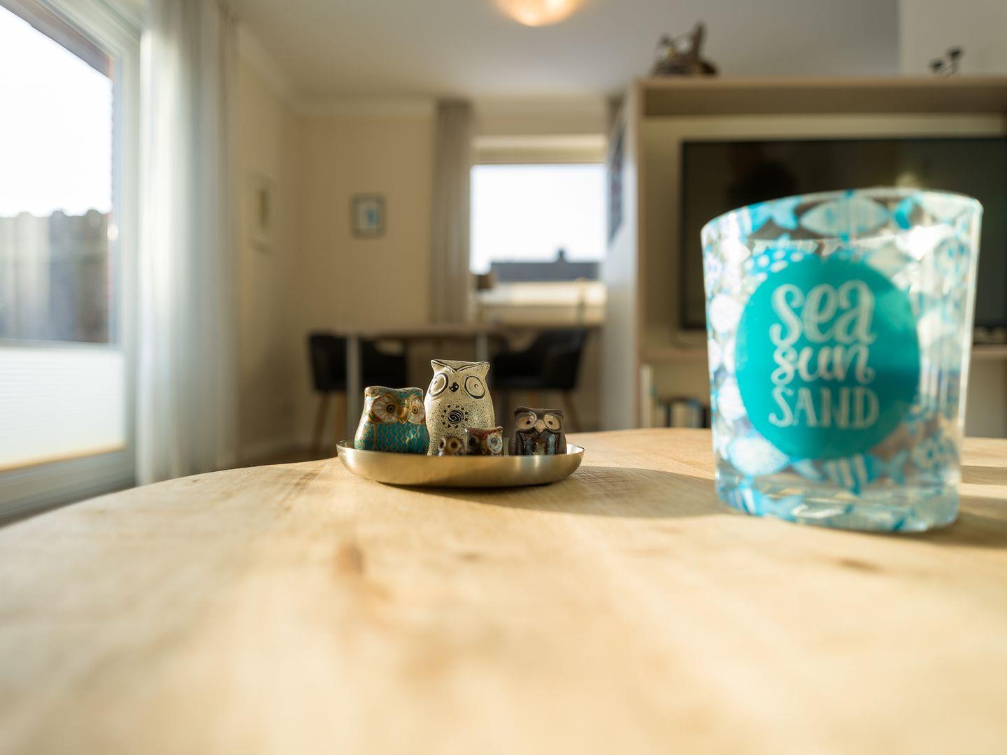 Eine tolle Raumaufteilung, helle Farben und moderne Formen sorgen im Appartement Eulennest für ganz viel Behaglichkeit. In dem offenen Wohnbereich wurde die Küche inselartig von der Sofaecke abgetrennt und auch ein kleiner Esstisch passt noch hervorragend rein. Die bodentiefen Fenster schenken schöne Aussichten auf die Südterrasse mit Strandkorb und Gartenmöbeln sowie den großen Garten. Passend zum Namen finden sich natürlich sowohl auf Bildern als auch in Accessoires zahlreiche Eulen wieder.
