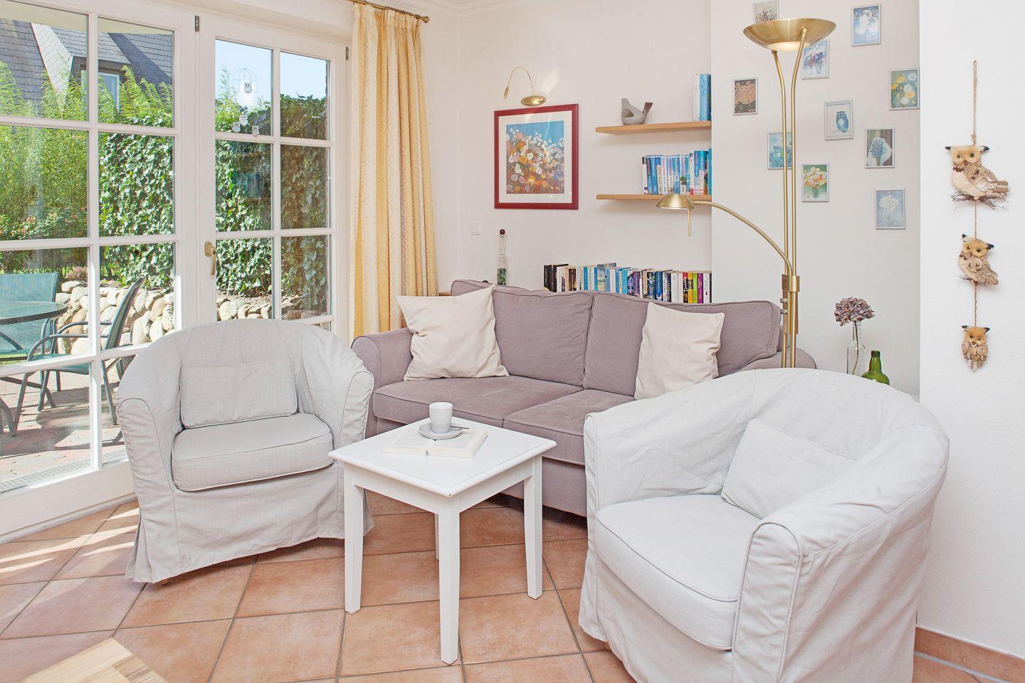 im Erdgeschoss befindet sich der helle und großzügig geschnittene Wohnbereich mit Esstisch, Couch sowie Ausgang auf die hübsche Terrasse (Süden). Die kleine Küche ist bestens ausgestattet und lädt zum Kochen ein. Ebenfalls im Erdgeschoss befindet sich auch eins der beiden Duschbäder. Im Souterrain gibt es zwei Schlafzimmer mit einem Doppel- bzw. zwei Einzelbetten sowie noch ein weiteres Duschbad.