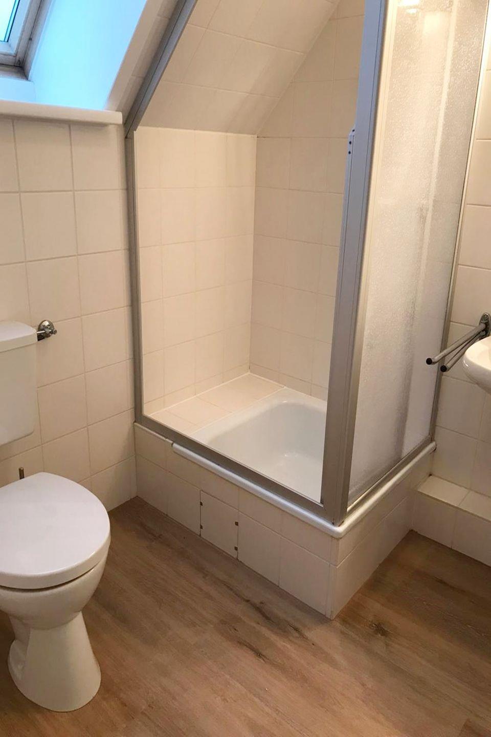 Im oberen Bereich befindet sich das ruhige Schlafzimmer mit Doppelbett. Auch hier erwartet Sie ein besonderes Highlight: Schon beim Aufwachen können Sie durch das Fenster direkt auf die Nordsee blicken. Ein weiterer Fernseher sowie ausreichend Stauraum sorgen für zusätzlichen Komfort. Das gepflegte Duschbad rundet die Ausstattung der Wohnung ab.