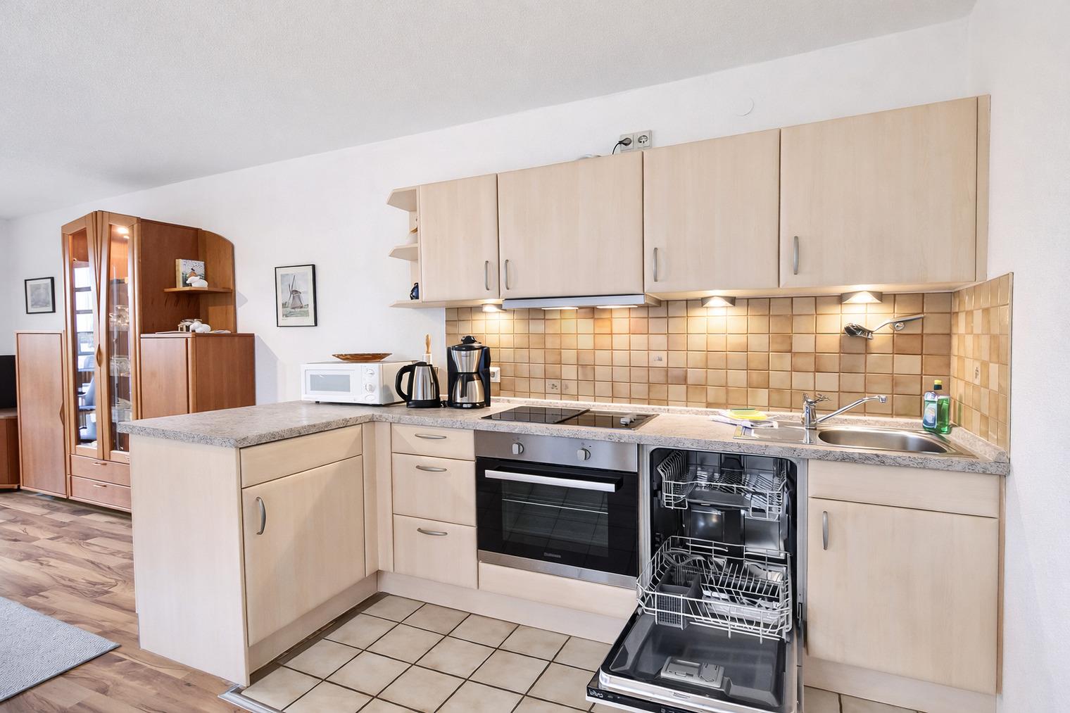 Die Wohnung befindet sich im 1. Obergeschoss und verfügt über einen Balkon, eine offene Wohnküche mit Mikrowelle, Backofen, Geschirrspüler, Wasserkocher, Kaffeemaschine.