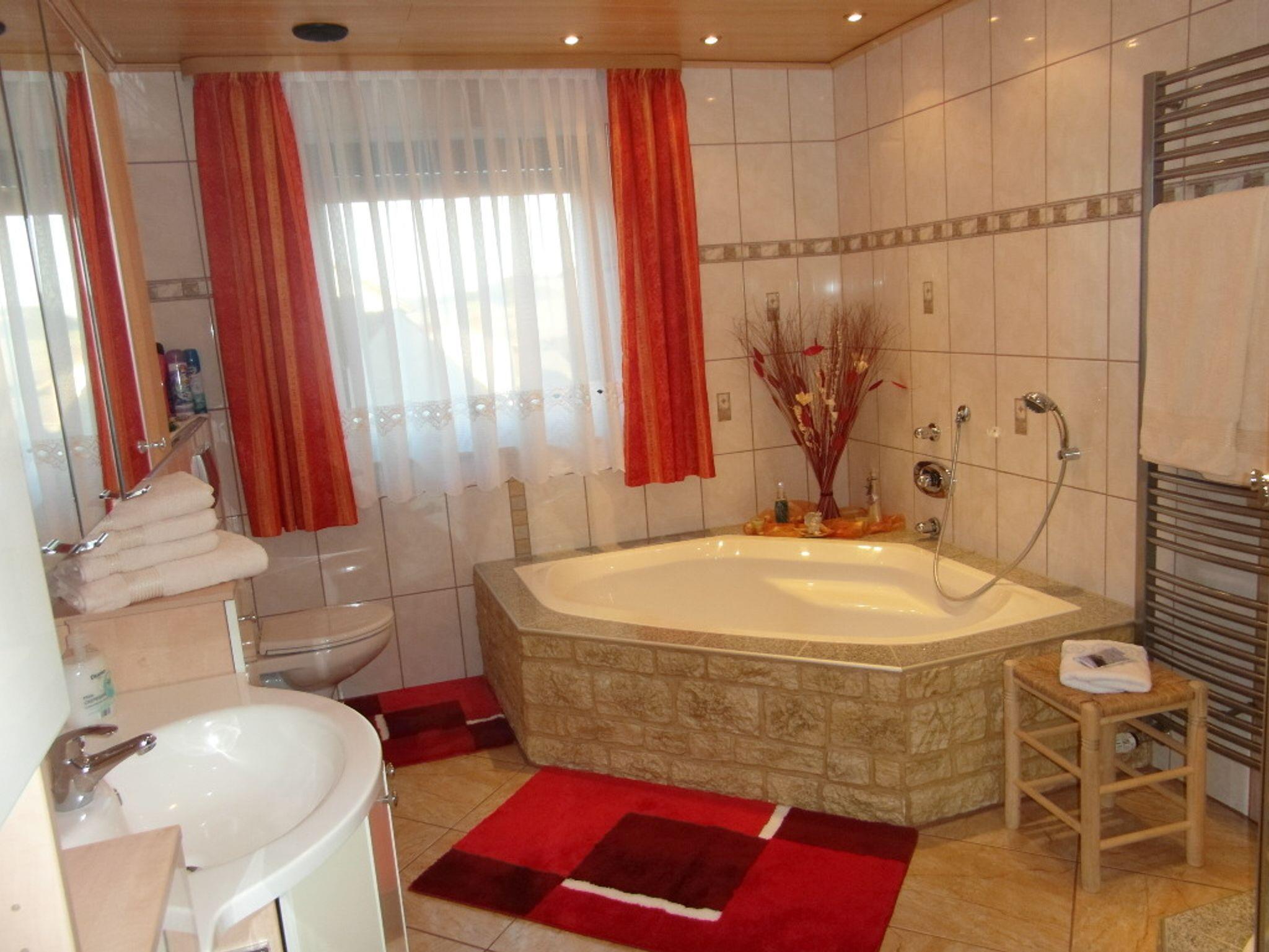 Das großzügige Bad mit Badewanne, Dusche und WC, dimmbaren Licht, Frisur-und Kosmetikspiegel, Fön, Waschmaschine,