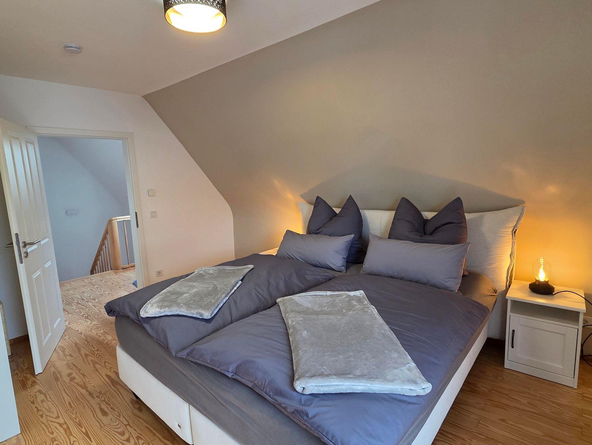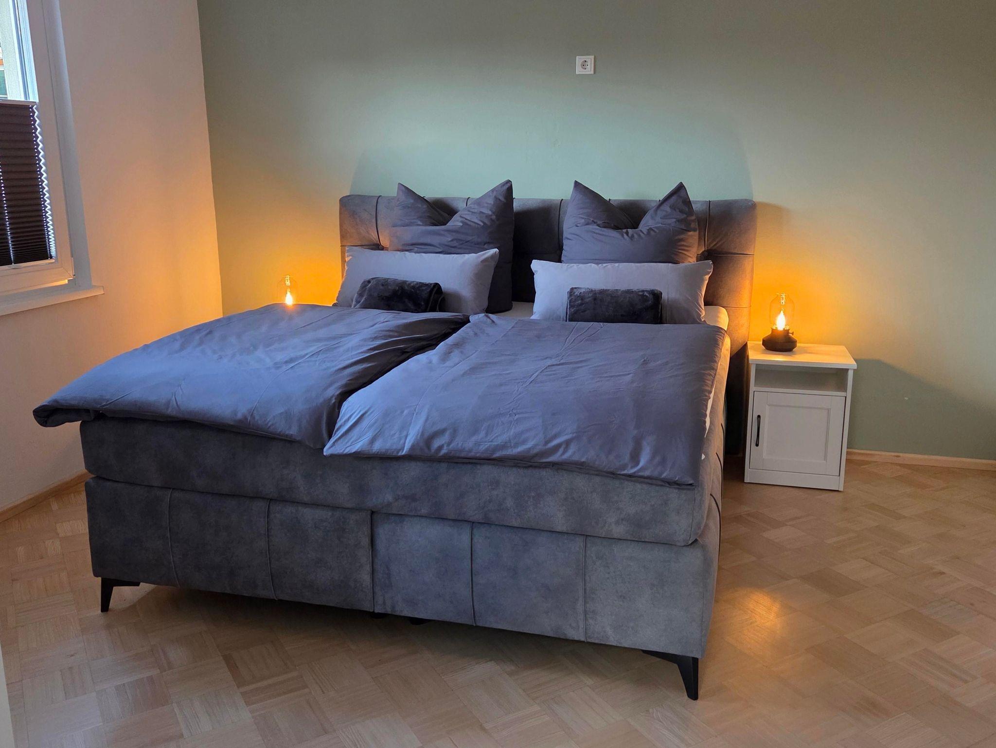 Die Schlafzimmer sind mit komfortablen Boxspringbetten ausgestattet. Bettwäsche und Handtücher sind vorhanden.