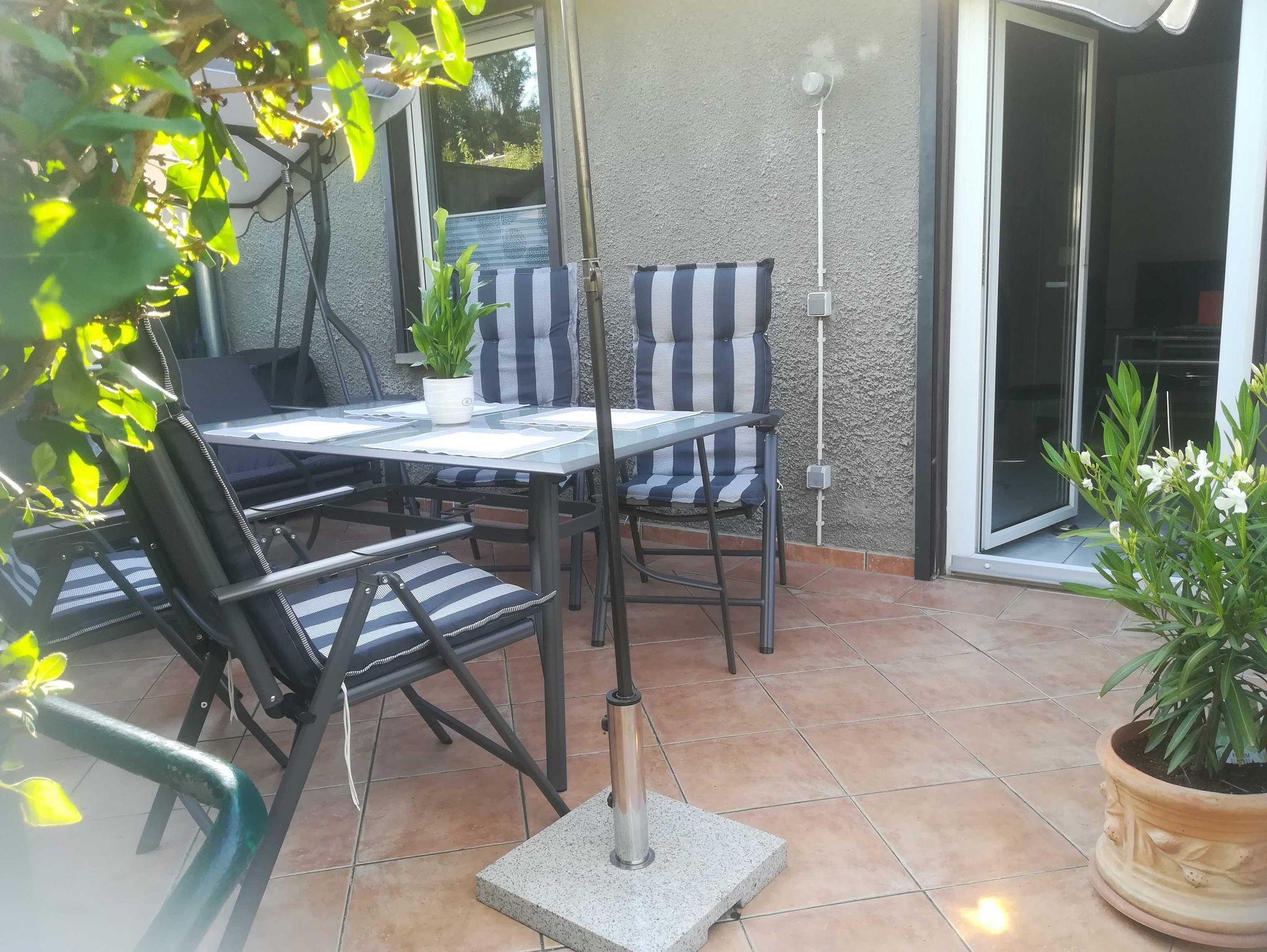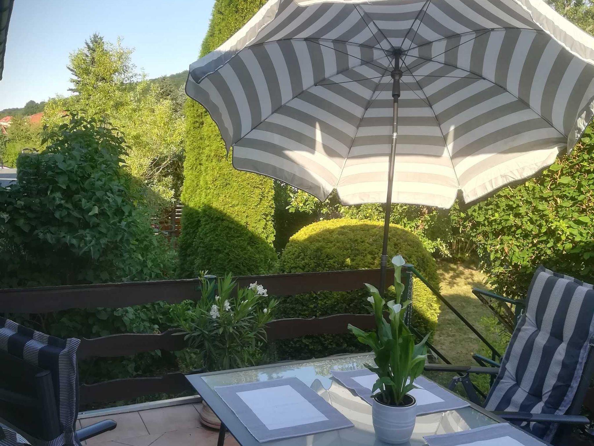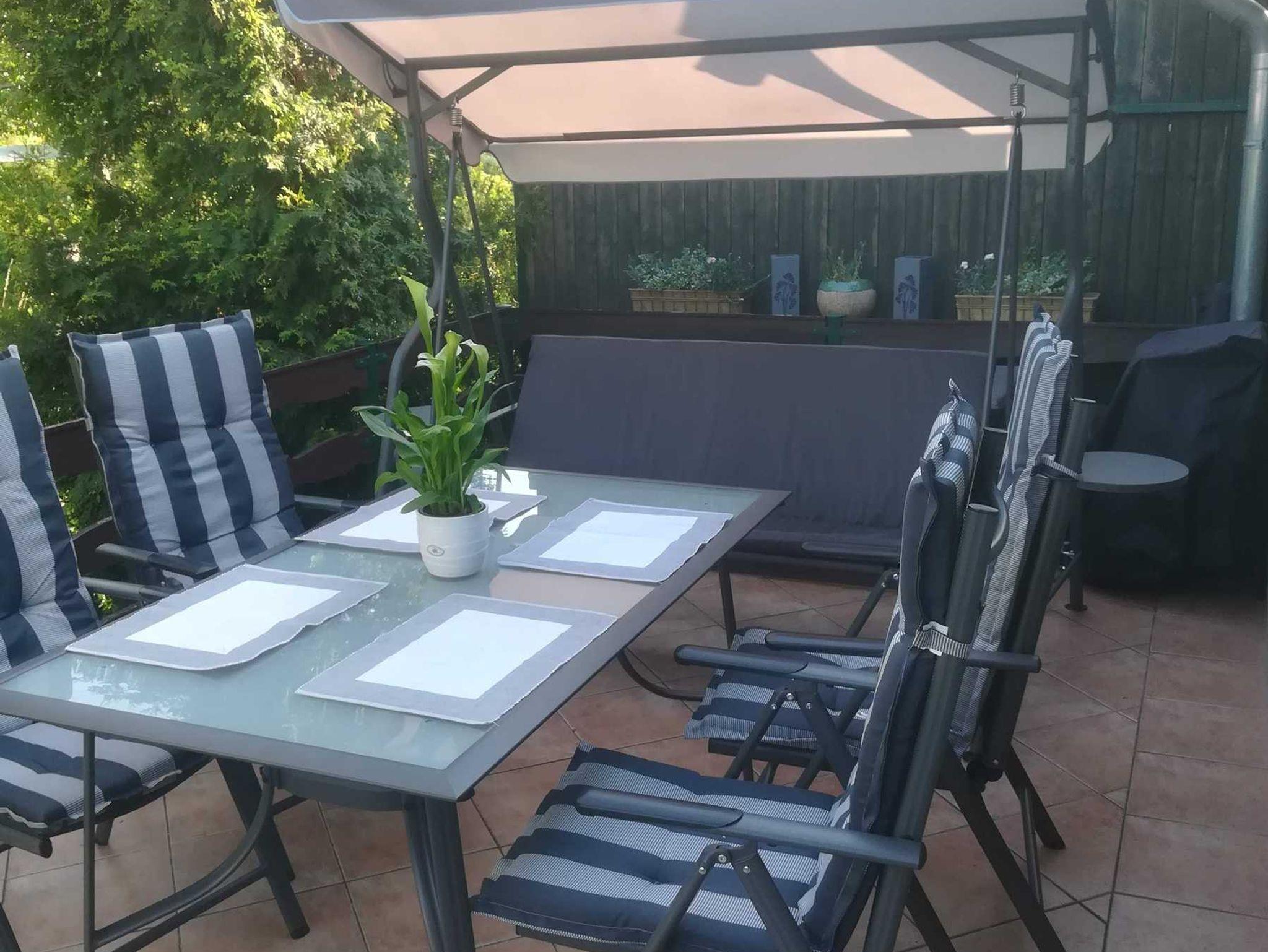 Auf der Terrasse mit Aussicht in den Garten, Tisch und Stühlen mit modernen Auflagen,einer gemütlichen Hollywoodschaukel, Sonnenschirm, Blumen und dezenter Beleuchtung können sie beim Frühstück den Tag beginnen oder einen erholsamen Abend genießen.