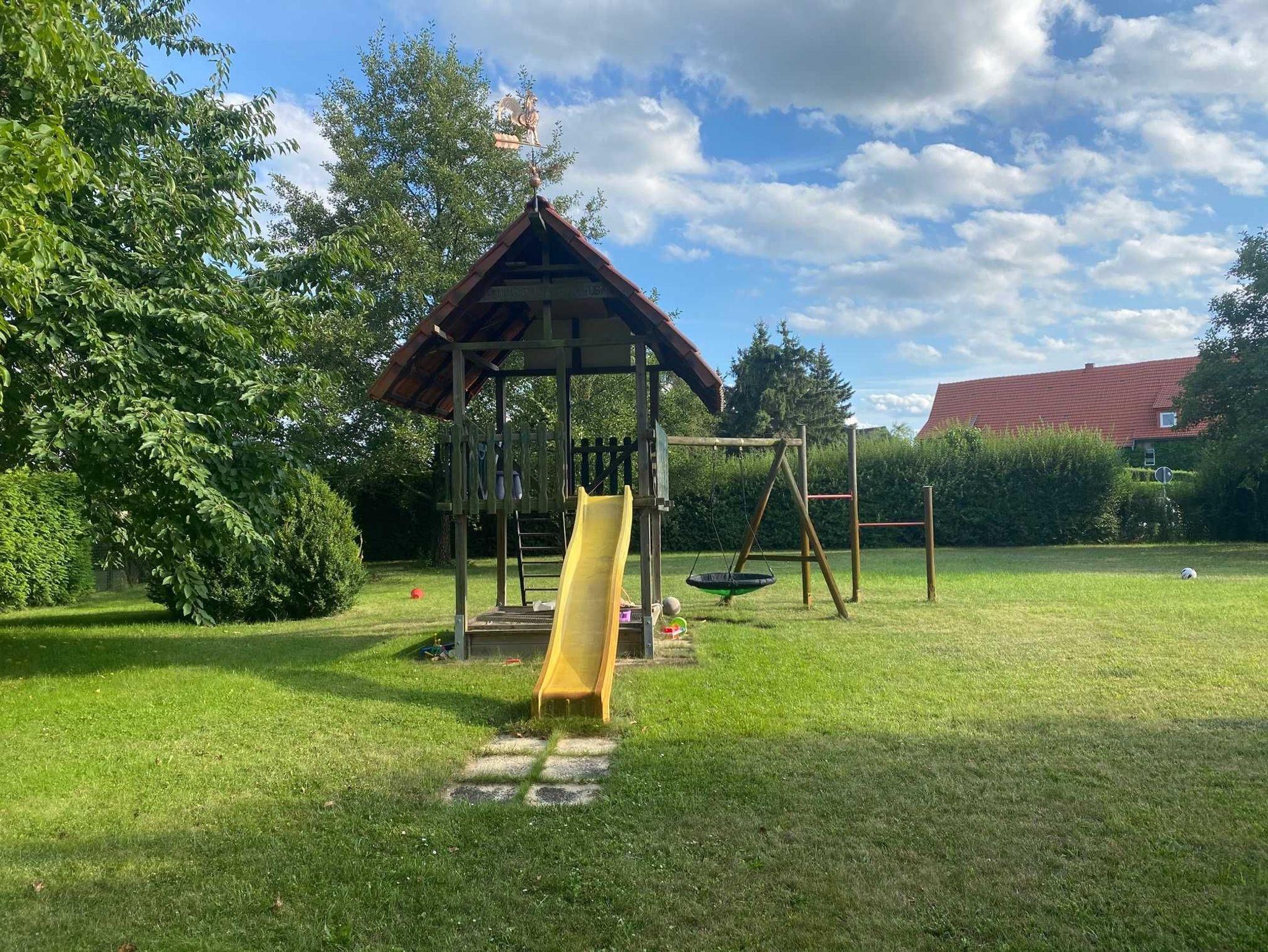 Unsere Ferienwohnung ist baby-und kleinkindgerecht ausgestattet. Überall befindet sich Steckerschutz, ein Treppengitter verhindert das Stürzen. Bei Bedarf kann auch ein Kinderreisebett mit extra Matratze gestellt werden. Ein Hochstuhl, etwas Spielzeug(Spiele für die Großen und Kleinen), Wickelauflage, Toilettensitz, Schemel sind vorhanden. Auf unserem Grundstück gibt es einen kleinen Spielplatz mit Schaukel, Rutsche und Sandkasten. Dieser kann gerne mit genutzt werden.