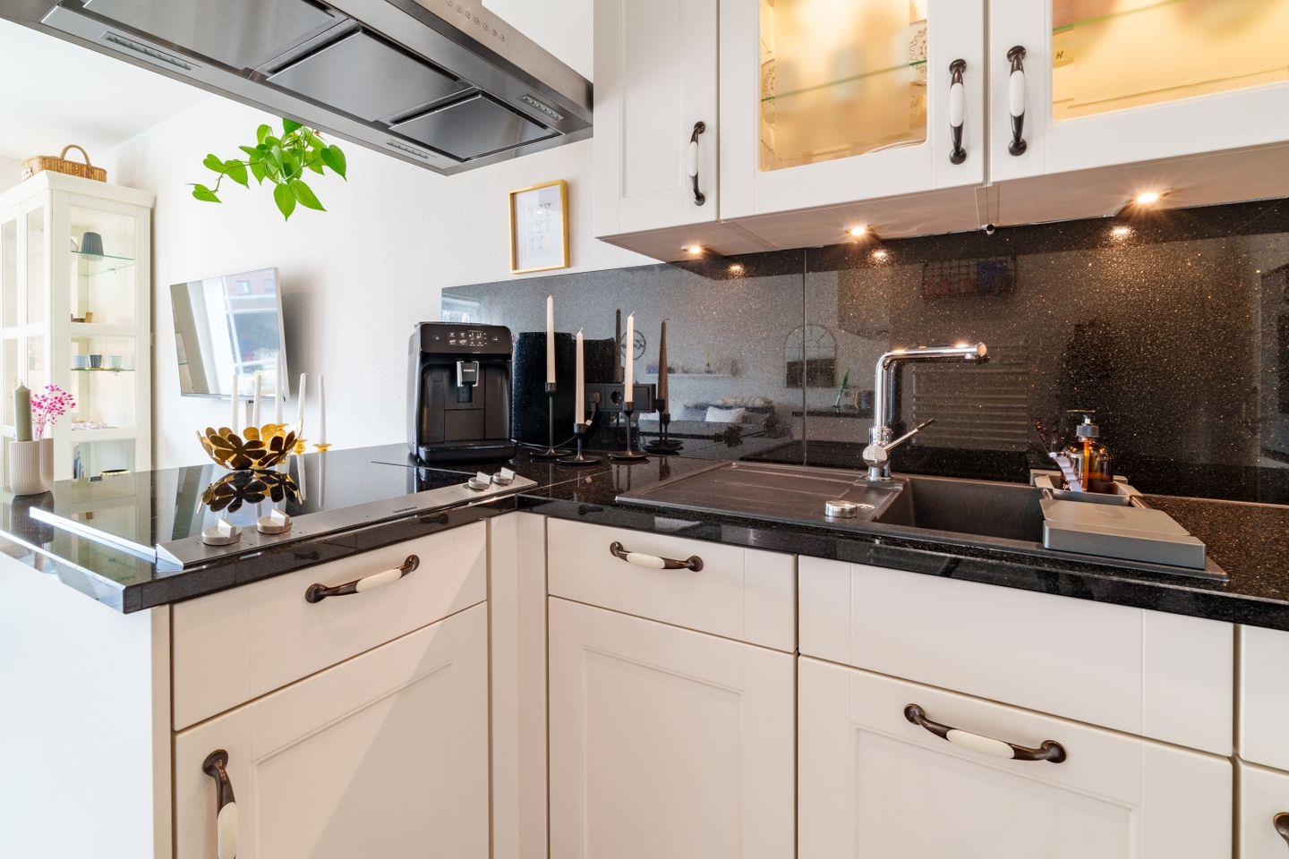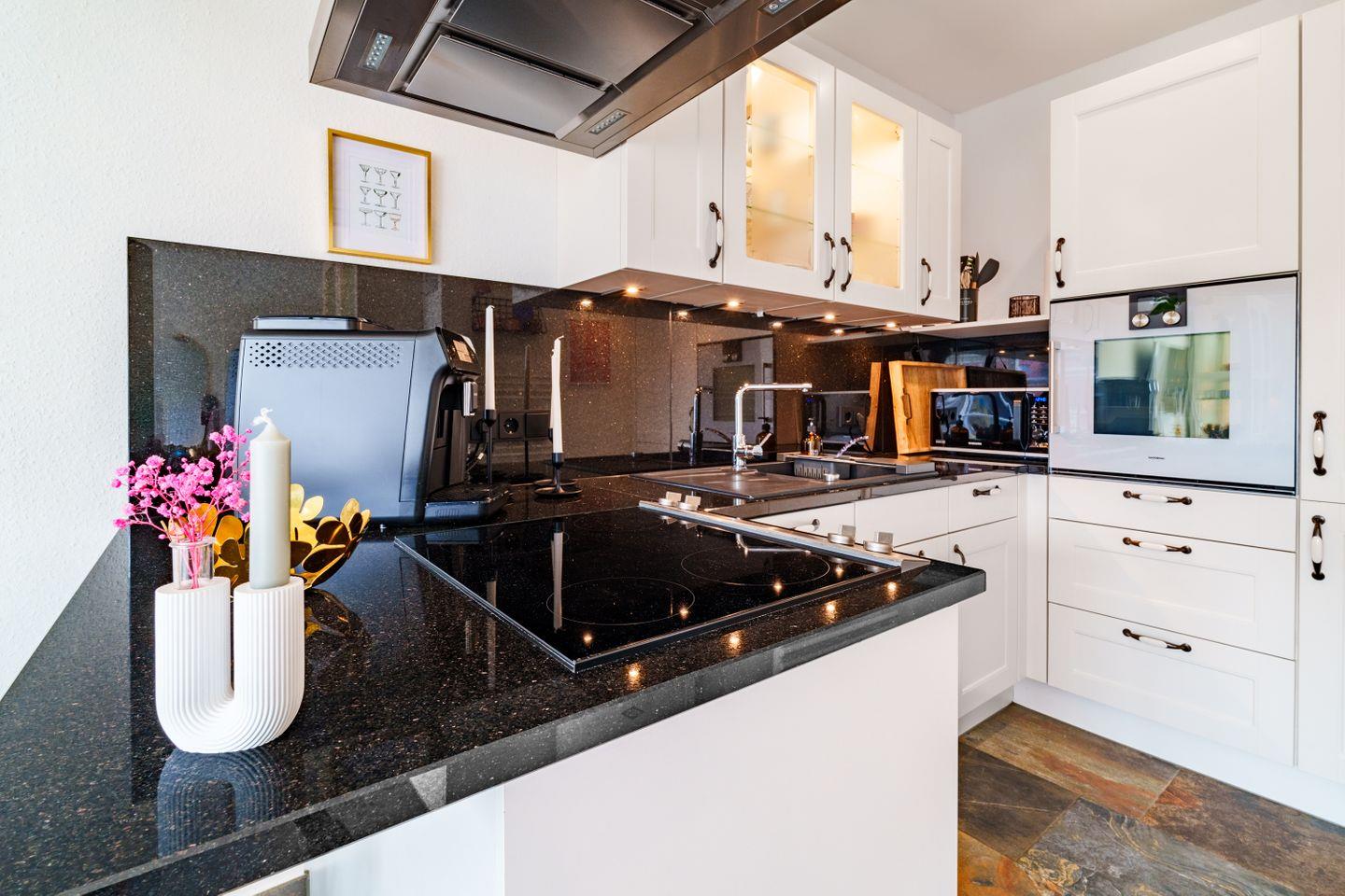 Voll ausgestattete Einbauküche mit hochwertigem Geschirr und Markengeräten, Geschirrspüler, Waschmaschine, Mikrowelle, Backofen, Ceranfeld, Kühlschrank mit Gefrierfach, Toaster, Wasserkocher, Kaffeevollautomat mit Bohnenmahlwerk, Filterkaffeemaschine, Waschmaschine