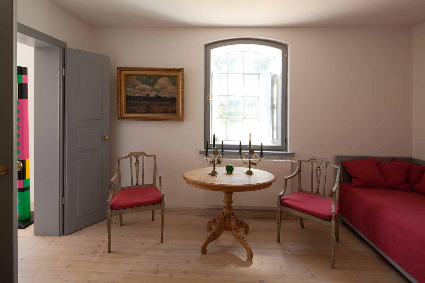Die Terrasse ist eingebettet in einen gepflegten Garten mit altem Baumbestand, Wiesen und Feldern. Der Blick geht ins Grüne – nicht auf eine Straße. Ob Kaffee am Morgen, ein Glas Wein zum Sonnenuntergang oder eine ruhige Lesestunde: Dieser Außenbereich macht den Aufenthalt besonders.