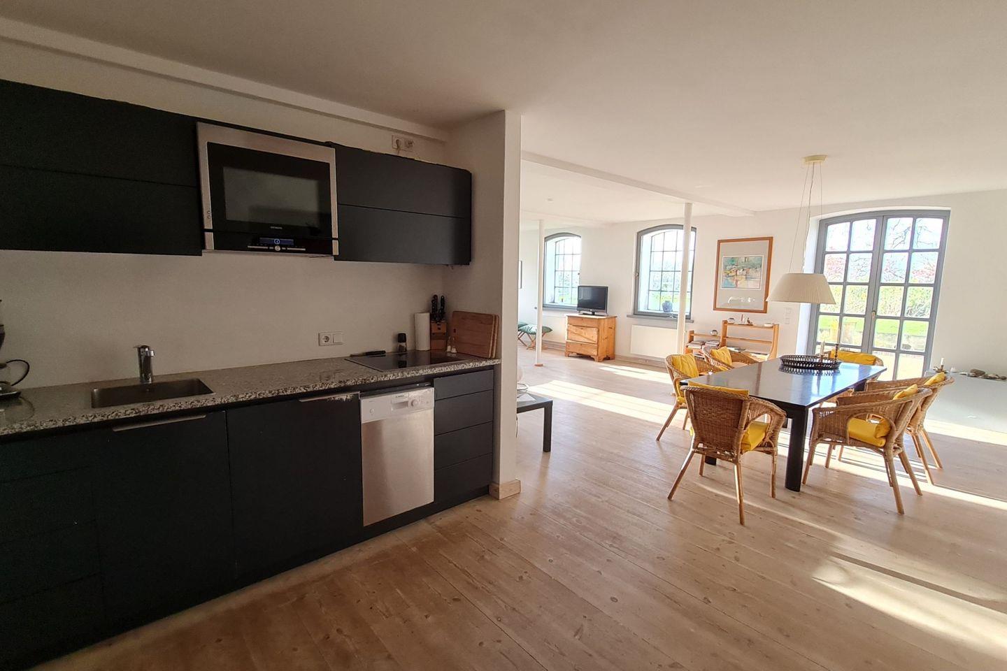 Die voll ausgestattete Pantryküche bietet alles, was Sie für Ihren Urlaub benötigen: Geschirrspüler, Kühlschrank, Kochfeld und Backofen. So können Sie ganz entspannt kochen, ohne Kompromisse bei der Ausstattung.