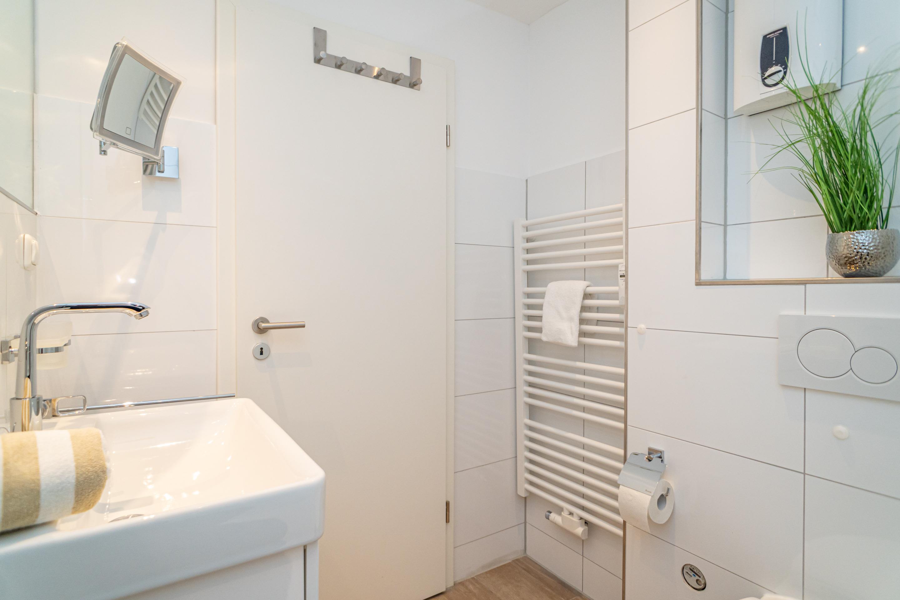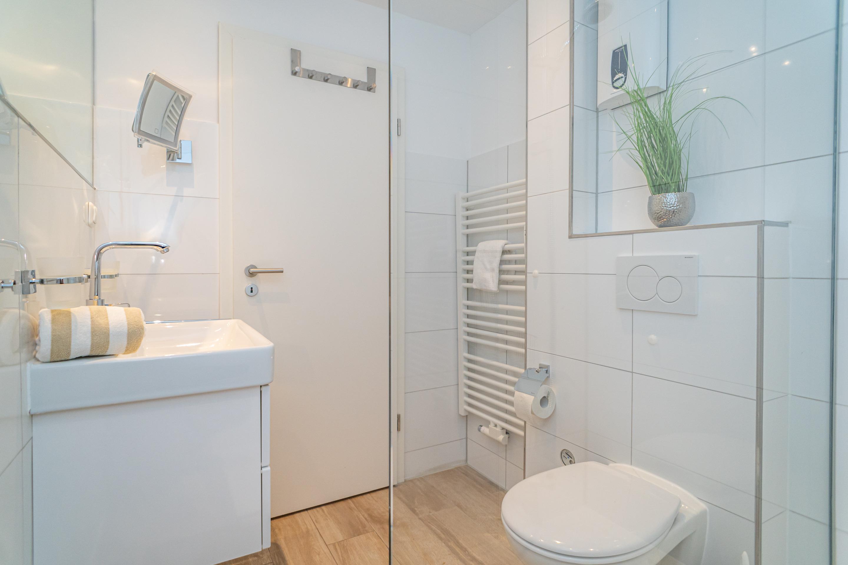 Im Schlafzimmer befindet sich ein Boxspringbett (1,60 x 2,00 m, mit durchgehender Matratze). Im Bad befinden sich Dusche, WC und ein Waschtisch.
