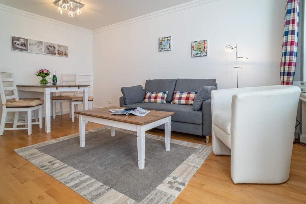 Vom Vorflur erreichen Sie das gemütliche Wohnzimmer mit Schlafcouch (Liegefläche ausgeklappt: 1,60 x 2,00 m), Essplatz, Kabel-Flachbild-TV und WLAN mit direktem Zugang zur Westloggia (Nachmittagssonne, Balkonmöbel inkl. Auflagen).