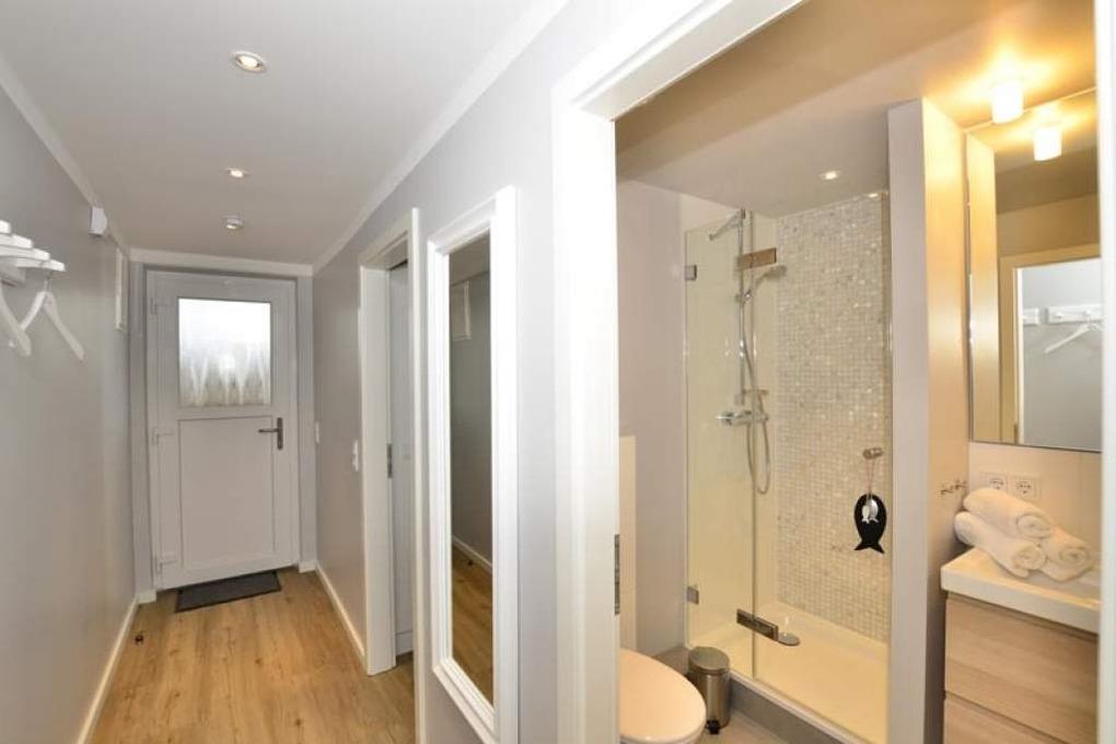 Der aufwendig und modern gestaltete Wohnraum ist mit einer guten Sitzgarnitur (eine Zweisitzer- und eine Dreisitzer-Couch), einem Doppelschrankbett, einem Essplatz, großem Flachbild-TV und offener Küche ausgestattet.