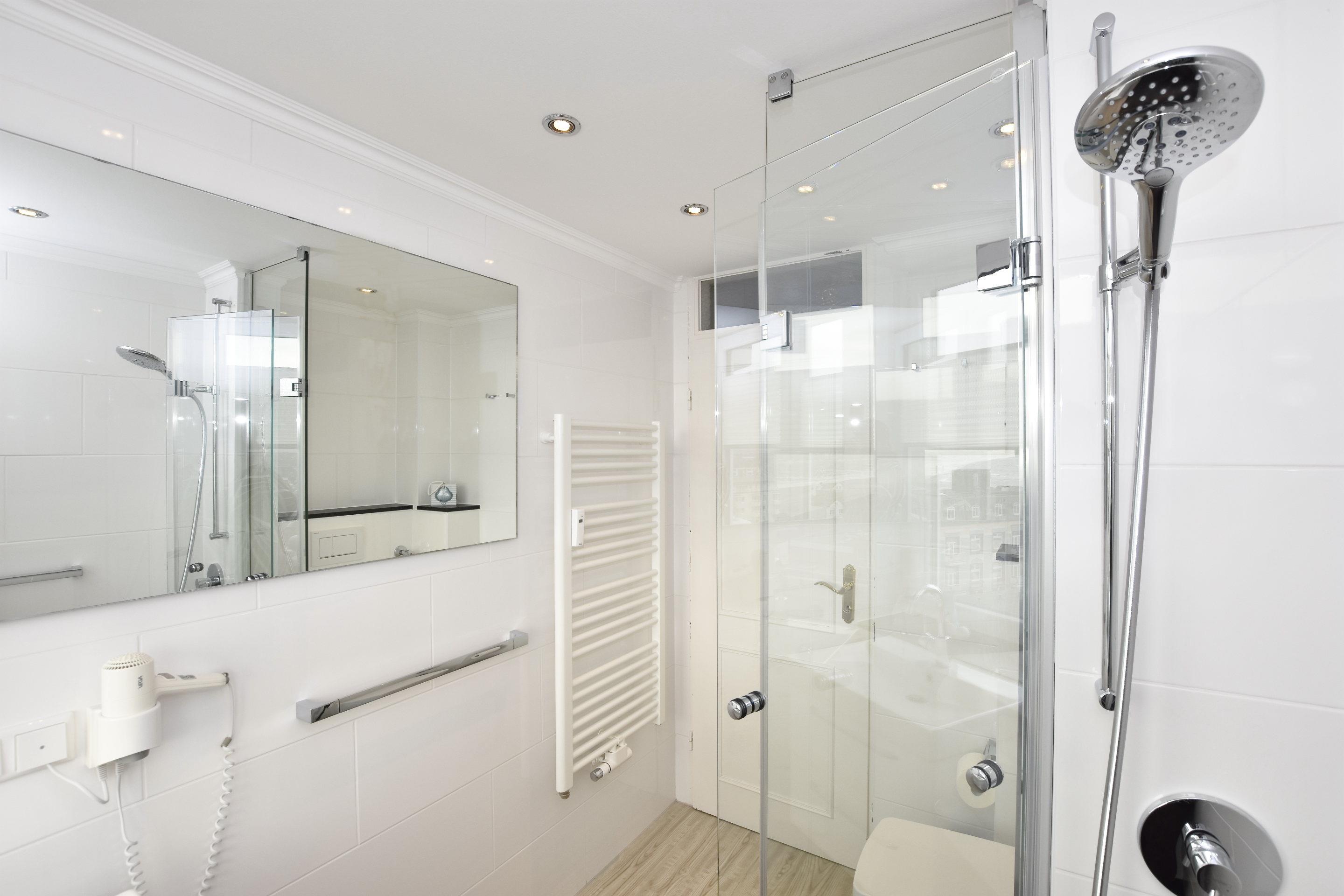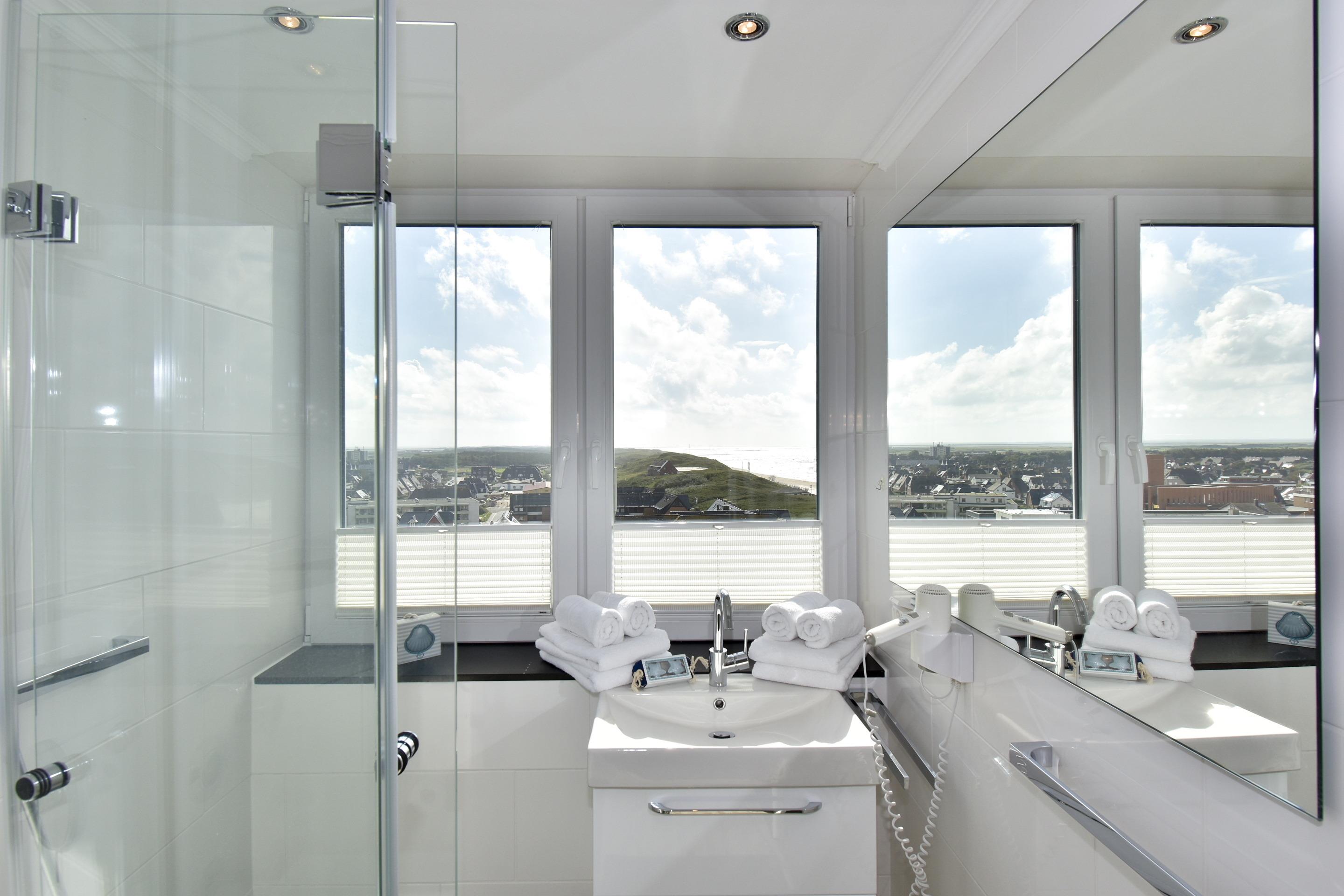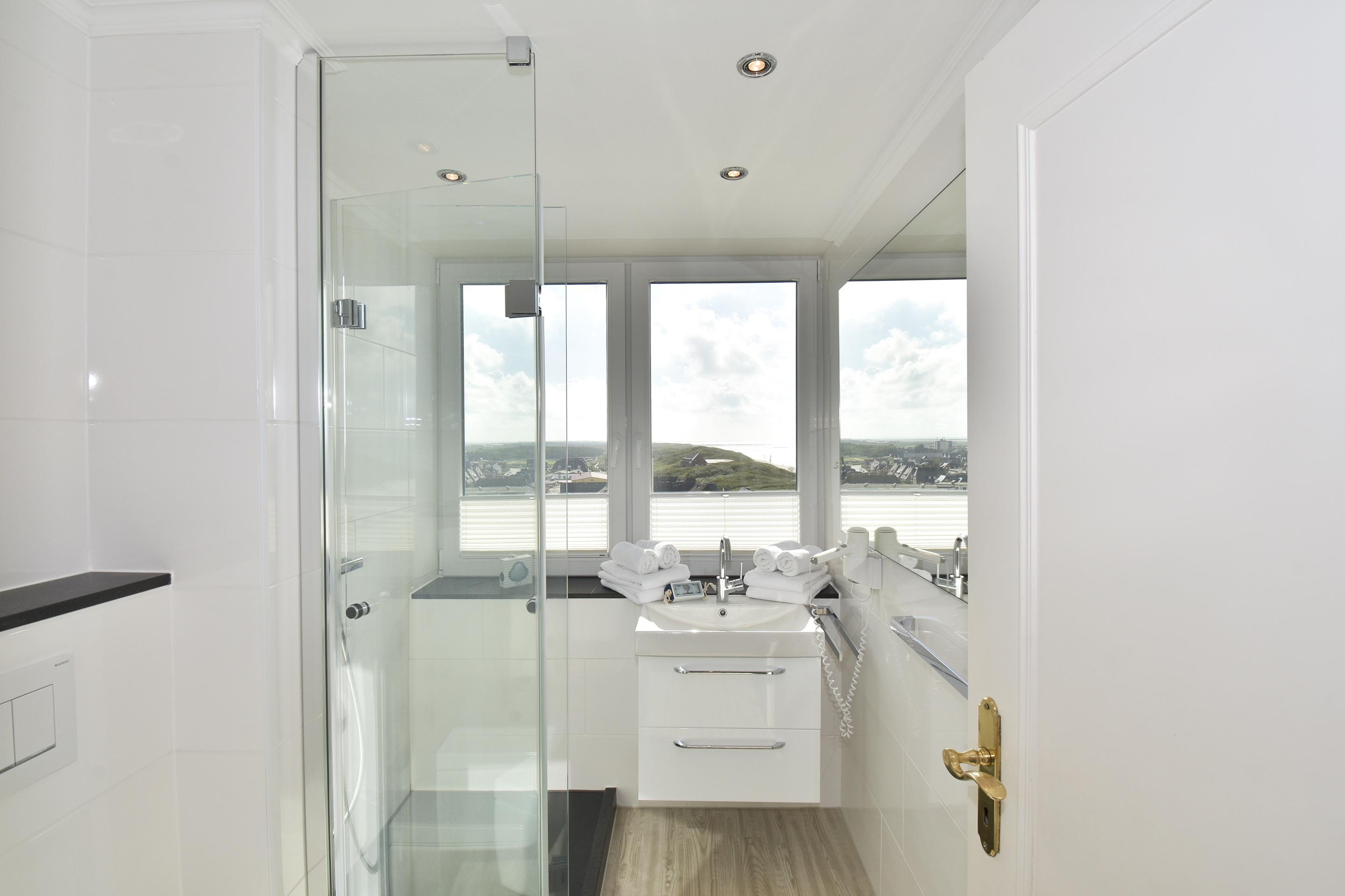 Das neu gestaltete Badezimmer ist ein weiteres Highlight. Schwarzer Granitboden in der Dusche, extraflacher Einstieg, eleganter Waschtisch, WC, Handtuchtrockner und fest installierter Föhn – alles durchdacht und stilvoll. Und als besonderes Detail: Auch von hier aus genießen Sie den Blick über die Sylter Dünenlandschaft!