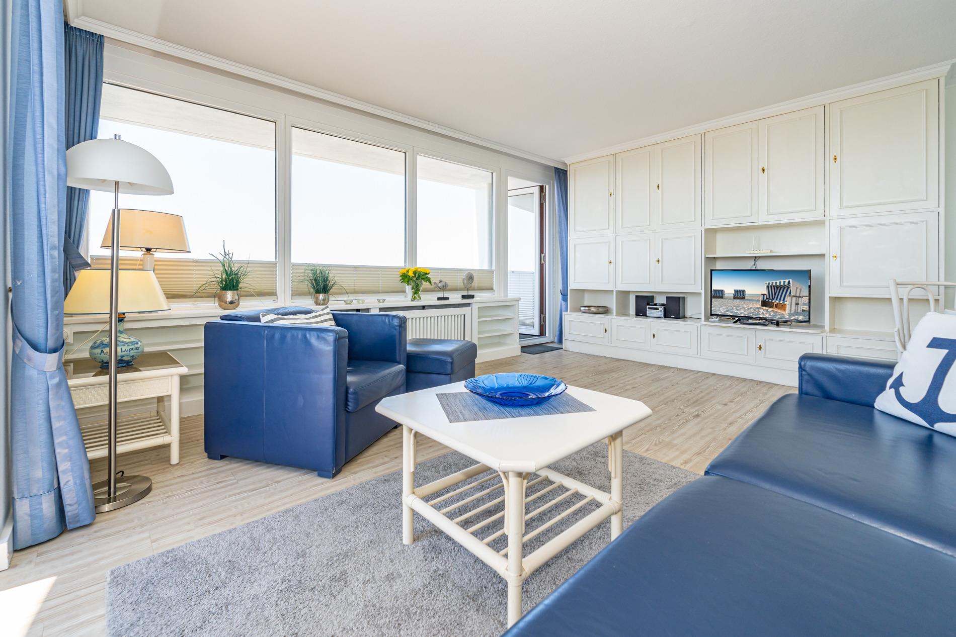 Der stilvoll eingerichtete Wohnbereich besticht durch eine hochwertige Sitzgarnitur mit ausziehbarem Doppelschlafsofa (Liegefläche 1,60 x 2,00?m, mit durchgehender Matratze in angenehmer Höhe) sowie einem komfortablen Sessel mit Fußhocker der Bielefelder Werkstätten. Eine separate Essecke, ein Flachbild-Kabel-TV, eine HiFi-Anlage und ein DVD-Player sorgen für entspannte Abende mit Ausblick auf Meer und Sonnenuntergang.