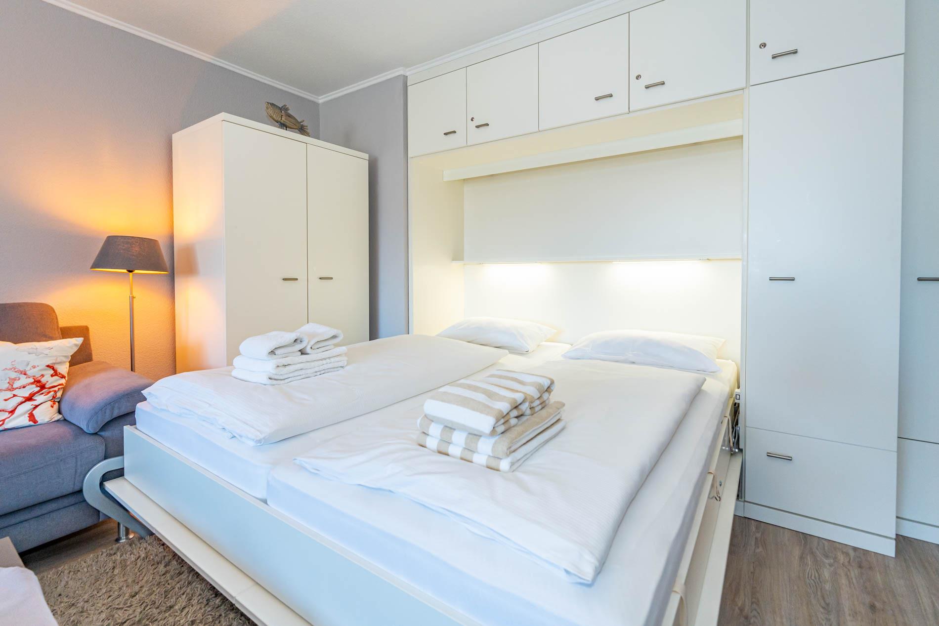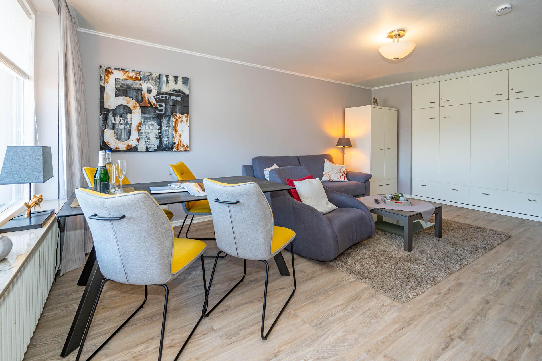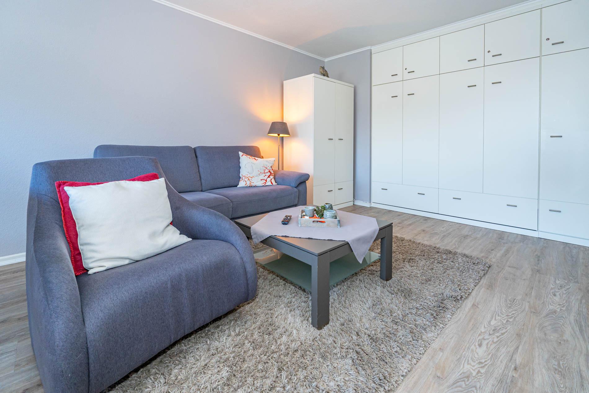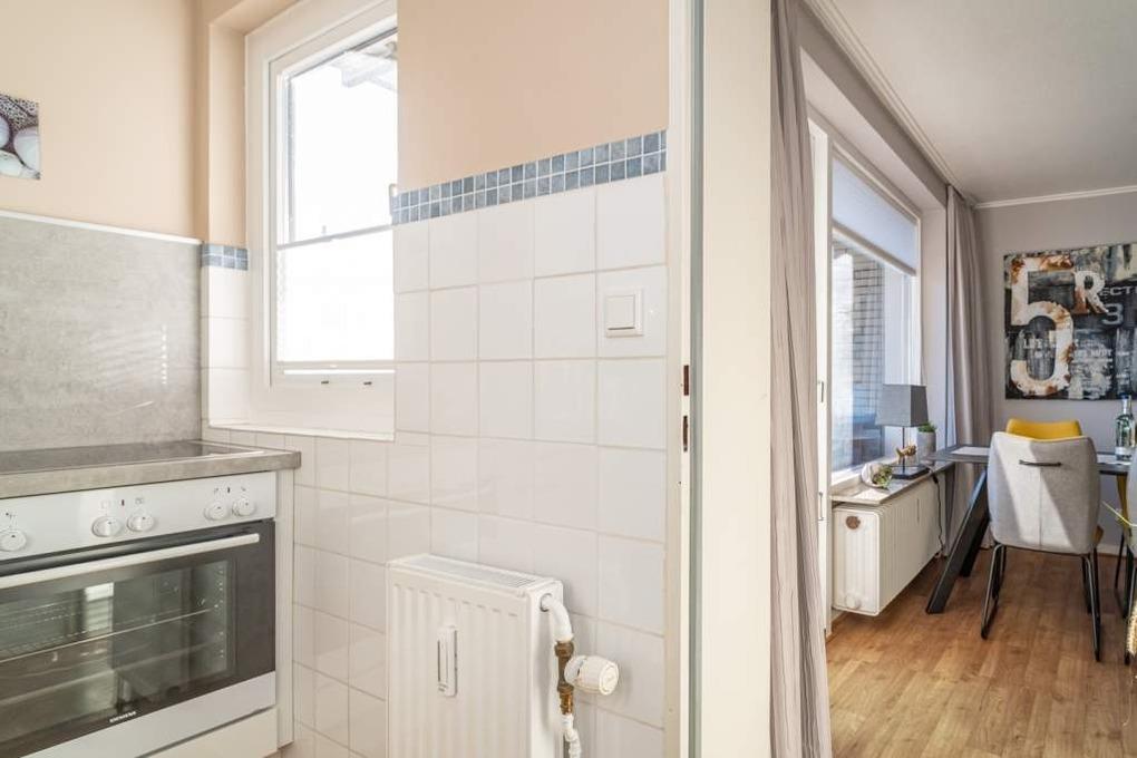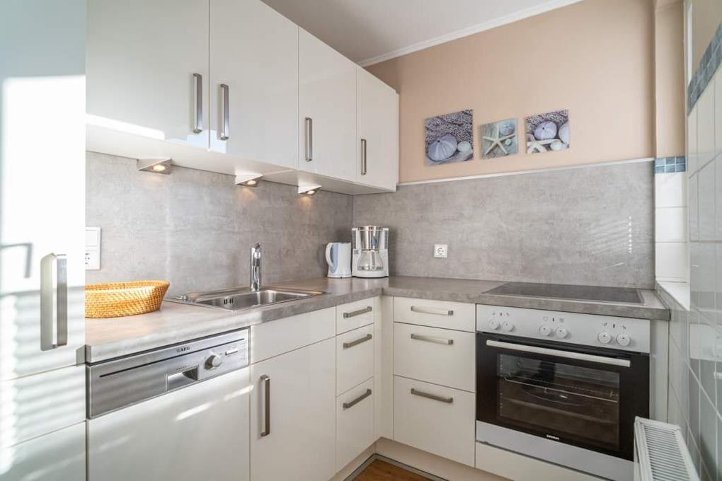 Diese moderne 2-Zimmer-Nichtraucher-Ferienwohnung (ca. 58 qm) in der 2. Etage bietet komfortablen Wohnraum für bis zu 4 Personen. Im Schlafzimmer erwartet Sie ein gemütliches Doppelbett, bestehend aus zwei Einzelmatratzen (je 0,90 x 2,00 m), ergänzt durch stilvolle Nachttische und einen eleganten Sessel in Loom-Ausführung. Das Wohnzimmer überzeugt mit Doppelschrankbetten (je mit Einzelmatratzen von 1,70 x 0,90 m), einem Sat-Flachbild-TV, Telefon und WLAN – ideal für flexible Schlafmöglichkeiten und entspannte Abende. Die offene Küche, die ohne trennende Tür direkt in den Wohnbereich integriert ist und über ein Fenster verfügt, lässt keine Wünsche offen: Ausgestattet mit Backofen, Cerankochfeld, Kühlschrank mit Eisfach, Geschirrspüler, Kaffeemaschine, Wasserkocher und Toaster, bietet sie alles, was Sie für die Zubereitung Ihrer Lieblingsgerichte benötigen. Das moderne Duschbad/WC rundet das Raumkonzept ab.