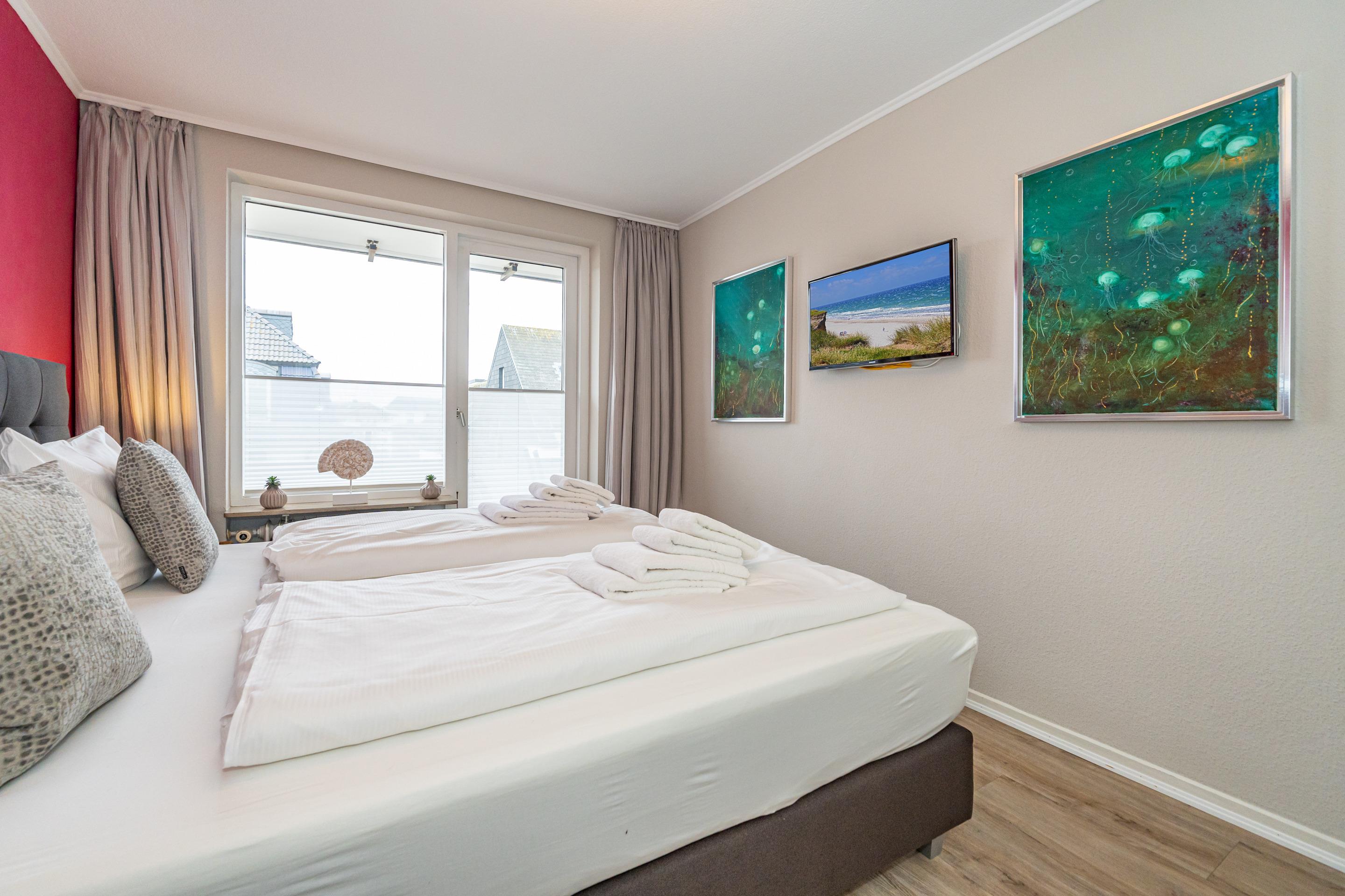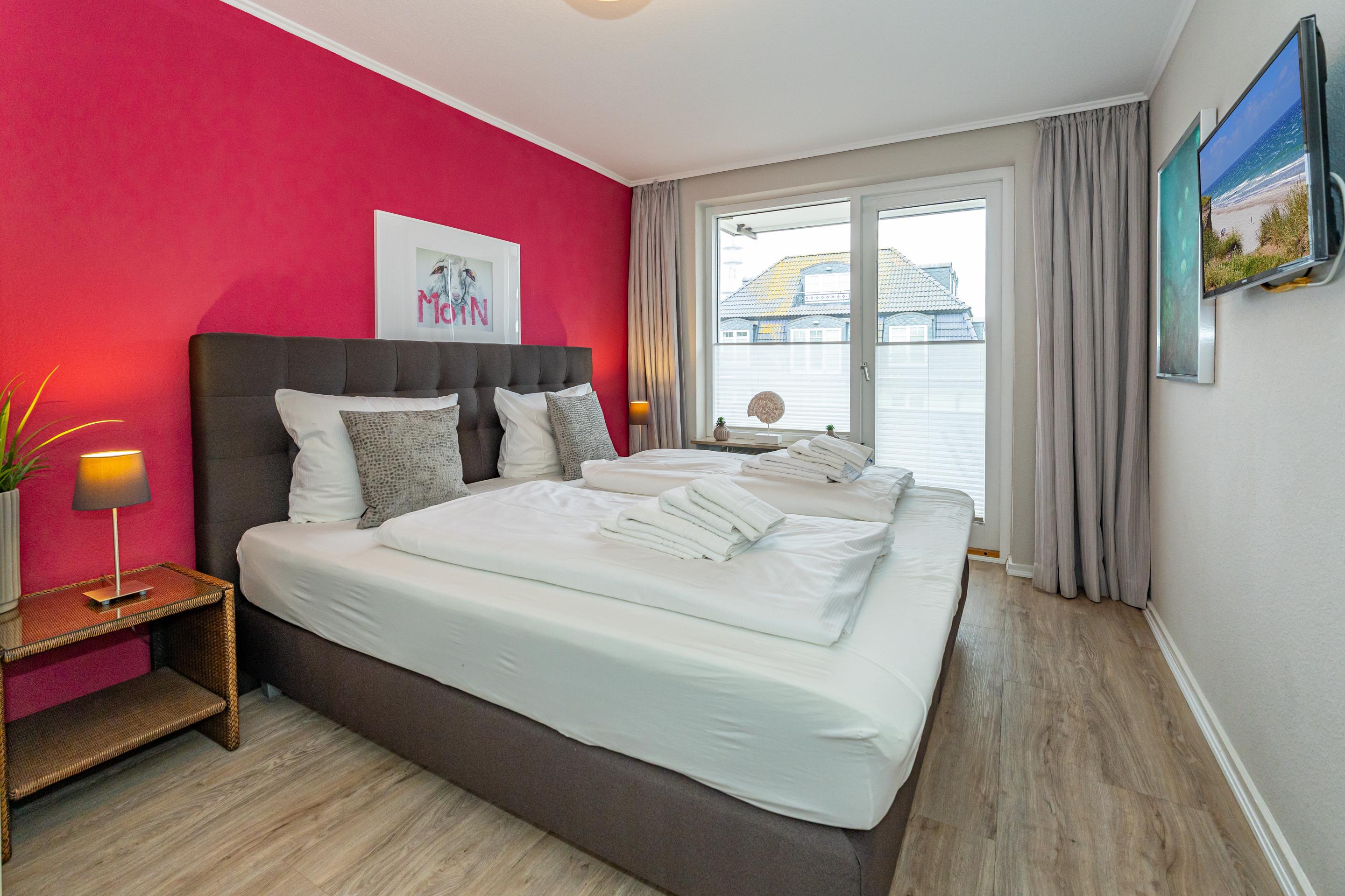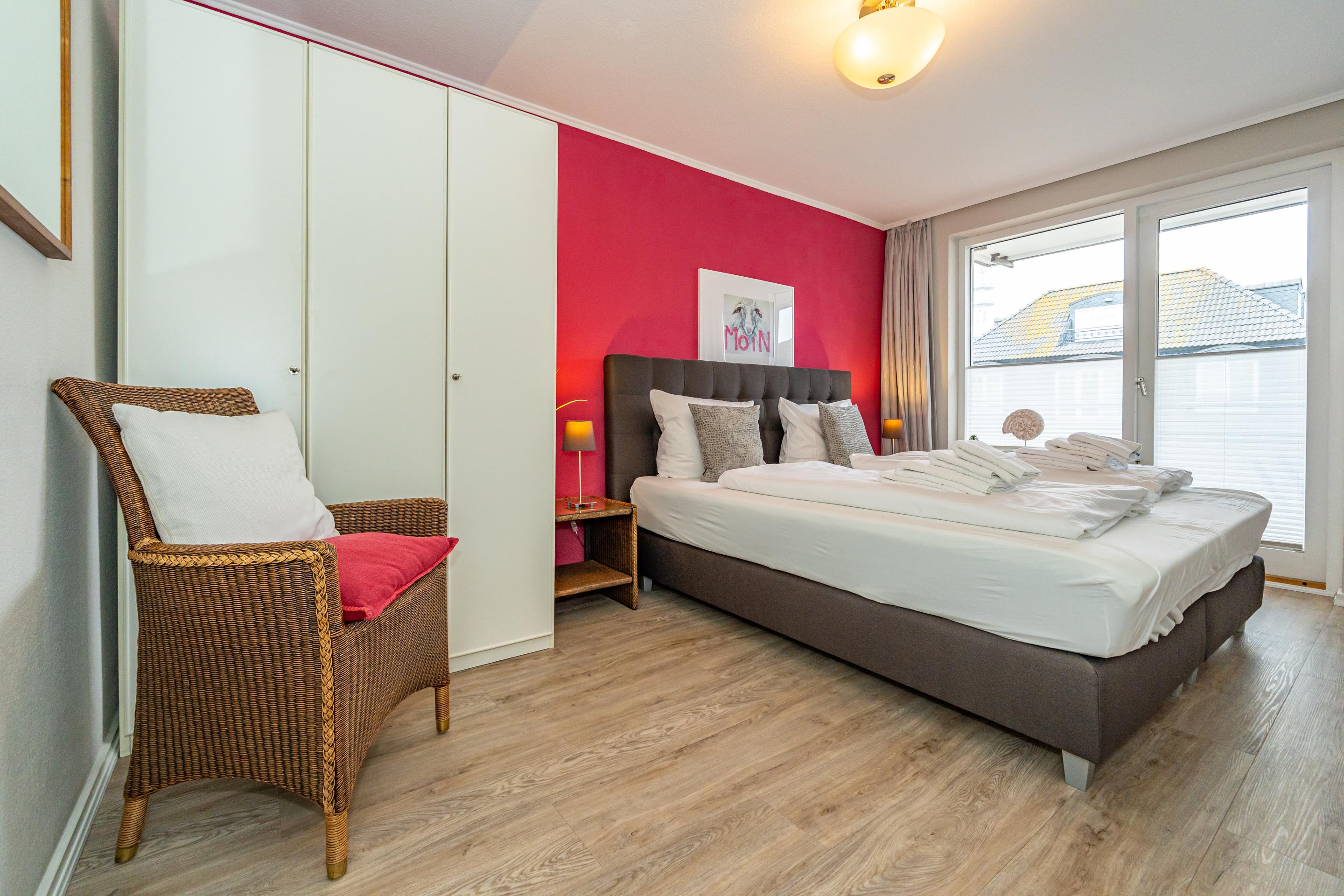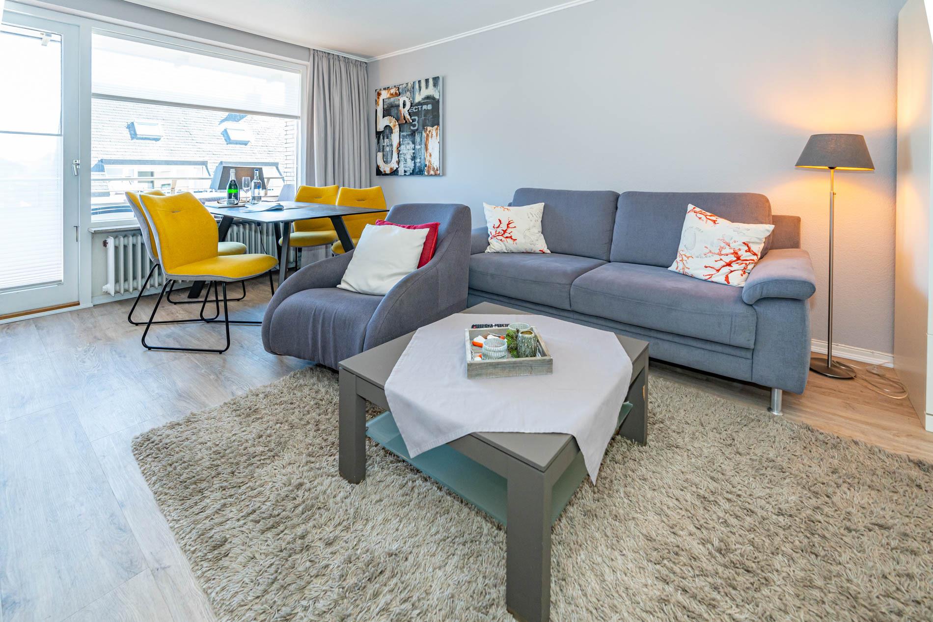 Diese moderne 2-Zimmer-Nichtraucher-Ferienwohnung (ca. 58 qm) in der 2. Etage bietet komfortablen Wohnraum für bis zu 4 Personen. Im Schlafzimmer erwartet Sie ein gemütliches Doppelbett, bestehend aus zwei Einzelmatratzen (je 0,90 x 2,00 m), ergänzt durch stilvolle Nachttische und einen eleganten Sessel in Loom-Ausführung. Das Wohnzimmer überzeugt mit Doppelschrankbetten (je mit Einzelmatratzen von 1,70 x 0,90 m), einem Sat-Flachbild-TV, Telefon und WLAN – ideal für flexible Schlafmöglichkeiten und entspannte Abende. Die offene Küche, die ohne trennende Tür direkt in den Wohnbereich integriert ist und über ein Fenster verfügt, lässt keine Wünsche offen: Ausgestattet mit Backofen, Cerankochfeld, Kühlschrank mit Eisfach, Geschirrspüler, Kaffeemaschine, Wasserkocher und Toaster, bietet sie alles, was Sie für die Zubereitung Ihrer Lieblingsgerichte benötigen. Das moderne Duschbad/WC rundet das Raumkonzept ab.