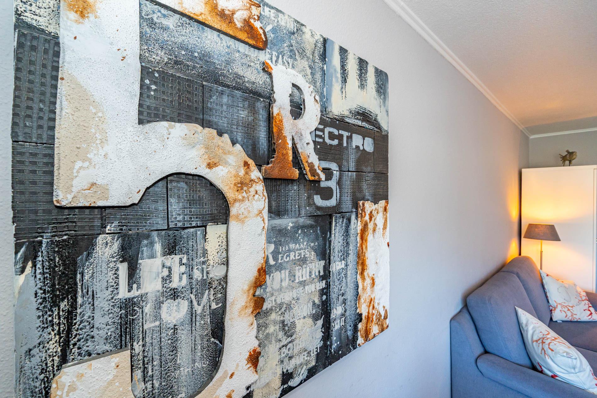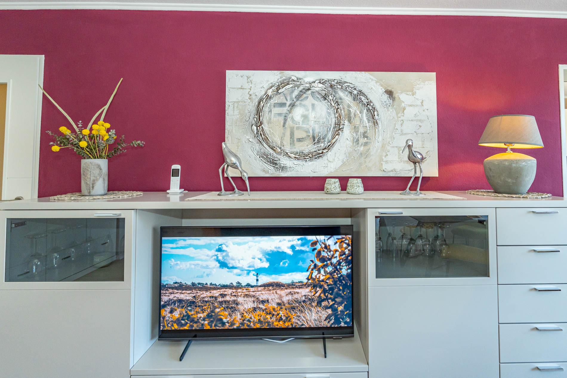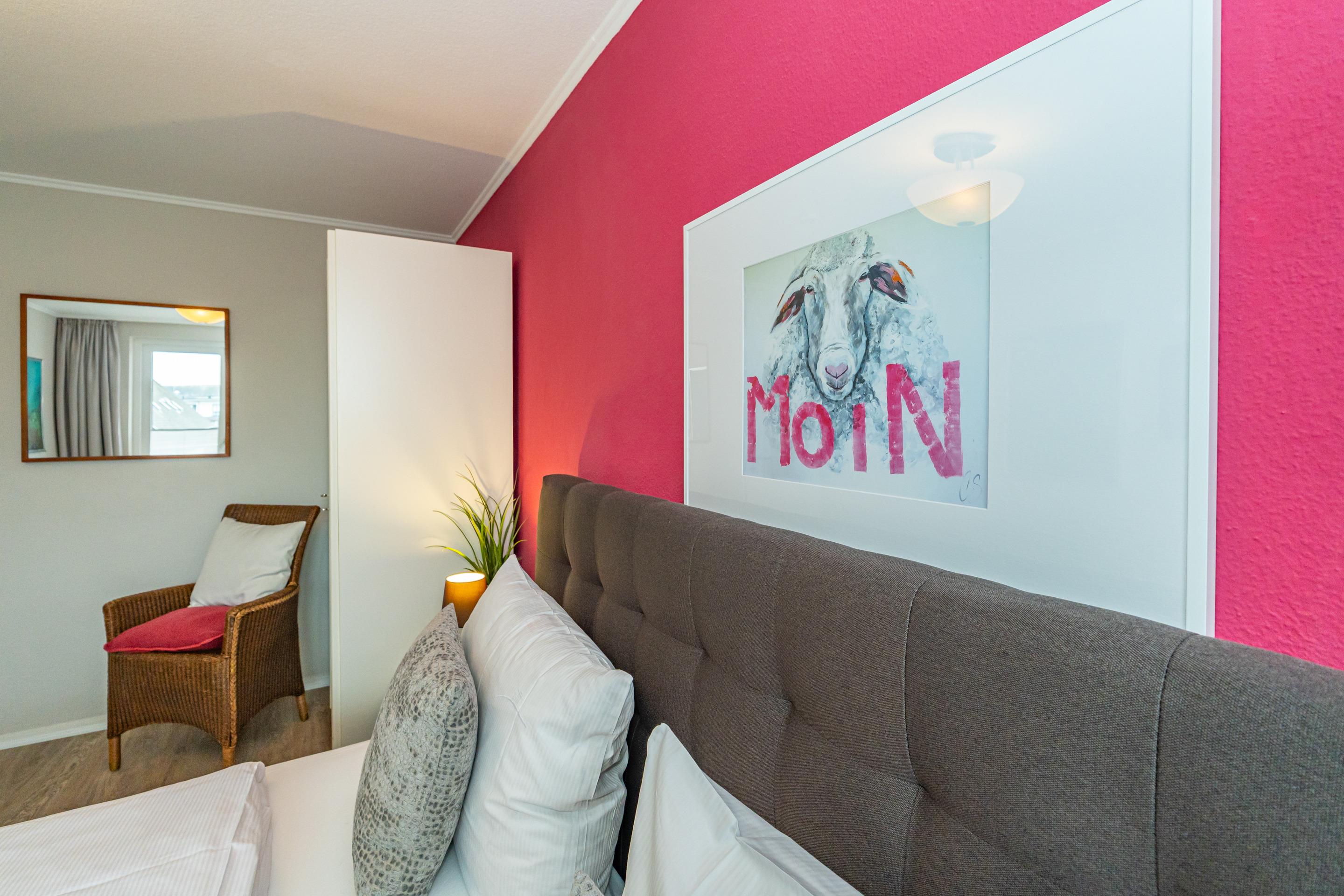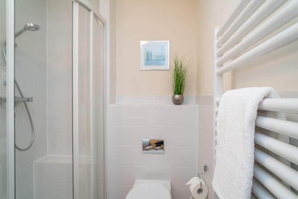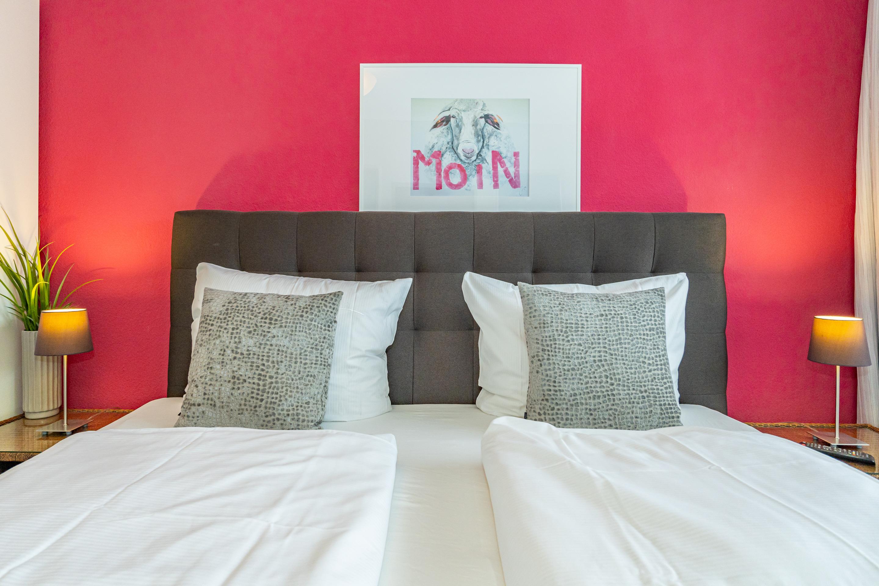 Diese moderne 2-Zimmer-Nichtraucher-Ferienwohnung (ca. 58 qm) in der 2. Etage bietet komfortablen Wohnraum für bis zu 4 Personen. Im Schlafzimmer erwartet Sie ein gemütliches Doppelbett, bestehend aus zwei Einzelmatratzen (je 0,90 x 2,00 m), ergänzt durch stilvolle Nachttische und einen eleganten Sessel in Loom-Ausführung. Das Wohnzimmer überzeugt mit Doppelschrankbetten (je mit Einzelmatratzen von 1,70 x 0,90 m), einem Sat-Flachbild-TV, Telefon und WLAN – ideal für flexible Schlafmöglichkeiten und entspannte Abende. Die offene Küche, die ohne trennende Tür direkt in den Wohnbereich integriert ist und über ein Fenster verfügt, lässt keine Wünsche offen: Ausgestattet mit Backofen, Cerankochfeld, Kühlschrank mit Eisfach, Geschirrspüler, Kaffeemaschine, Wasserkocher und Toaster, bietet sie alles, was Sie für die Zubereitung Ihrer Lieblingsgerichte benötigen. Das moderne Duschbad/WC rundet das Raumkonzept ab.