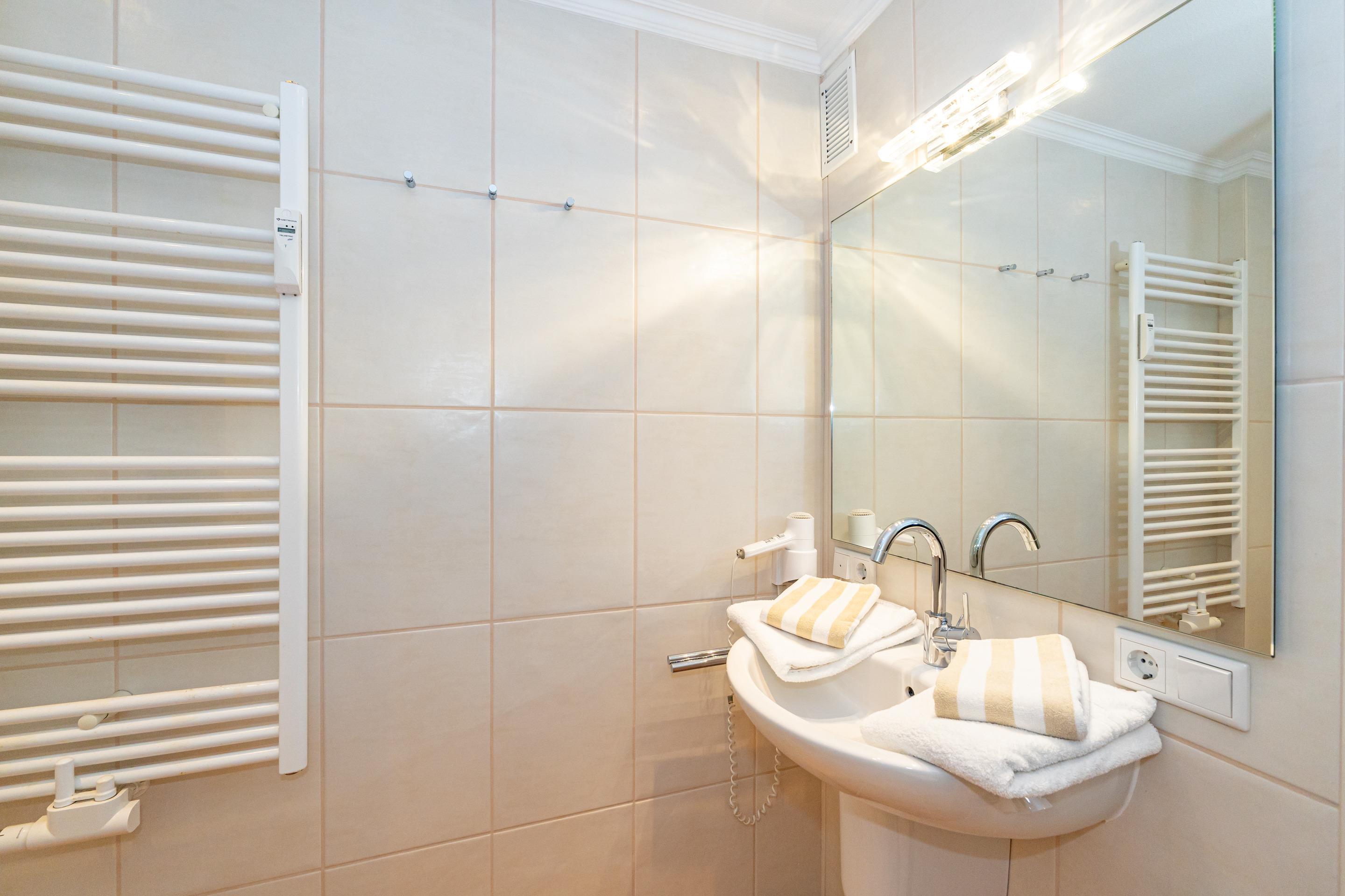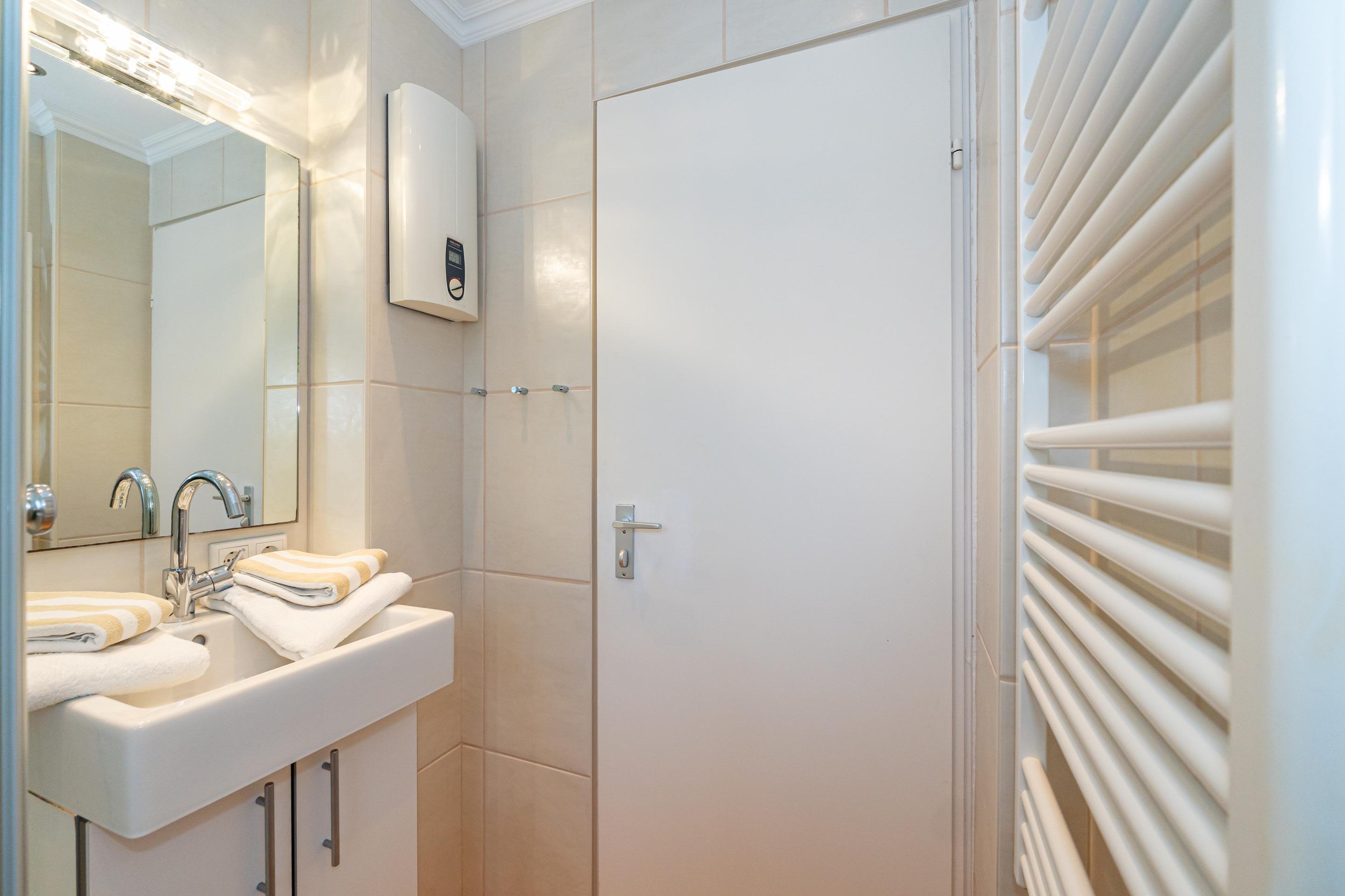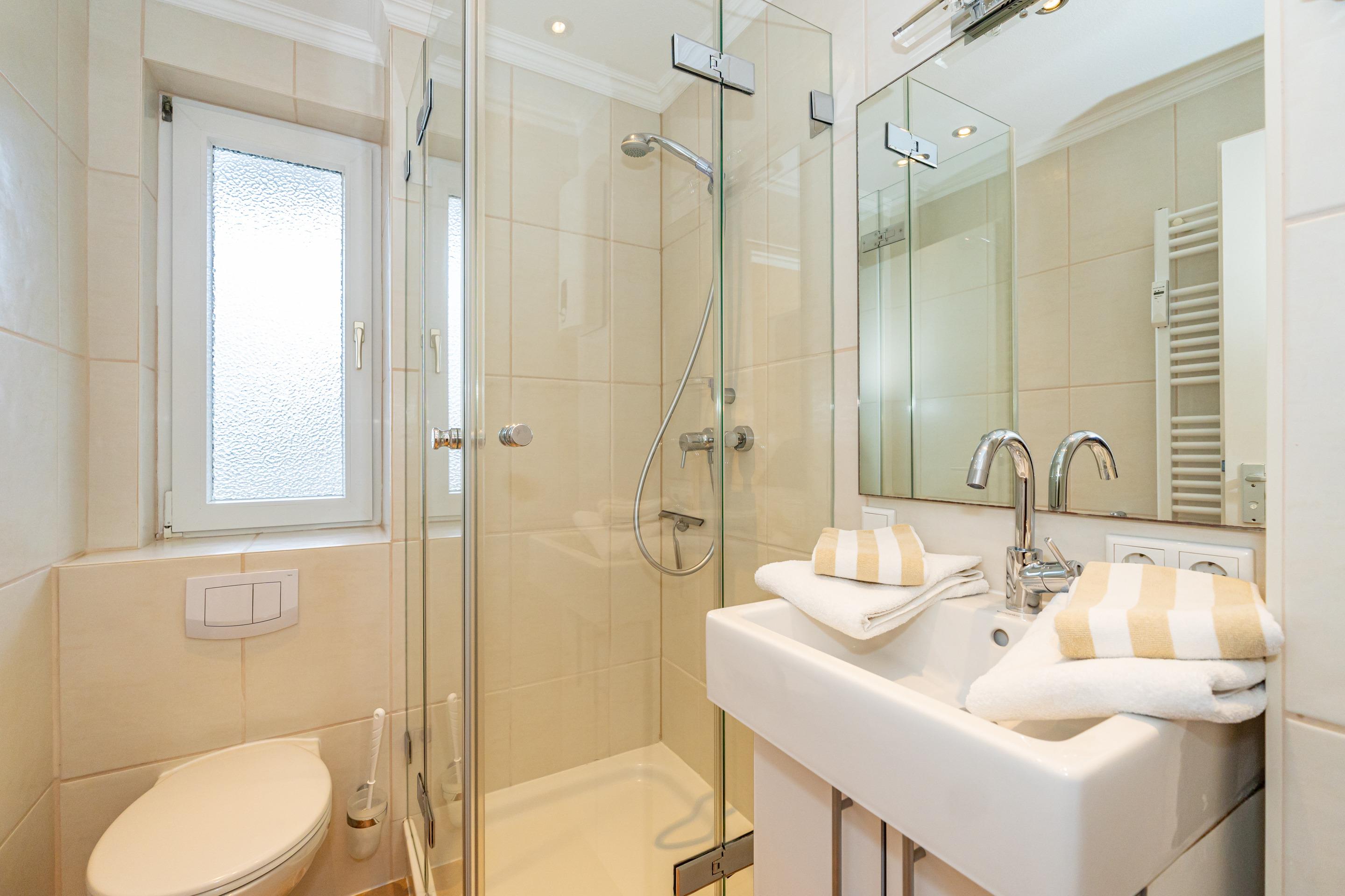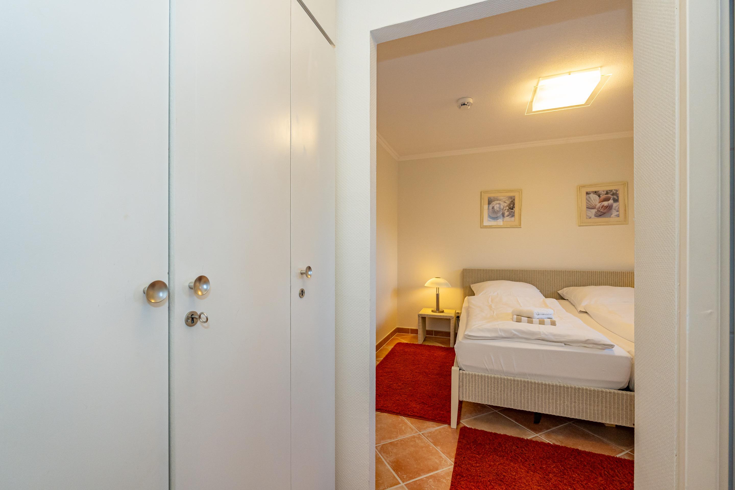Das helle Schlafzimmer ist mit einem Doppelbett ausgestattet und verfügt über einen zusätzlichen Flachbild-TV für entspannte Abende. Die offene Küche überzeugt mit einem Geschirrspüler, einer Mikrowelle, einem Cerankochfeld sowie einer Kaffeemaschine, einem Wasserkocher und einem Toaster – ideal, um Ihre Lieblingsgerichte selbst zuzubereiten. Für zusätzlichen Komfort sorgen zwei separate Duschbäder mit WC sowie ein Ionen-Haartrockner.
