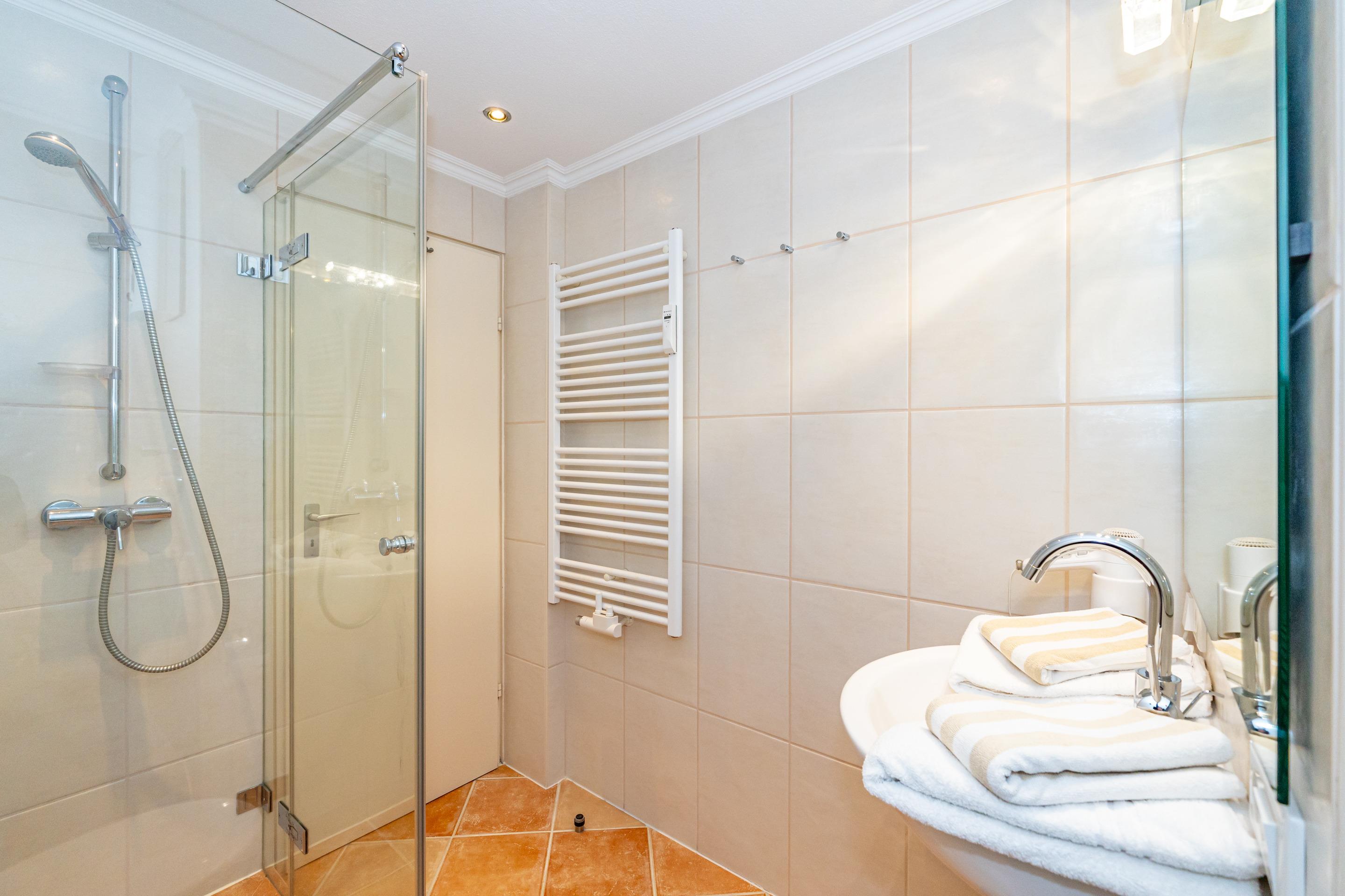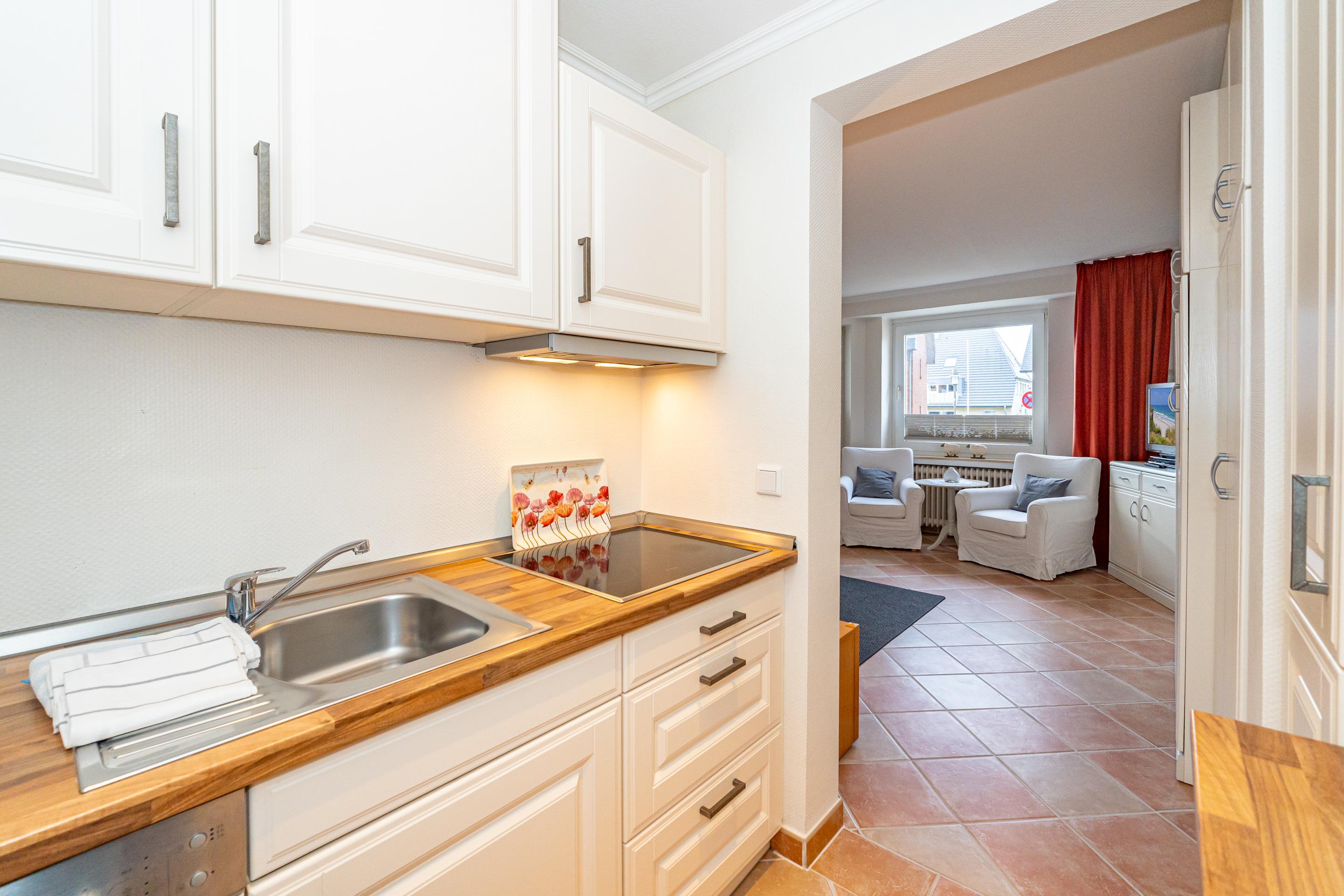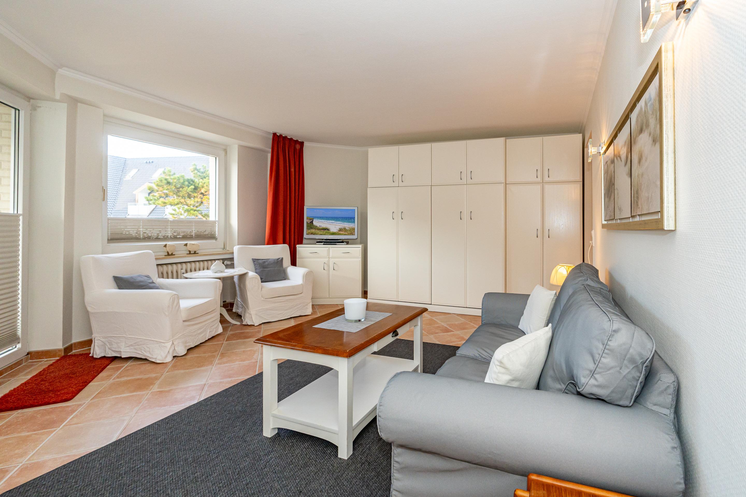 Erleben Sie Komfort und Wohlbefinden in dieser großzügigen, allergikergeeigneten 2-Zimmer-Ferienwohnung im Hochparterre (ca. 55 qm) – ideal für einen entspannten Aufenthalt. Die Wohnung liegt auf einer Ebene und bietet Ihnen ein durchdachtes helles Raumkonzept, das keine Wünsche offen lässt. Im offenen Wohnbereich finden Sie flexible Wandklappbetten, eine gemütliche 2-Sitzer-Couch mit zwei Sesseln, einen Flachbild-TV, einen DVD-Player, ein Radio sowie einen offenen WLAN-Hotspot. Ein separater Essplatz und der Westbalkon – der Sie in der Nachmittagssonne mit seiner komfortablen Ausstattung zum Verweilen einlädt – runden den Wohnbereich perfekt ab.