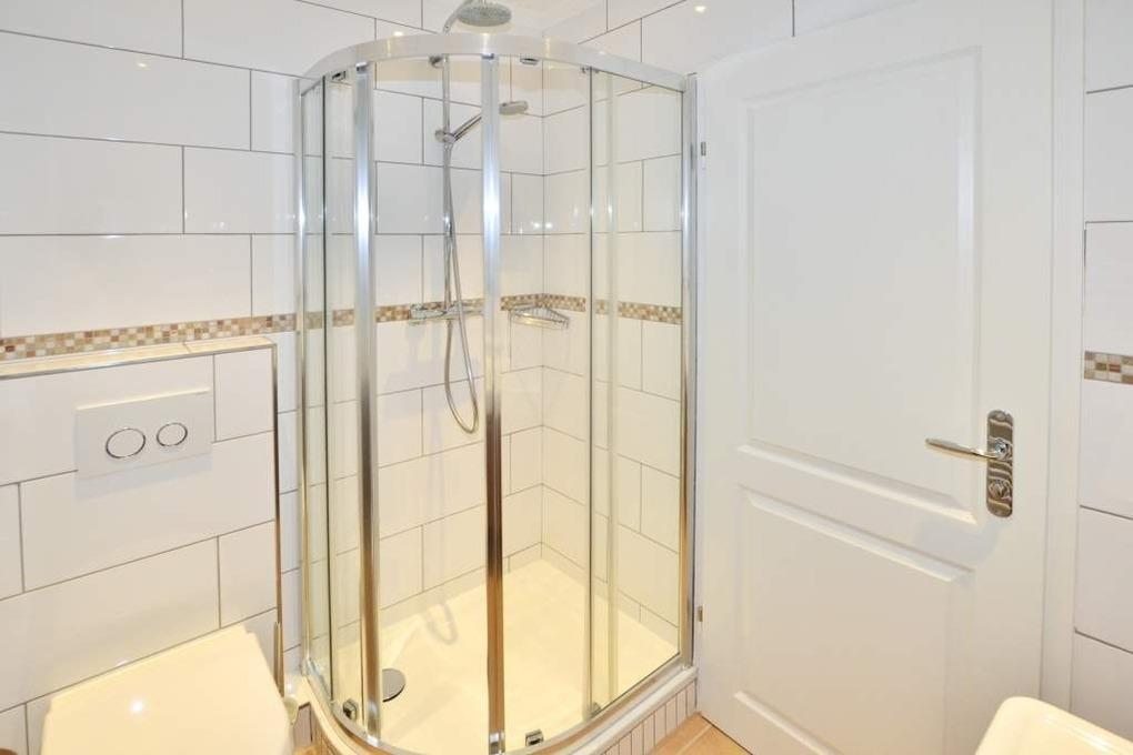 Im Bad befinden sich eine Dusche, ein WC und ein Waschtisch.