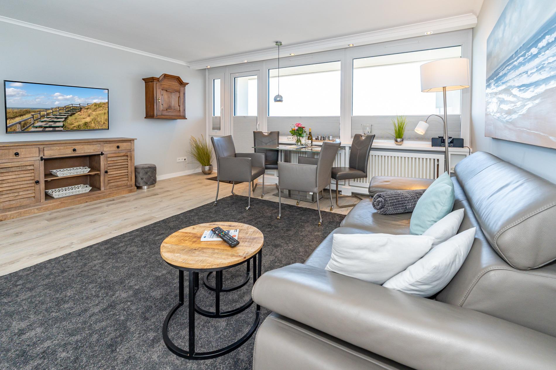 Der Wohnraum besteht aus einer Sitzgarnitur (mit 2-Sitzer-Couch und 2 Sesseln), einem Essplatz, einem Doppel-Wandschrankbett und einem großen Kabel-Flachbild-TV.