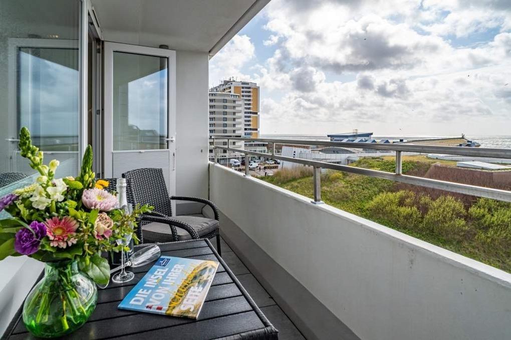 Gut eingerichtete, komplett mit Fliesen und Venyl-Laminat ausgestattete 2-Zimmer-Nichtraucher-Ferienwohnung, ca. 51 qm, in der 5. Etage zur Seeseite mit herrlichem Meerblick und Westloggia (Nachmittags- und Abendsonne mit Balkonmöbeln und Auflagen) für max. 4 Personen.