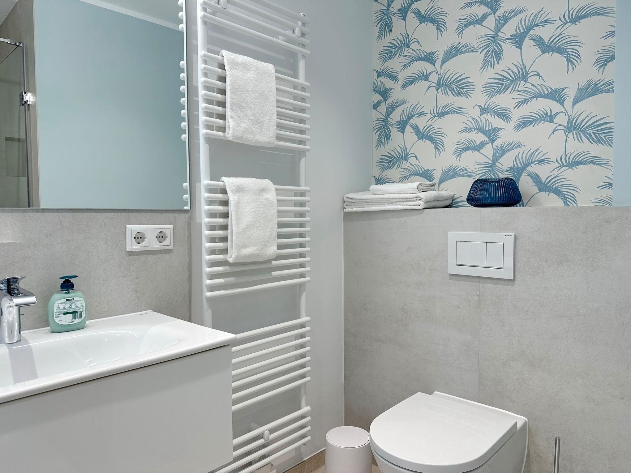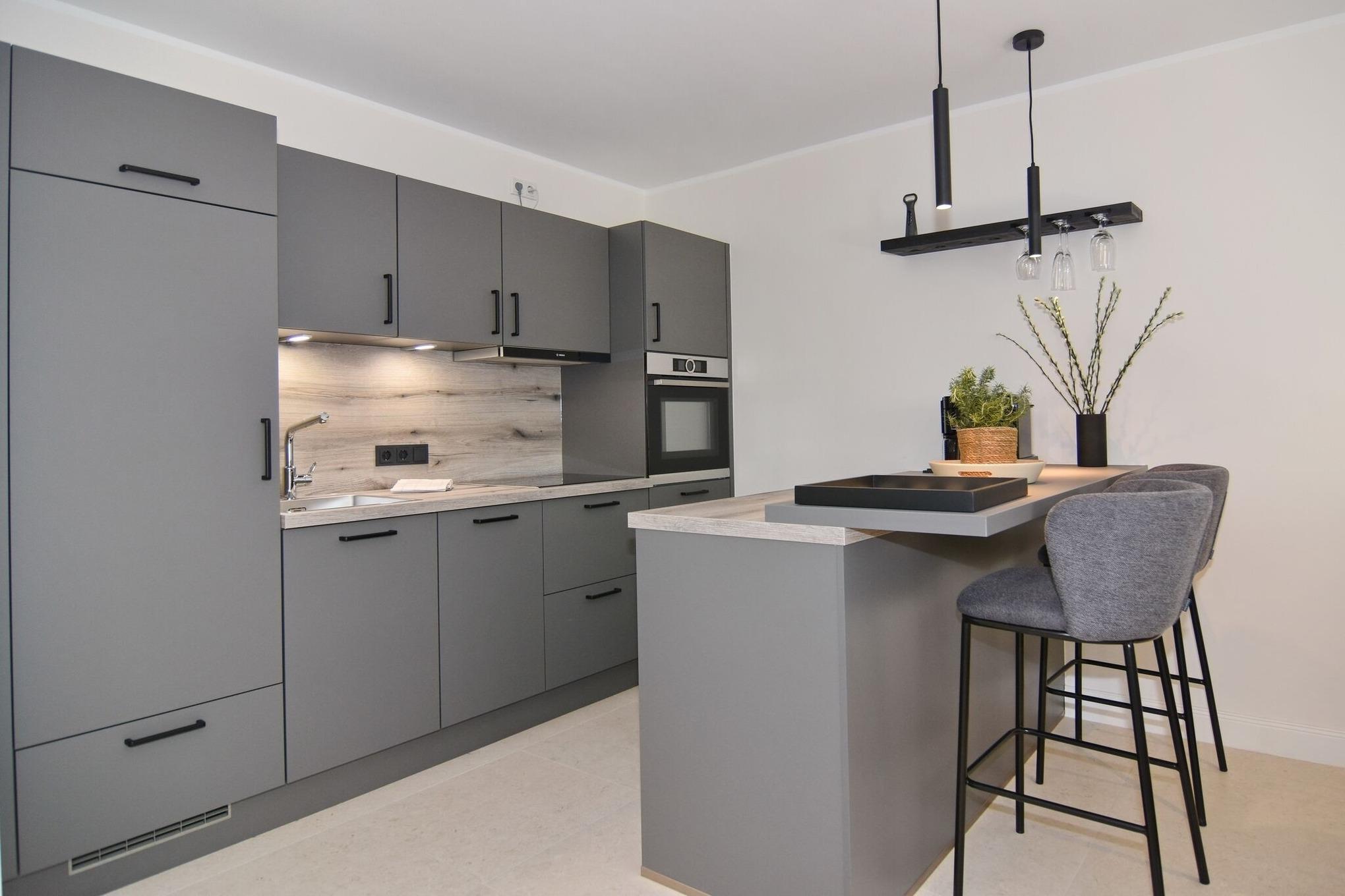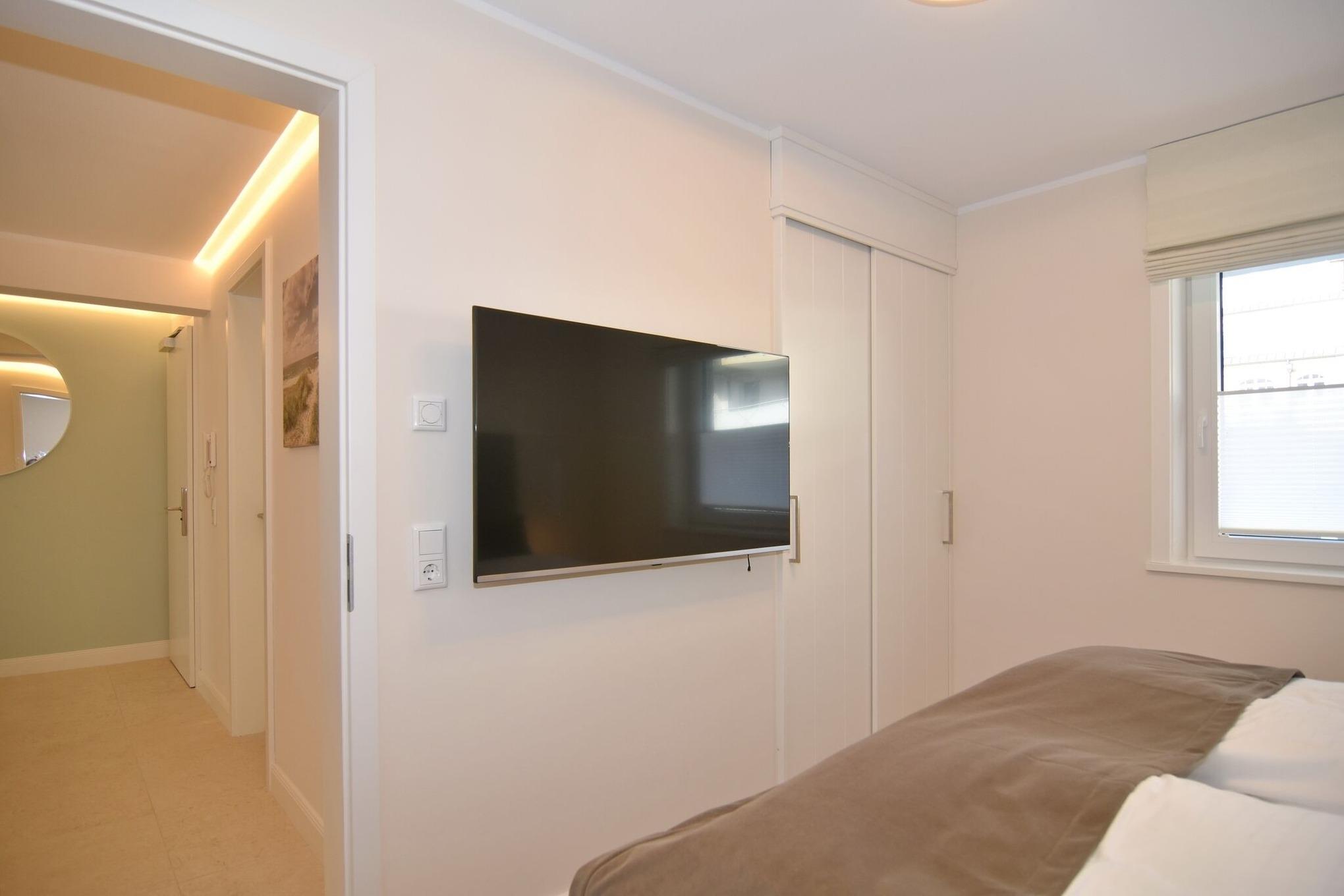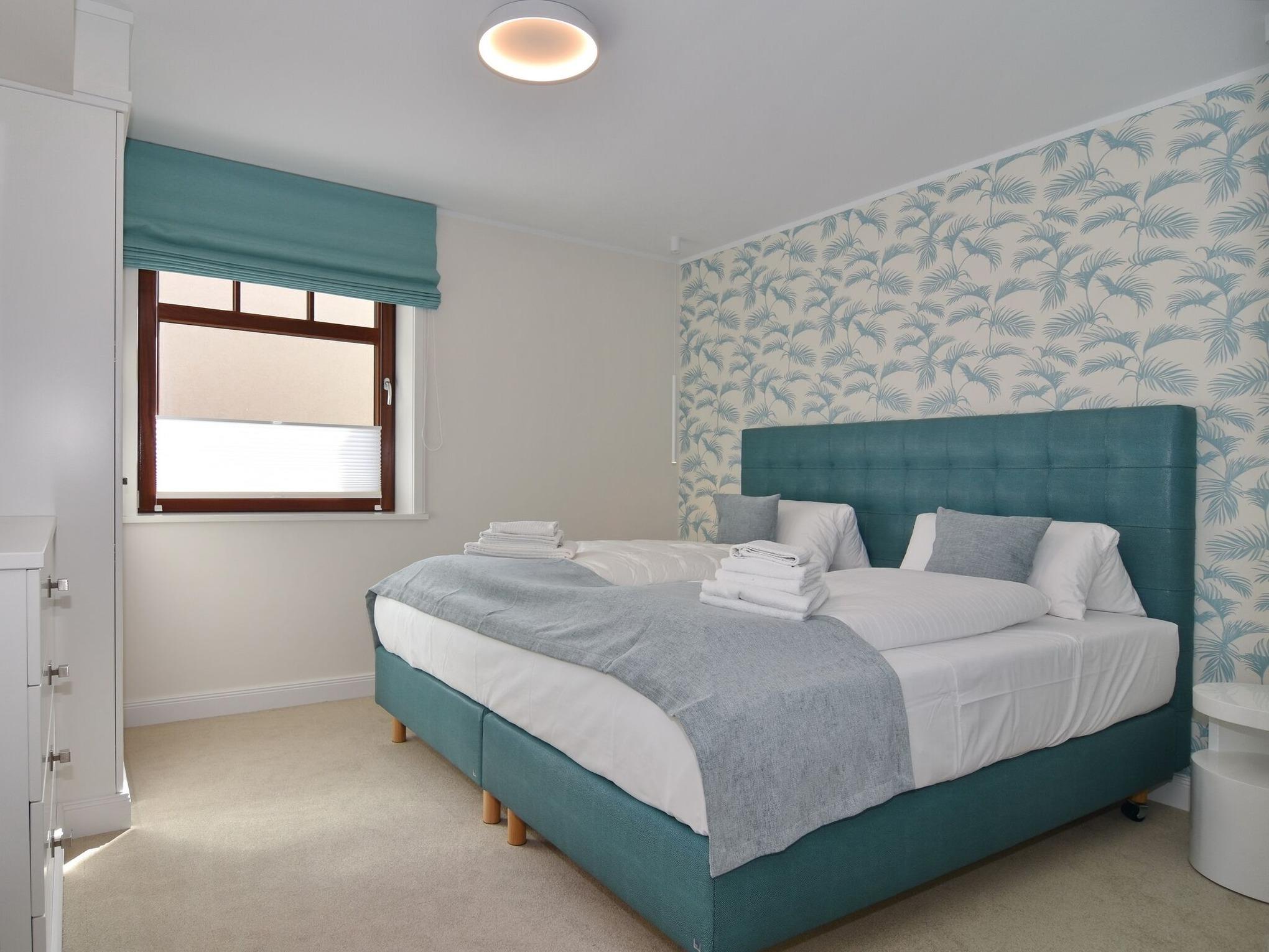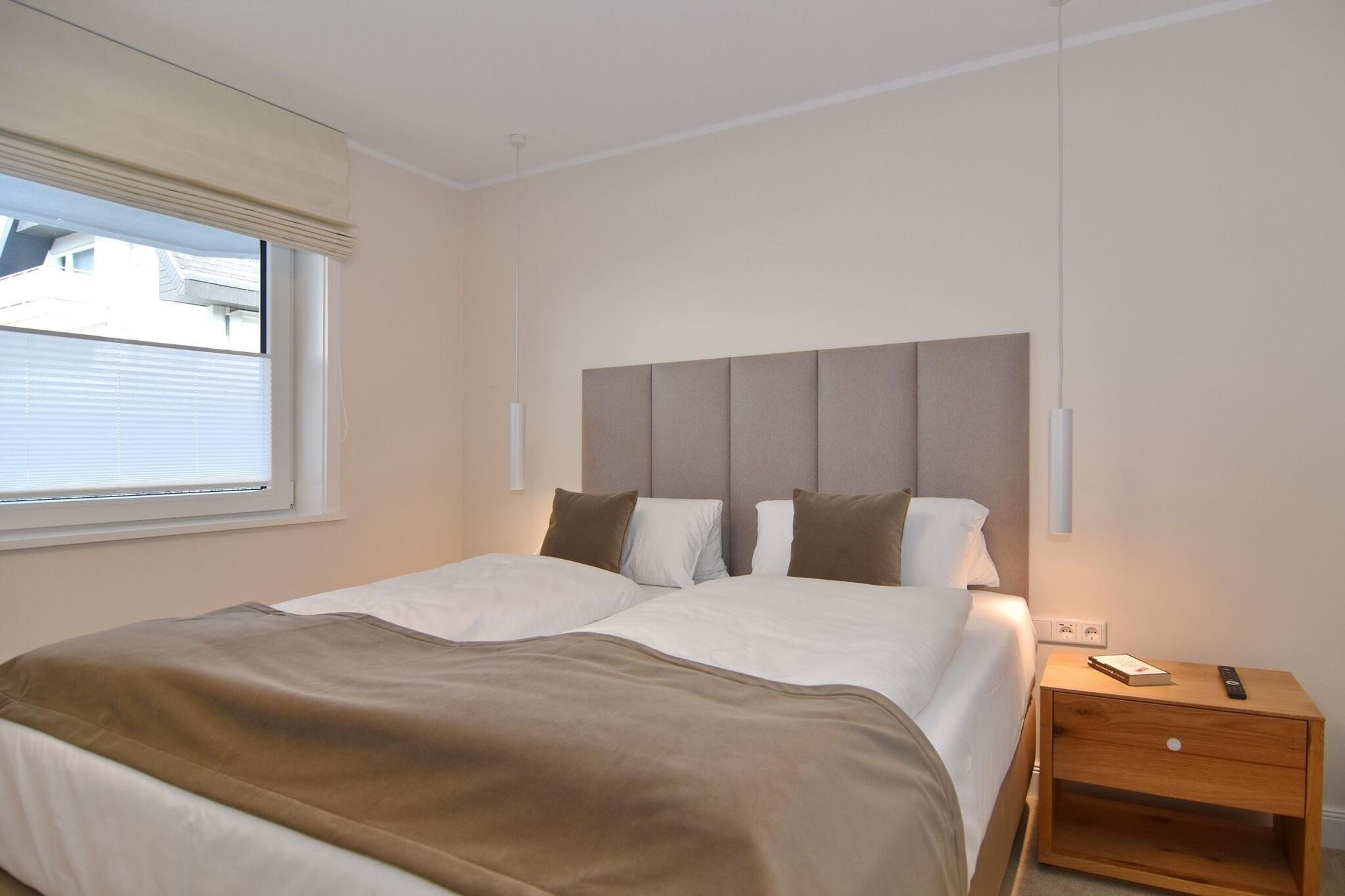 Die hochwertige 3-Zimmer-Erdgeschoßwohnung mit ca. 87 qm ist für 4 Personen ausgestattet. Vom geräumigen Flur mit Garderobe gelangen Sie in das Wohnzimmer mit offener Küche und möblierter Südterrasse. Die hochwertige Küche mit Tresen verfügt über einen Induktionsherd, Geschirrspüler, Kühlschrank mit Gefrierfach und Backofen mit integrierter Mikrowelle. Beide Schlafräume bieten mit Boxspringbetten (160x200 und 200x200) der Marke FBF hochwertigen Schlafkomfort und verfügen über Einbauschränke und TV. Kinderbetten sind buchbar. Die Wohnung verfügt über 2 moderne Duschbäder mit Haar- und Handtuchtrockner. Die Wohnung ist mit großformatigen Fliesen ausgelegt und verfügt über Fußbodenheizung. Die Schlafzimmer sind mit Teppichware ausgelegt. Internet (ohne Gewähr), Sharemagazin und Smart-TV sind vorhanden.