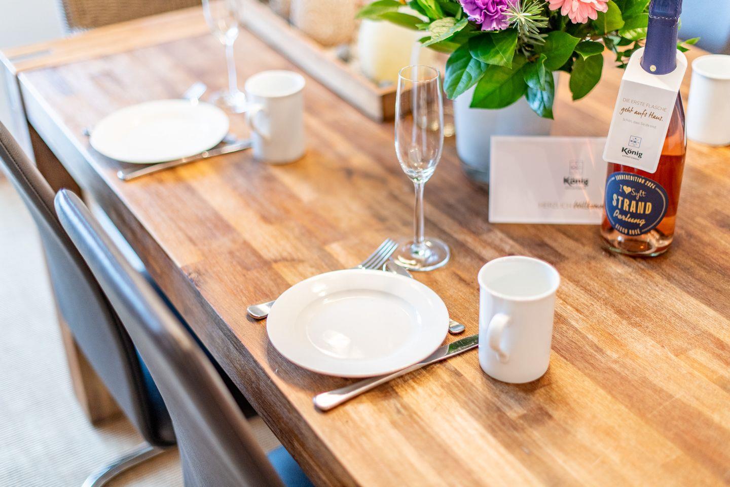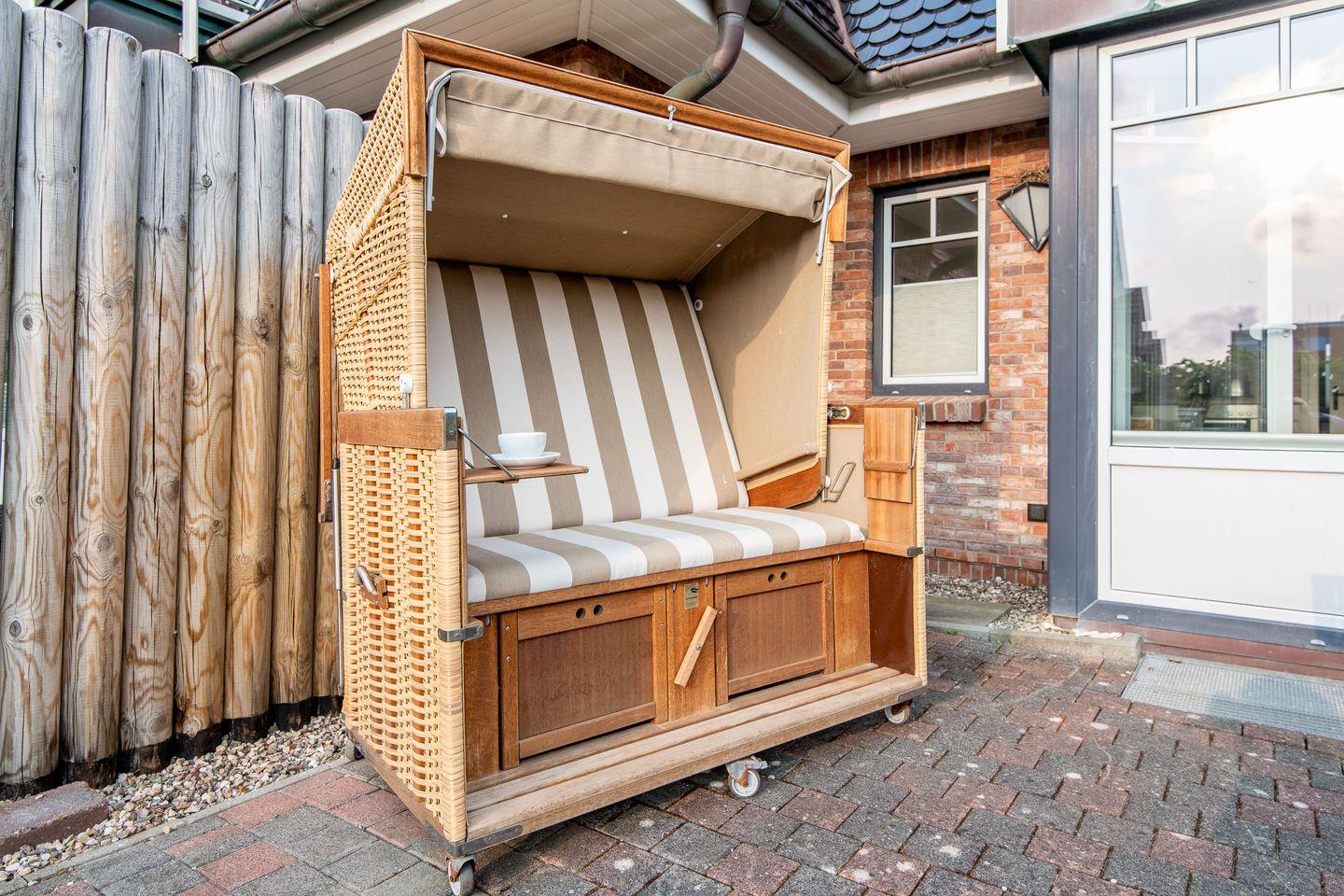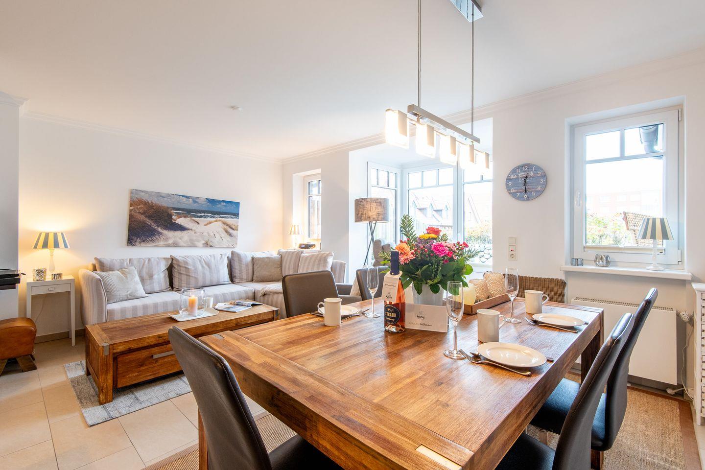 Der große Wohn- und Essbereich ist offen gestaltet und verfügt über eine gemütliche Sofaecke, einen Sessel, TV und einen Esstisch für gemeinsame Mahlzeiten. Von hier aus haben Sie direkten Zugang zur Terrasse nach Westen, die mit einem Strandkorb und Gartenanteil perfekt für entspannende Stunden im Freien ausgestattet ist.