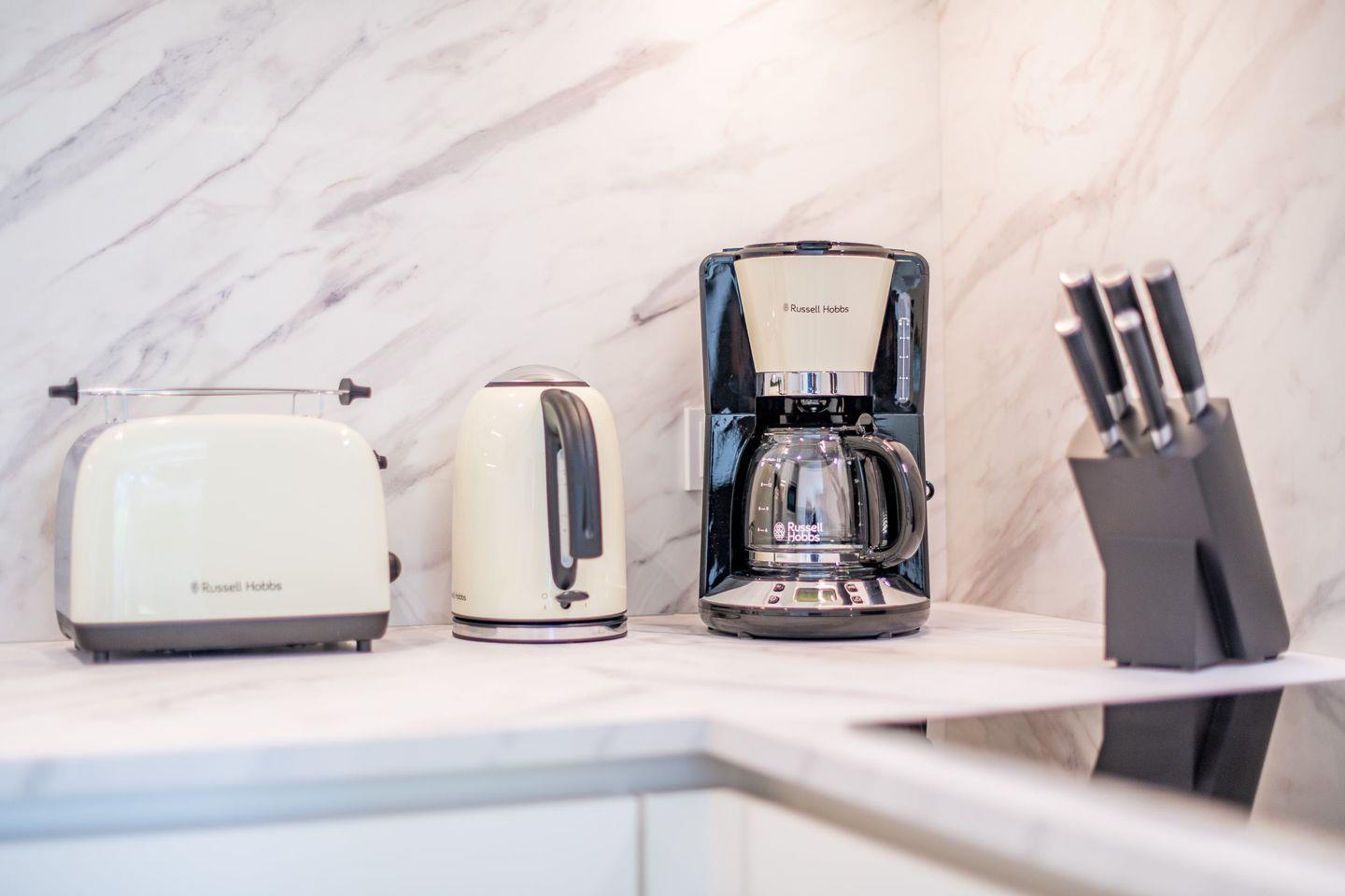 Wohn-/Koch-/Essbereich: Geräumiger Wohnraum mit gemütlichem Beleuchtungskonzept, Sofa, TV und einer Kommode. Bei dem Sofa handelt es sich um ein Schlafsofa, welches in ausgezogenem Zustand eine Liegefläche von 1,60 m x 2,00 m hat und einen Schlafplatz für eine weitere Personen bietet. Der runde Esstisch mit stylischen Esstischstühlen lädt zu geselligen Mahlzeiten ein. Die angrenzende und helle Einbauküche ist sehr gut ausgestattet.