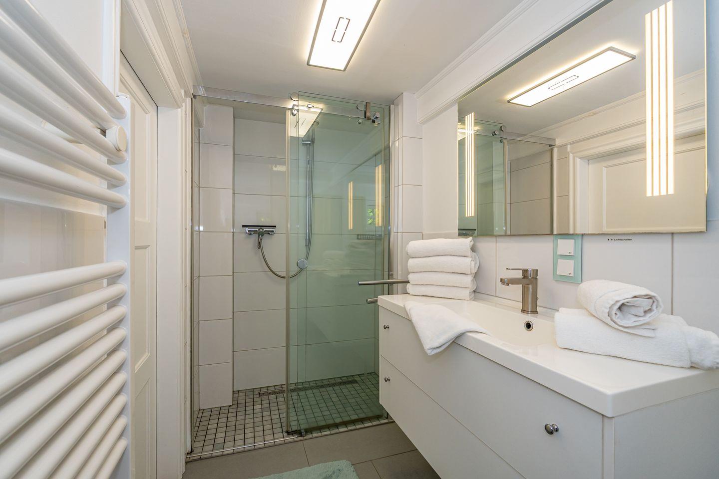 Die geschlossene Küche ist bestens ausgestattet und lässt keine Wünsche offen: Ceranherd, Backofen, Mikrowelle, Spülmaschine, Kühlschrank, Kaffeemaschine, Wasserkocher, Küchenutensilien sowie Geschirr und Besteck machen auch längere Aufenthalte angenehm und komfortabel. Ein Abfalleimer ist selbstverständlich vorhanden.