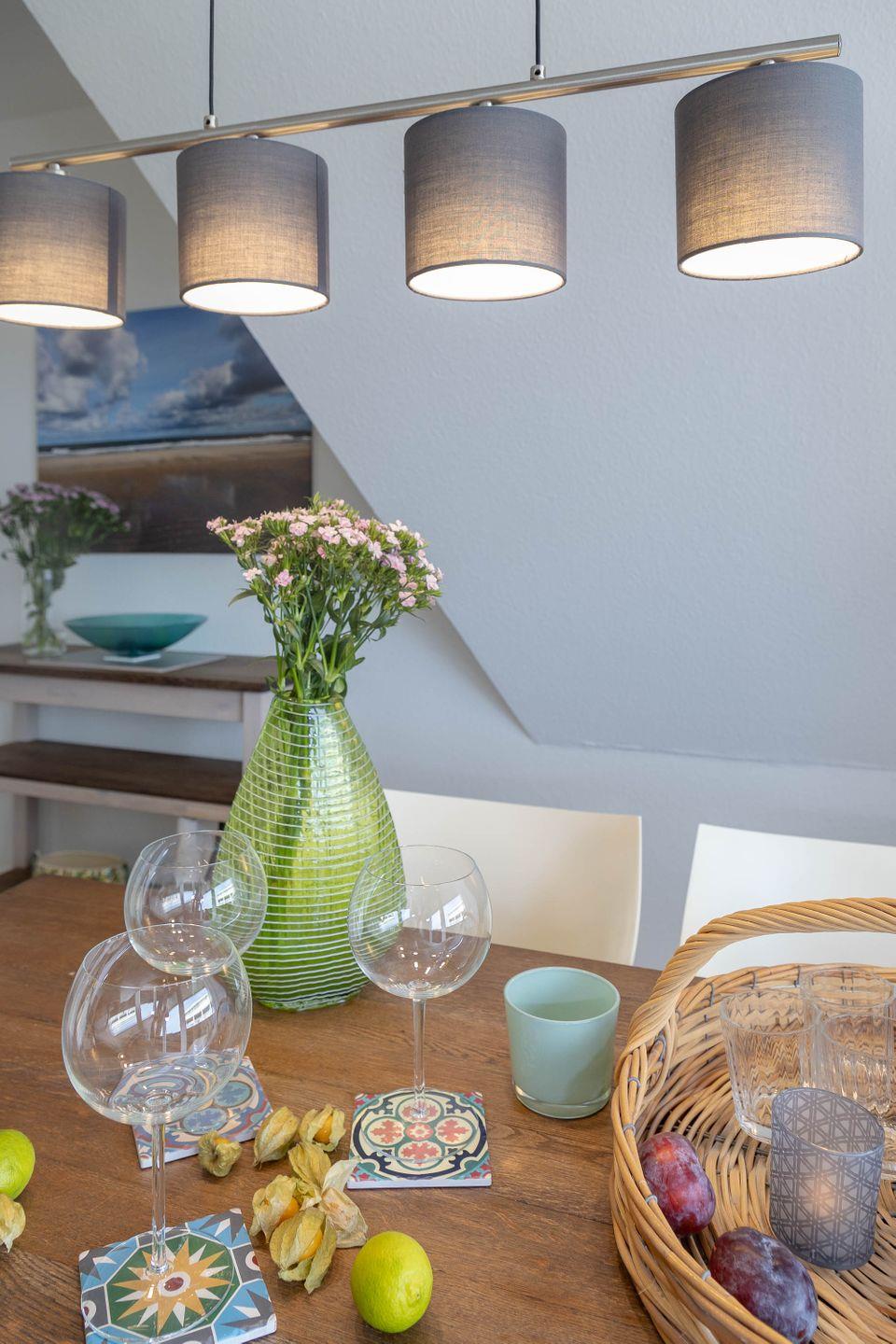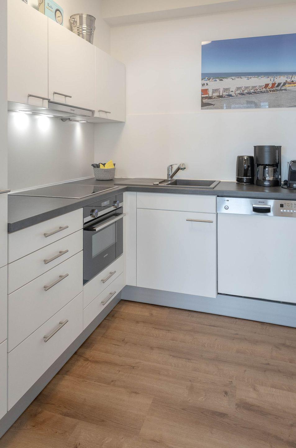 Die offen zum Wohnzimmer gestaltete Küche ist voll ausgestattet: Neben einem Herd, einem Backofen und einer Mikrowelle stehen Ihnen auch eine Spülmaschine, ein Kühlschrank mit Gefrierfach, eine Kaffeemaschine, ein Wasserkocher und ein Toaster zur Verfügung. Für das leibliche Wohl sind zudem Geschirr und Besteck, Geschirrhandtücher und alle notwendigen Küchenutensilien vorhanden, sodass auch ausgedehnte Mahlzeiten bequem zubereitet werden können.