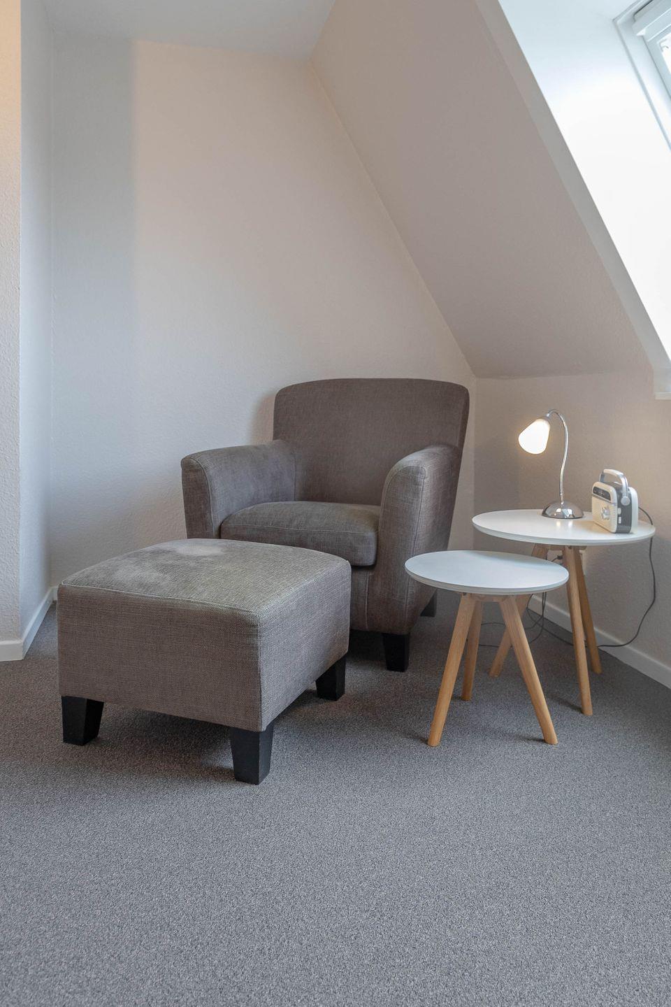 Der Wohnbereich überzeugt mit einer einladenden Sofaecke und einem Essbereich, der zum Verweilen einlädt. Der moderne Vinylboden im Wohnzimmer sorgt für eine angenehme Atmosphäre und ist pflegeleicht. Das Schlafzimmer ist mit einem Teppichboden ausgestattet und bietet erholsame Ruhe. Insgesamt gibt es drei Räume – ein Wohnzimmer, ein Schlafzimmer und einen weiteren Bereich, der flexibel genutzt werden kann. Die Ferienwohnung bietet damit ausreichend Platz für bis zu vier Schlafmöglichkeiten, wobei zwei Zustellbetten verfügbar sind.