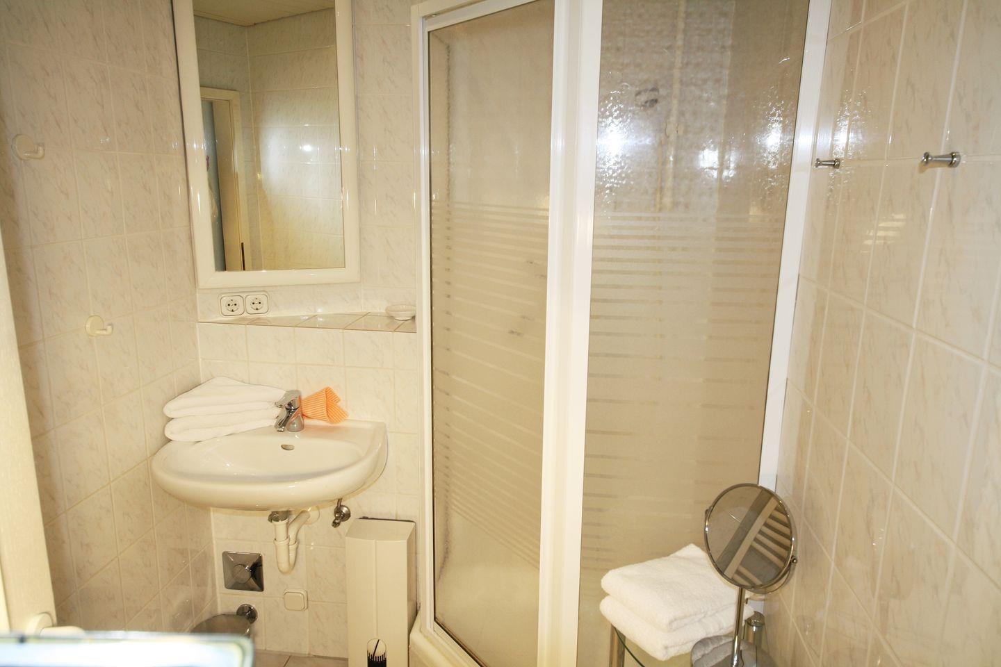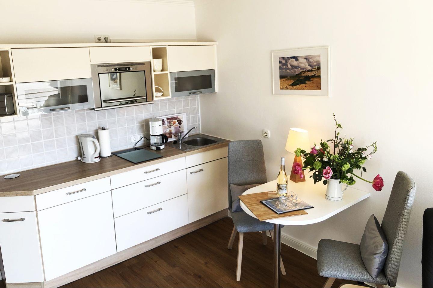 Die funktionale Küchenzeile bietet alles, was Sie für die Selbstverpflegung im Urlaub benötigen, während das Duschbad mit WC die praktische Raumaufteilung der Wohnung ergänzt.