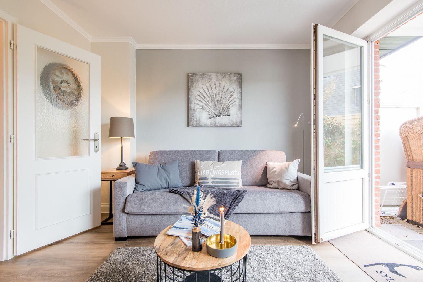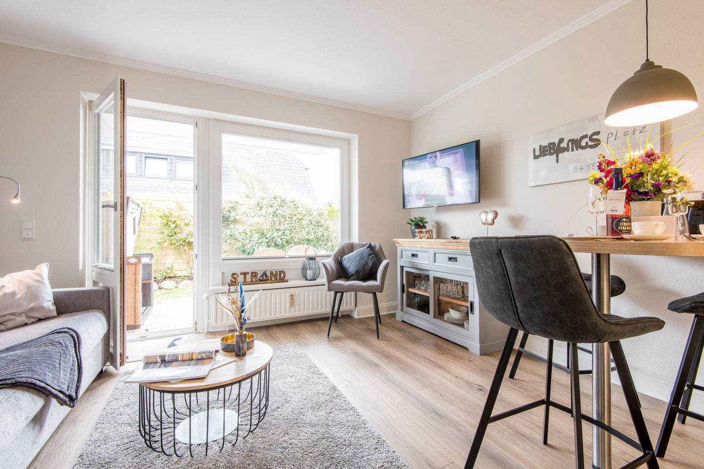 Das helle Wohnzimmer ist mit einem ausziehbaren Schlafsofa, einem elektrisch verstellbaren Sessel und einem TV ausgestattet. Der Zugang zur sonnigen Süd-Terrasse führt in einen kleinen Gartenbereich mit Gartenmöbeln, perfekt für sonnige Stunden im Freien.