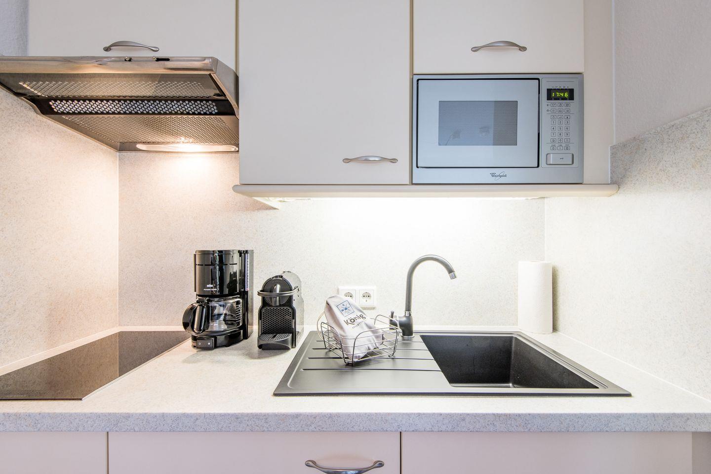 Die offene Küche bietet Ihnen alles, was Sie für eine komfortable Selbstverpflegung benötigen. Sie ist mit einem 2-Platten-Herd, einem kleinen Geschirrspüler und einer Filterkaffeemaschine ausgestattet. Der Essbereich umfasst eine Essgruppe mit drei Stühlen.