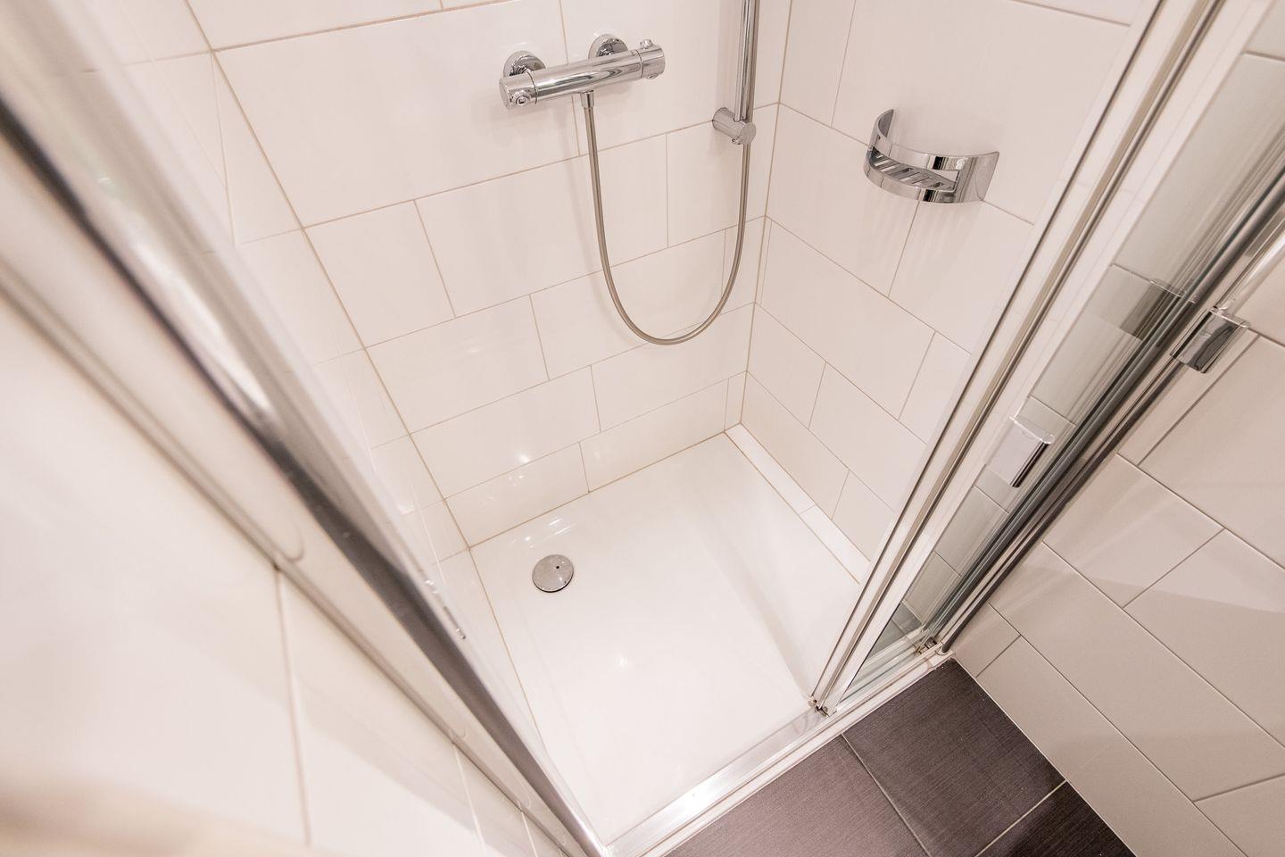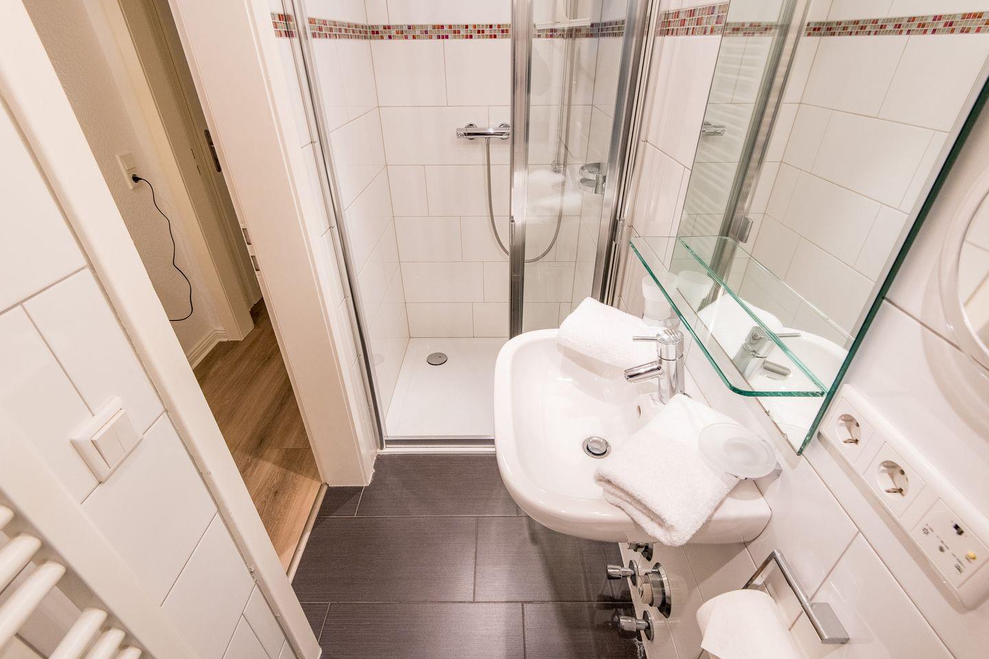 Das Badezimmer ist mit einer Dusche, WC, Tageslicht und einem Föhn ausgestattet. Zusätzlich ist ein Gäste-WC vorhanden.