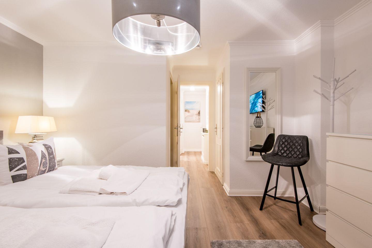 Das Schlafzimmer verfügt über ein Doppelbett (2x 90x200 cm), einen geräumigen Kleiderschrank und einen zusätzlichen TV.