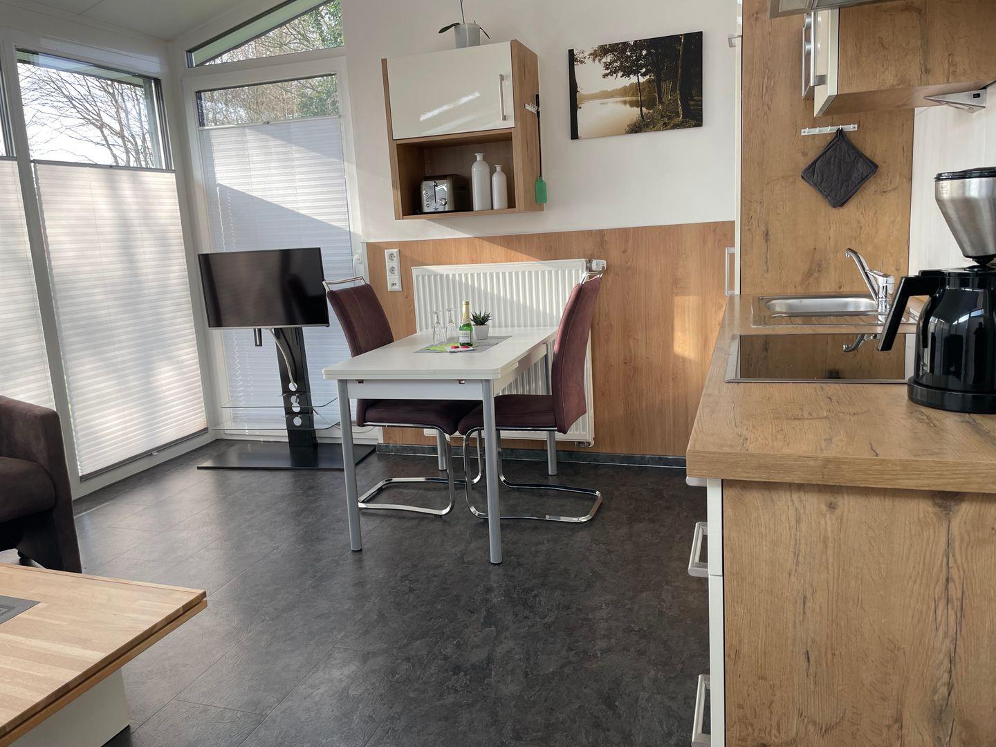 Die moderne und ansprechend gestaltete Unterkunft verfügt über ein Schlafzimmer mit einem komfortablen Bett und einem zusätzlichen Zustellbett für eine dritte Person. Der Wohnbereich besticht durch eine offene Küche, die mit hochwertigen Küchenutensilien, einem Herd, Backofen, Spülmaschine, Kühlschrank und sogar einer Mikrowelle ausgestattet ist. So können Sie mühelos Ihre eigenen Köstlichkeiten zubereiten. Der Esstisch mit angrenzender Sofaecke lädt zu geselligem Beisammensein ein.