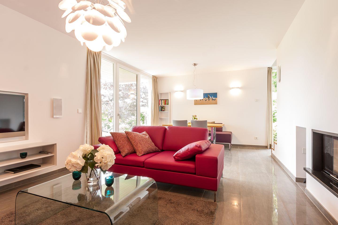 Im Zweienhaus trifft moderne Architektur auf eine stilvolle Innenausstattung. Dank des hochwertigen Interieurs lässt die Doppelhaushälfte keine Wünsche offen und ist Garant für einen rundum gelungenen Urlaub. Du gelangst über den großzügigen Eingangsbereich direkt in den modernen Wohnraum, der über eine hochwertige Ledersitzgruppe verfügt. Der lichtdurchflutete Essbereich mit wunderbarem Ausblick ins Grüne und ein Kaminofen fügen sich harmonisch ein. Weiterhin befindet sich im Erdgeschoss der offene und sehr gut ausgestattete Küchenbereich, der etwas vom Wohnbereich separiert ist. Ein Bad mit Dusche/WC und ein Hauswirtschaftsraum mit Waschtrockner sind ebenfalls auf dieser Etage untergebracht. Das Dachgeschoss beherbergt zwei Schlafzimmer, die jeweils mit einem Doppelbett und mit geräumigen Einbauschränken ausgestattet sind. Eines der beiden Schlafzimmer bietet ein zusätzliches TV-Gerät. Das Badezimmer mit Dusche/WC sowie ein kleiner Wellnessbereich mit eigener Sauna sorgen für Wohn- und Wohlfühlkomfort zu jeder Jahreszeit.