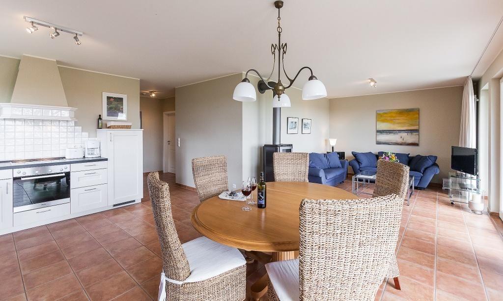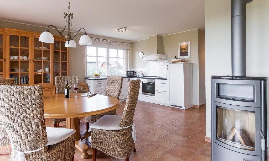 Der helle und großzügige Wohnbereich bietet eine gemütliche Sitzecke am Kaminofen sowie TV. Große Fenster sorgen für viel Tageslicht und einen schönen Ausblick. Der Essbereich und die moderne Küchenzeile sind offen integriert und schaffen einen angenehmen Raum zum Entspannen und Verweilen.