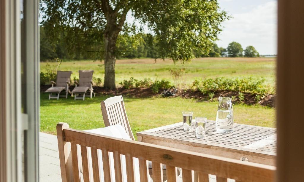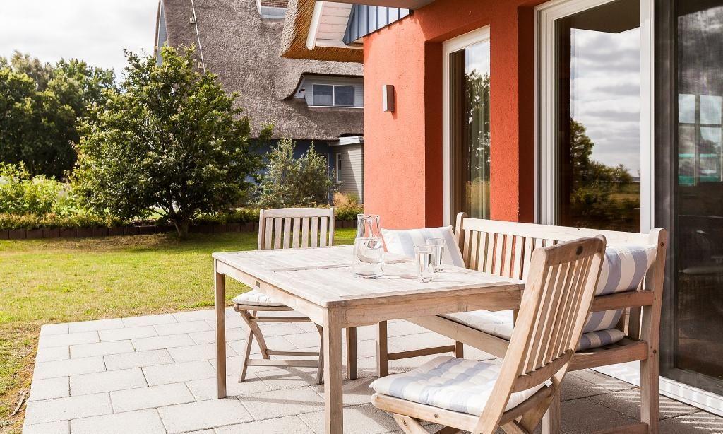 Zur Ferienwohnung gehört eine Steinterrasse mit Gartenmöbeln, die teilweise überdacht ist. Von hier aus eröffnet sich ein weiter Blick über die Wiesen bis zum Bodden. Die ruhige Lage lädt zu entspannten Stunden im Freien ein. Der Garten mit Sonnenliegen kann von beiden Wohneinheiten genutzt werden.