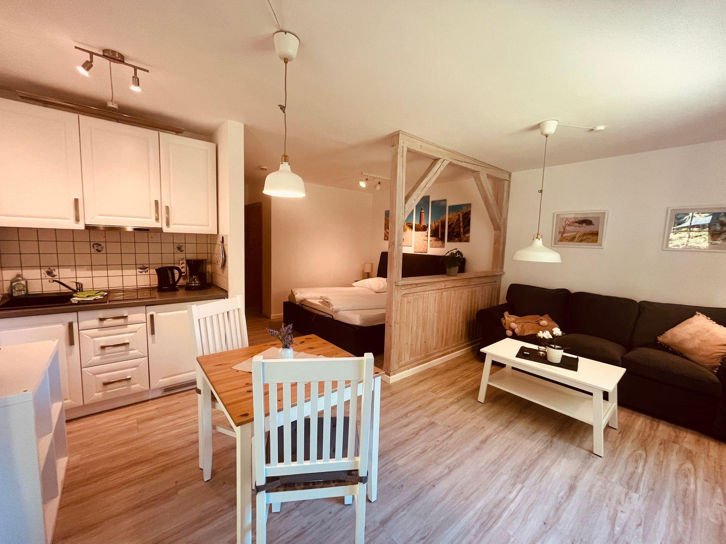 Die Ferienwohnung, etwa 35 m² groß, besteht aus einem kombiniertem Wohn,
