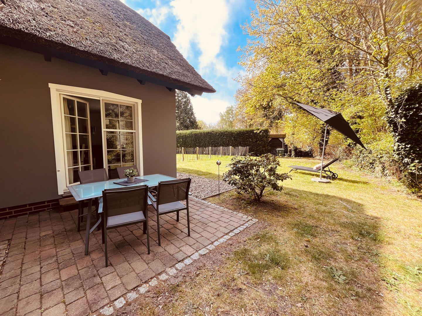 Terrasse ist mit Gartenmöbeln und Sonnenschirm und einer Gartenliege