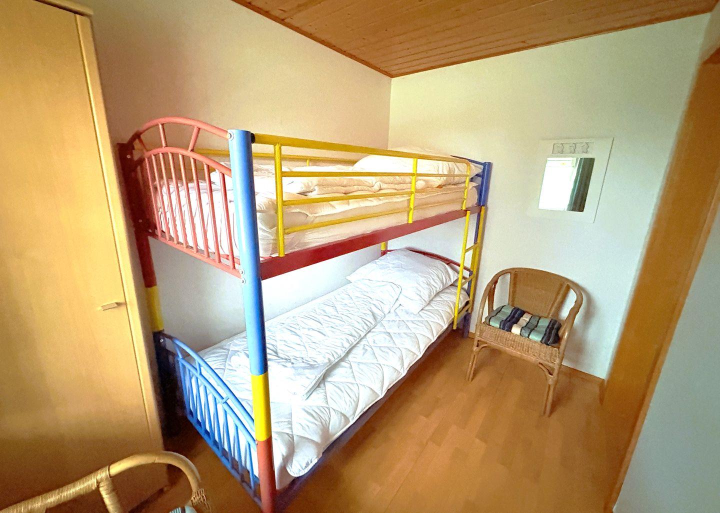 Das Apartment verfügt über zwei separate Schlafzimmer: eines mit einem komfortablen Doppelbett und eines mit Etagenbett - ideal für Kinder. Das moderne Bad bietet eine Dusche, WC, Waschmaschine und ein Fenster für Tageslicht.