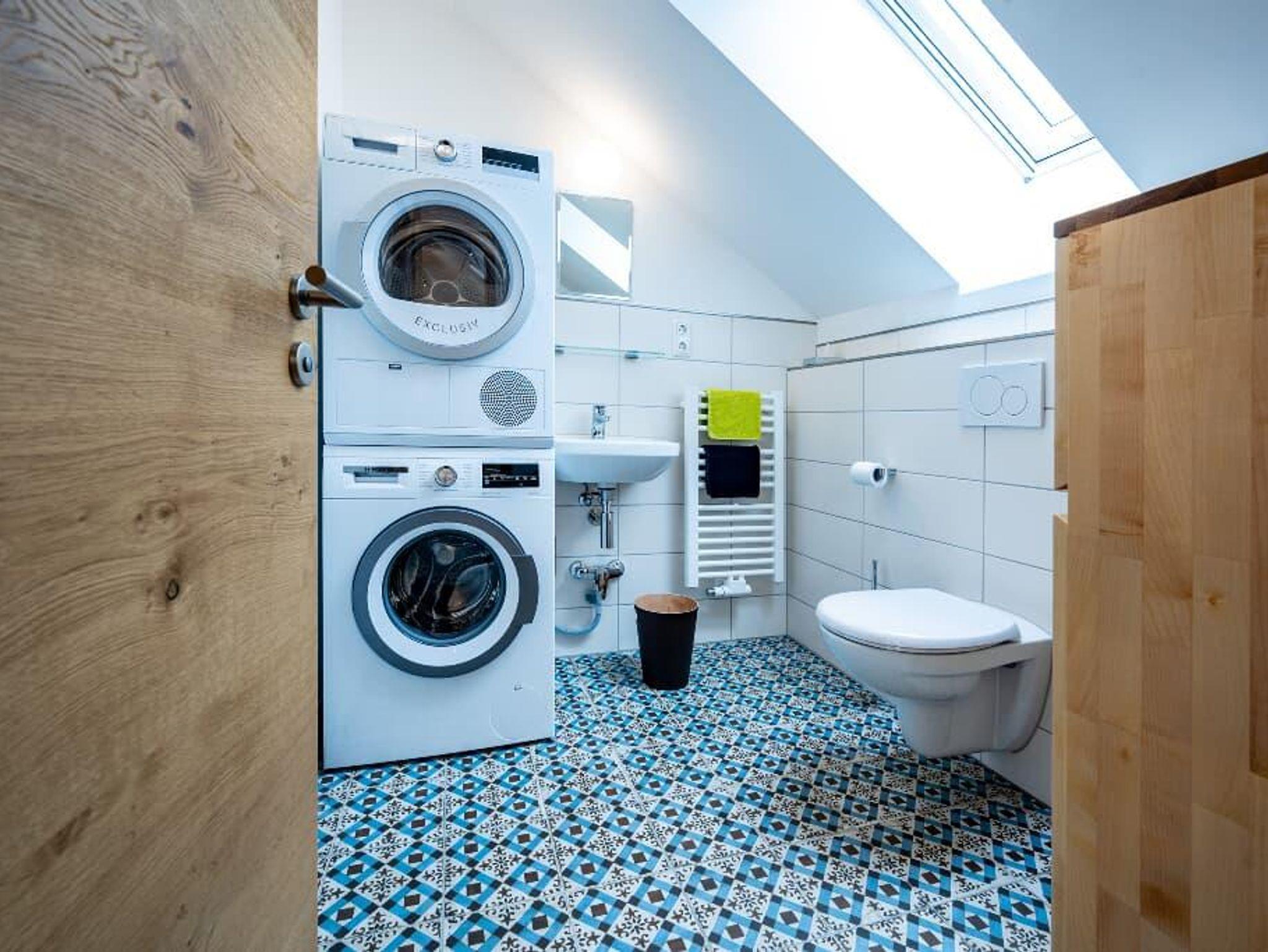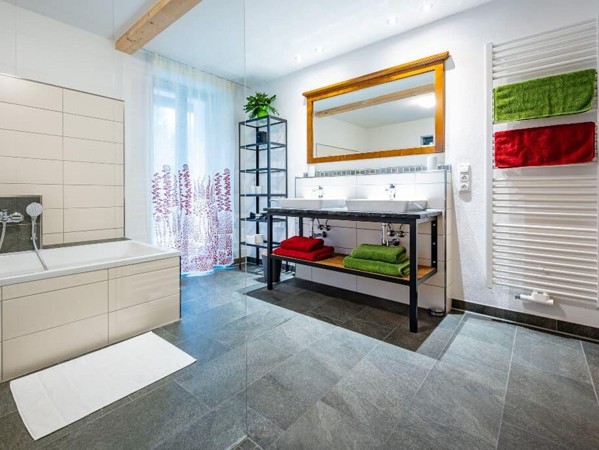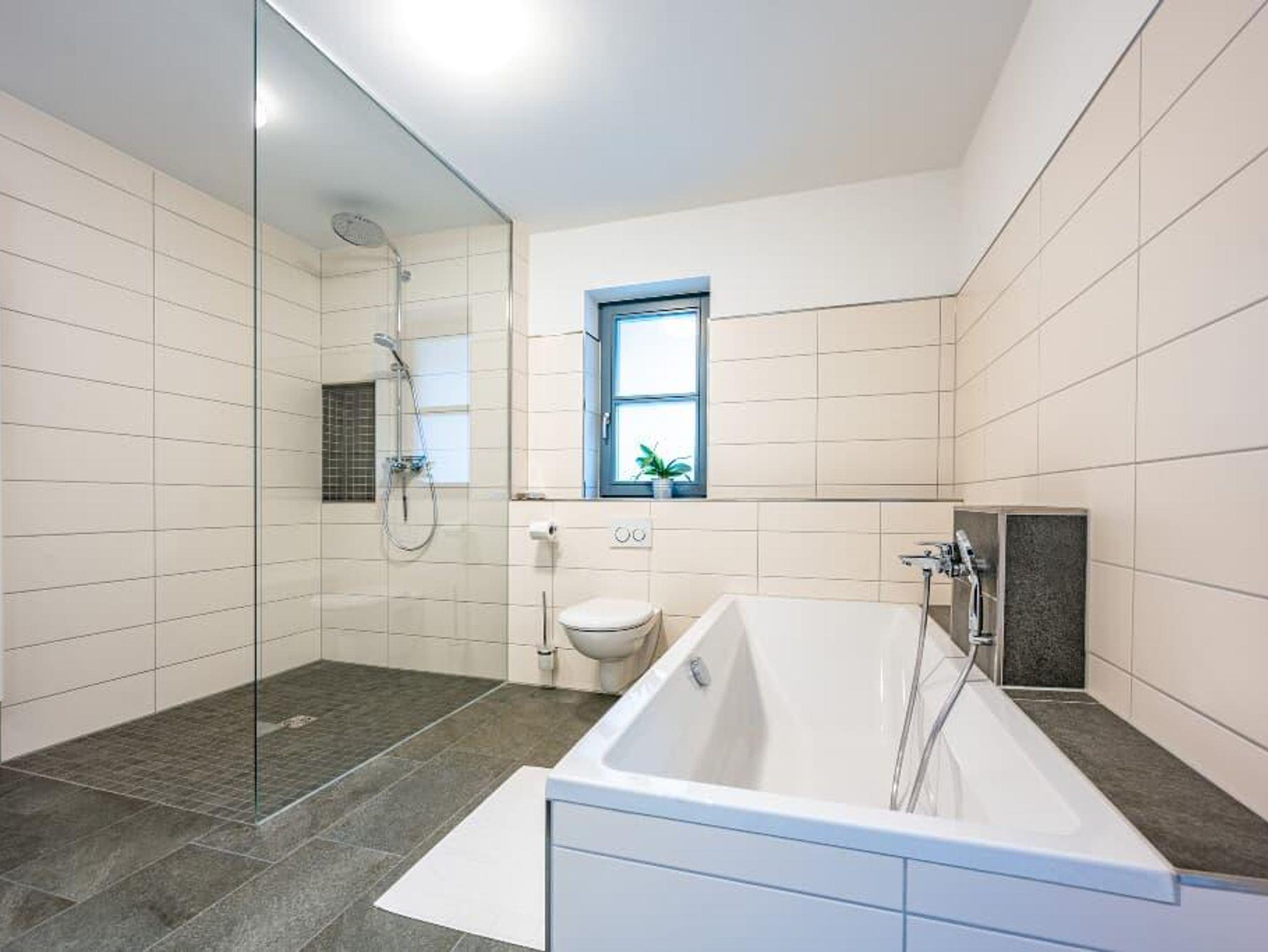 Ein Badezimmer mit großzügiger Dusche und Wanne, WC, Waschtisch, Handtuchtrockner und Föhn liegt im Erdgesschoss. Ein Gäste WC in der ersten Etage.