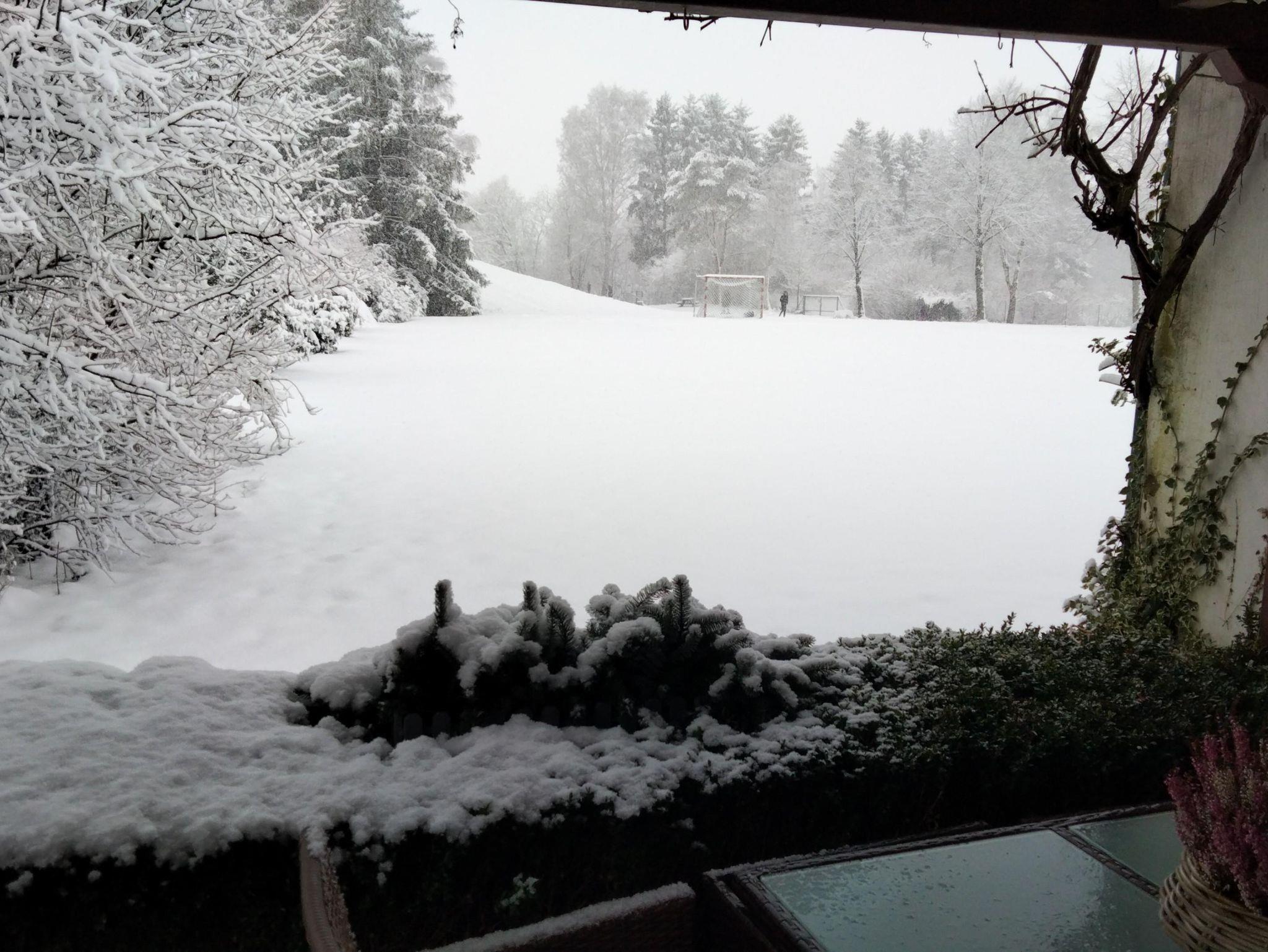 Auf der Terrasse mit Grill genießen Sie den Blick auf den kleinen Rodelberg, eine weite Wiese mit Fußballtoren und Outdoor-Fitnessgeräten.