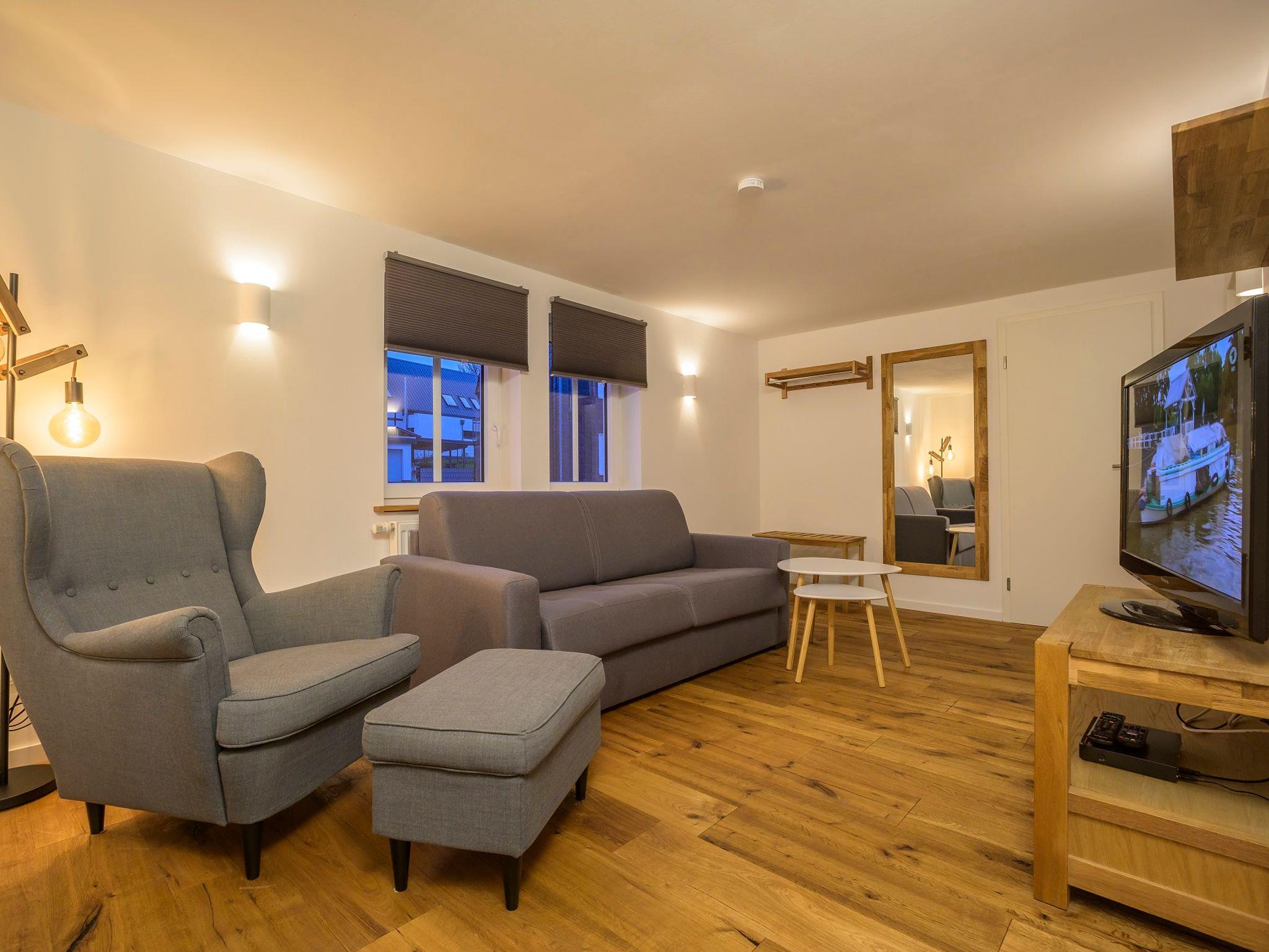 Diese Wohnung ist vom Grundriss identisch mit der Wohnung Oarwe. Besonders in den beiden Schlafräumen wird das urige Gefühl von alten Fachwerkhäusern deutlich und lässt erahnen, das die Menschen früher um einiges kleiner waren als heute.