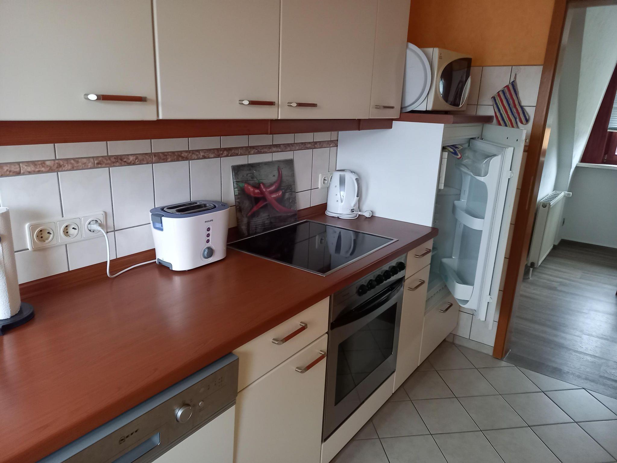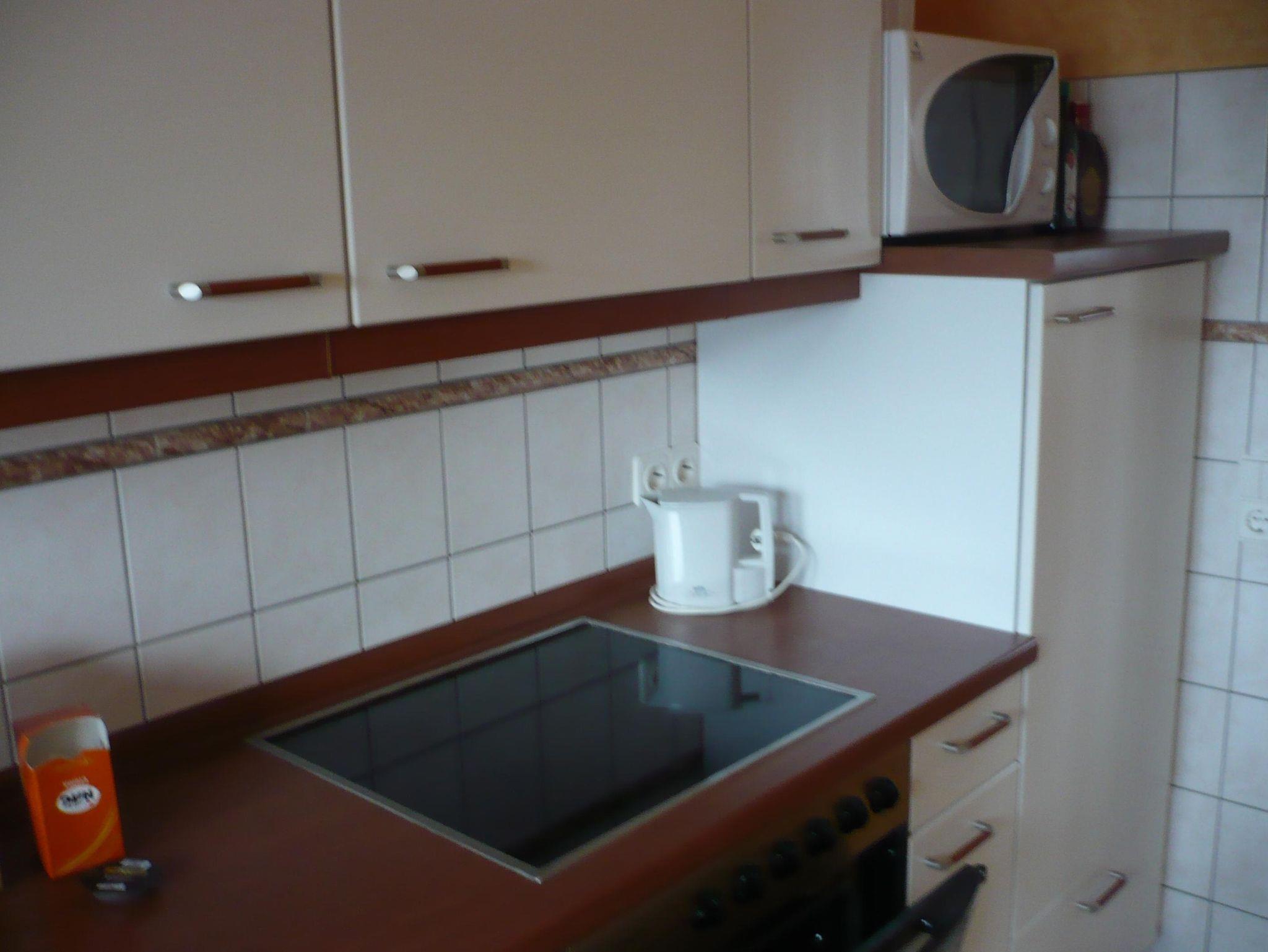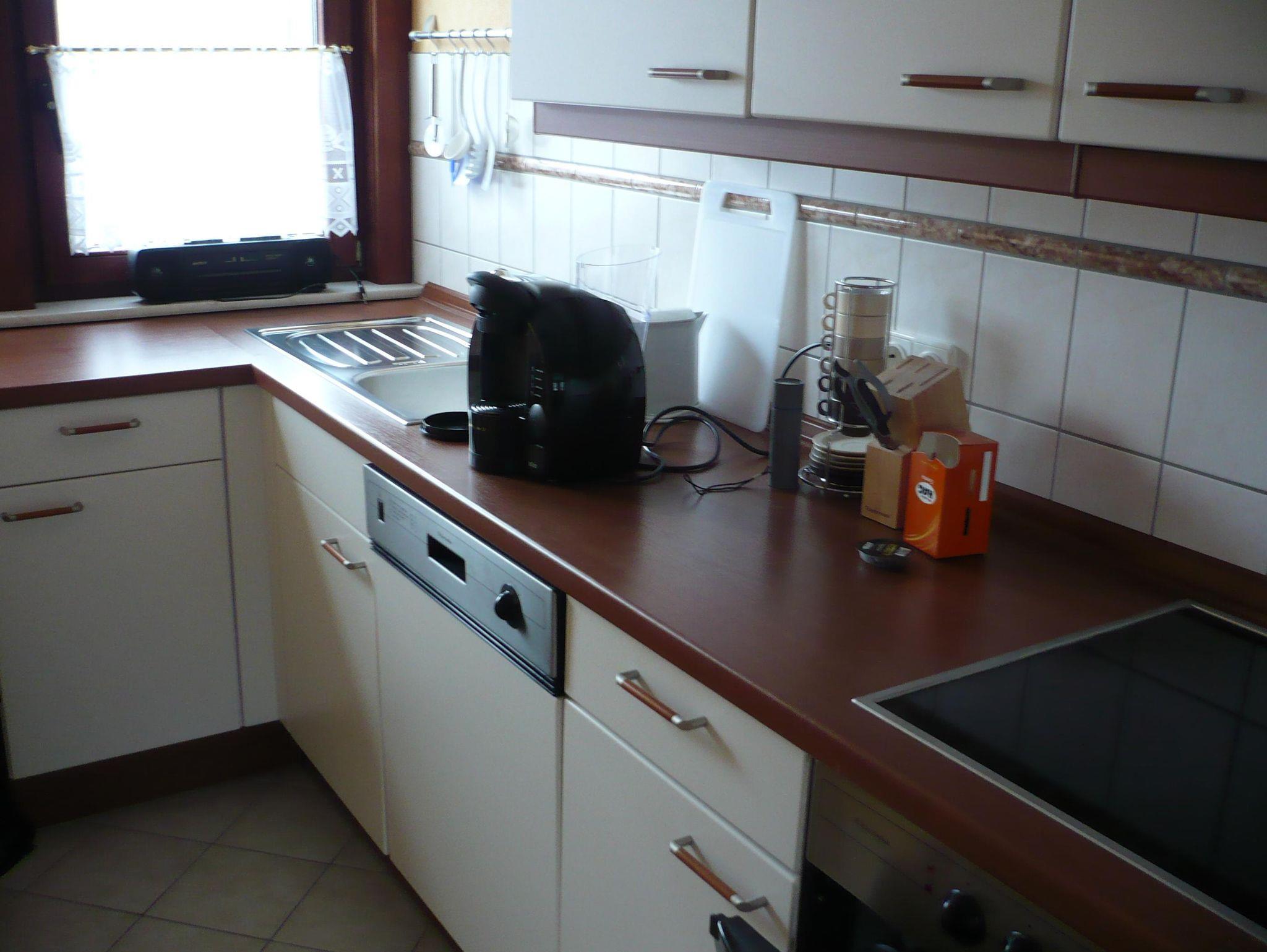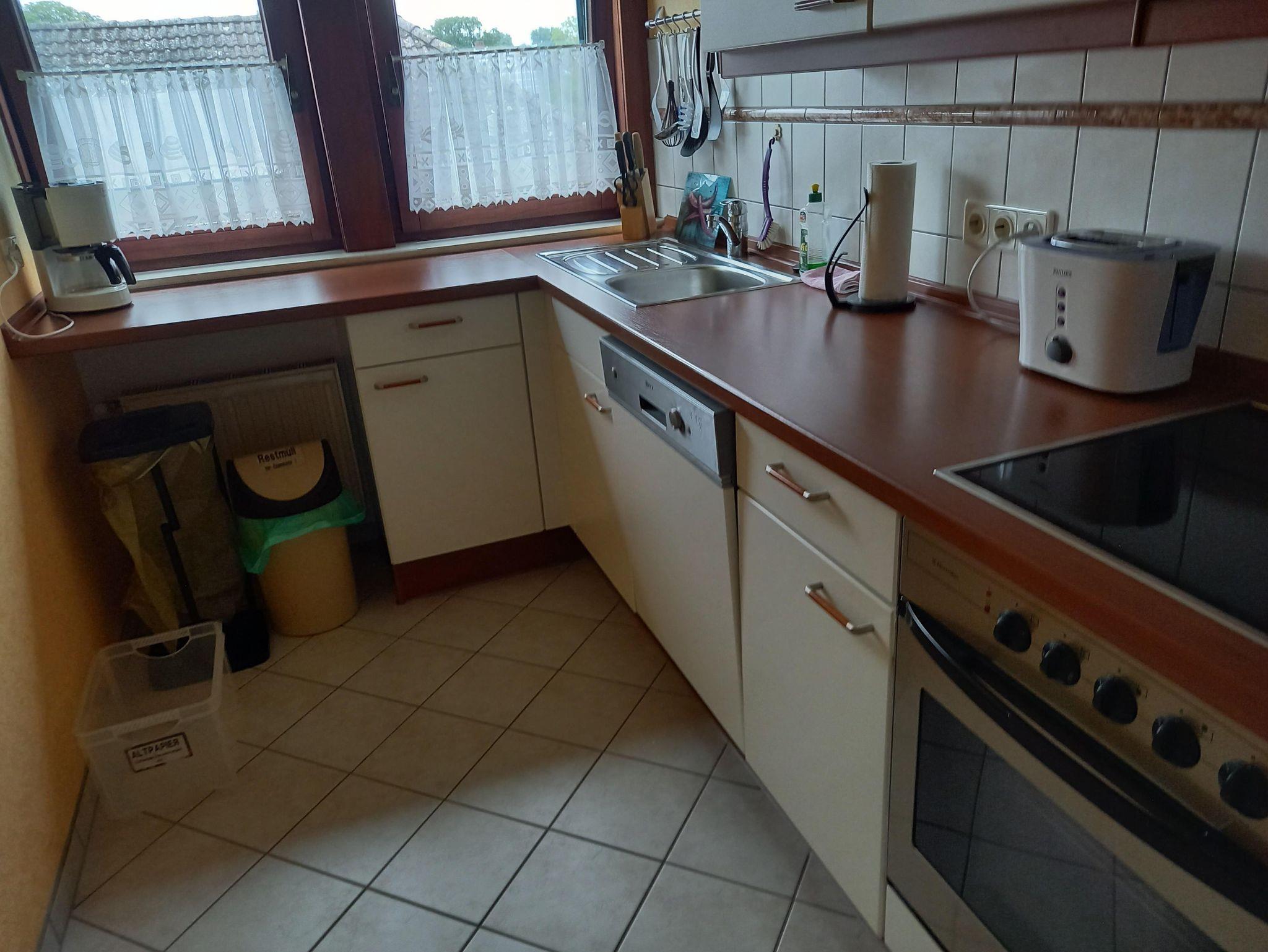 Küche: Geschirrspüler, Mikrowelle, Backofen, E-Herd ( Ceran ) Kühlschrank mit kleinem Gefrierfach und viele elektrische Küchengeräte (Filter-Kaffeemaschine, Eierkocher, Toaster, Wasserkocher, Handmixer)