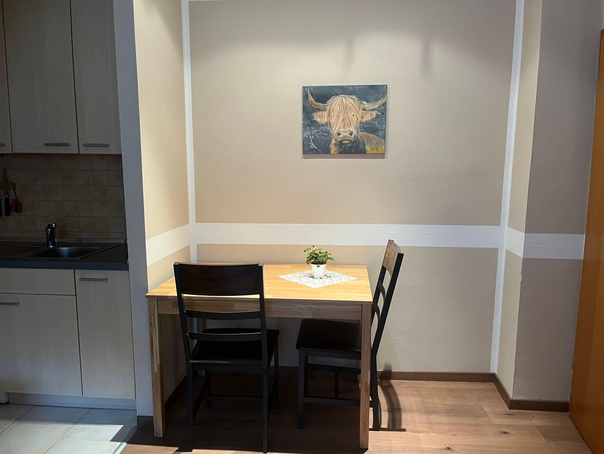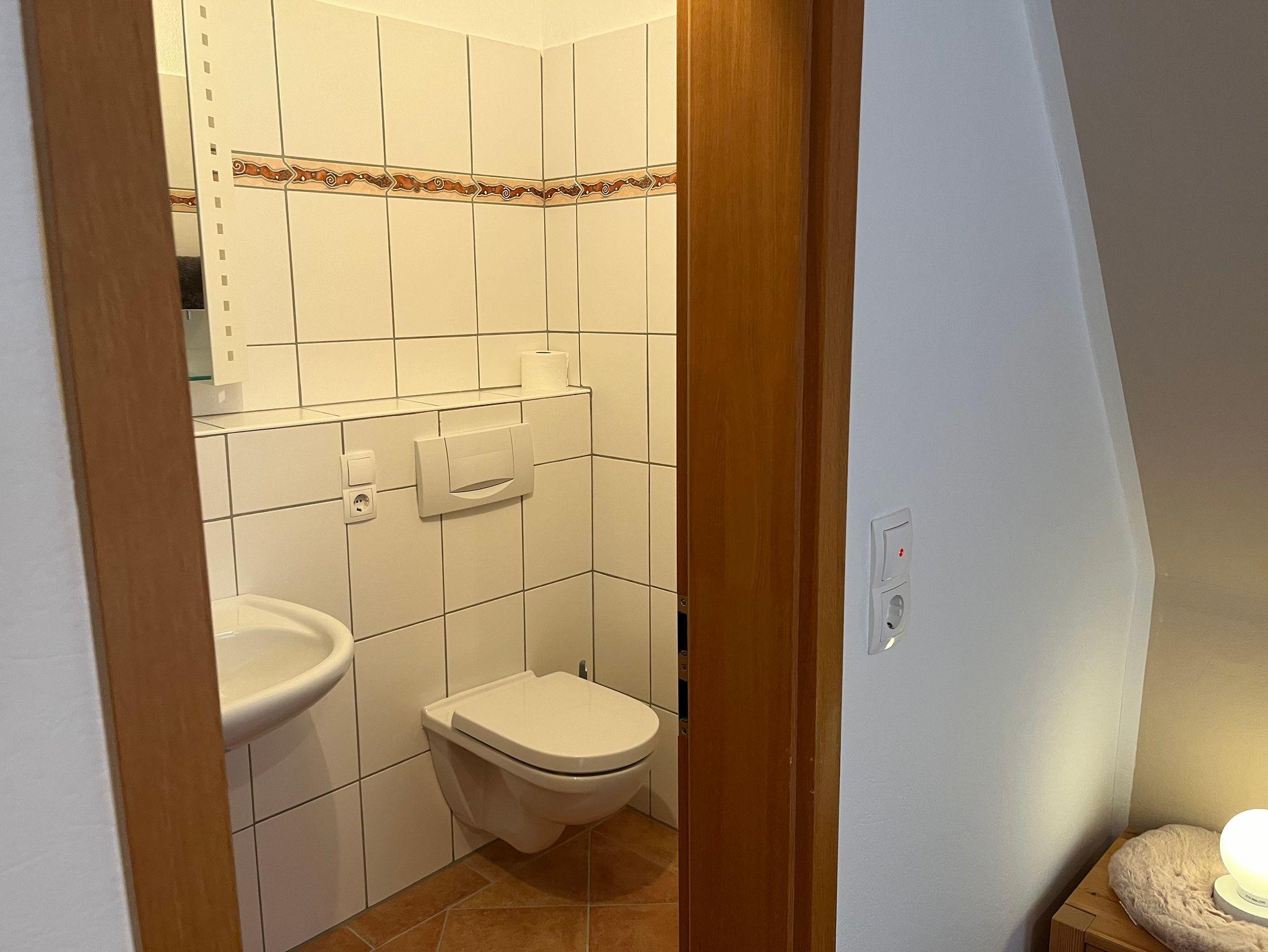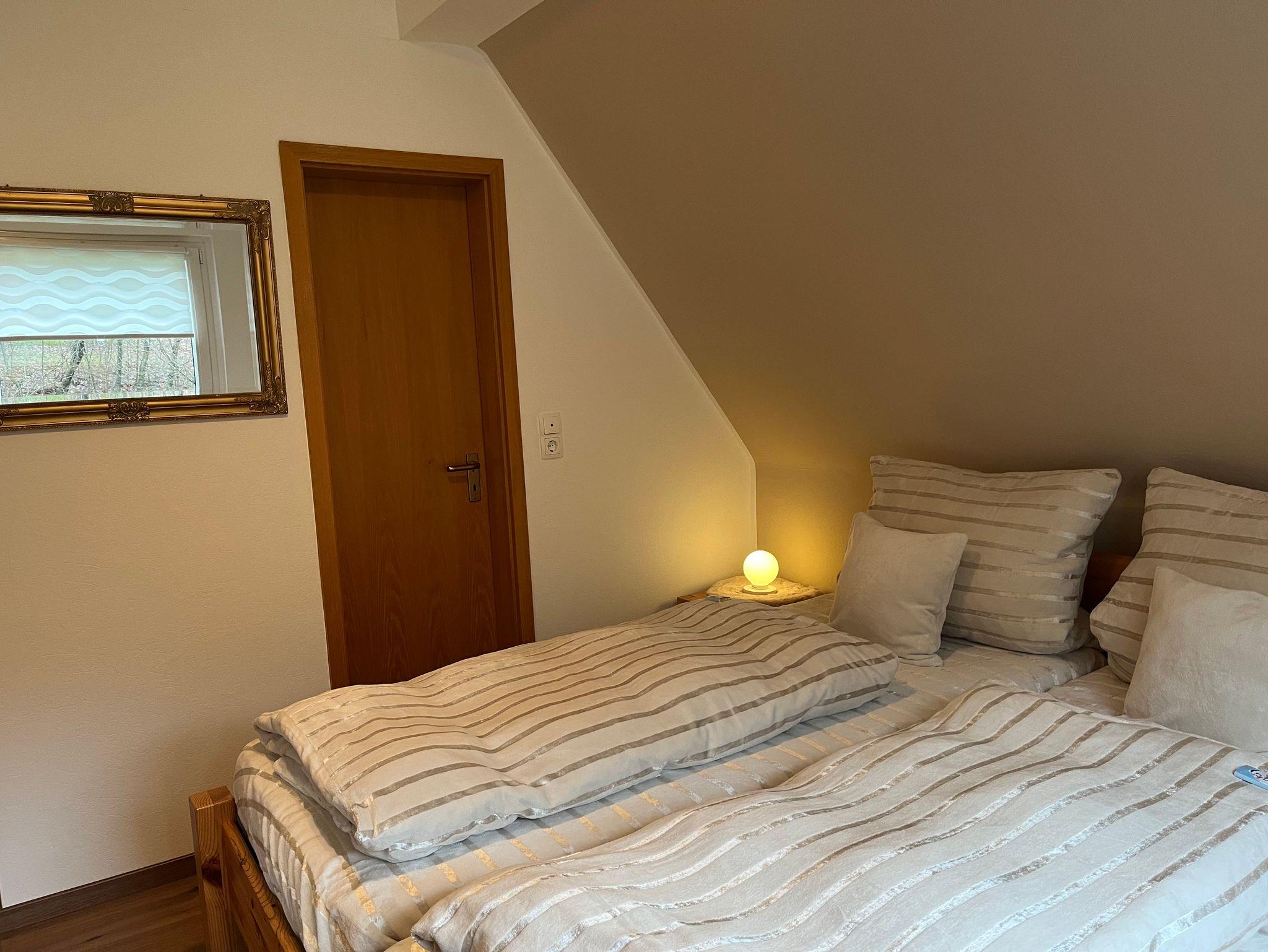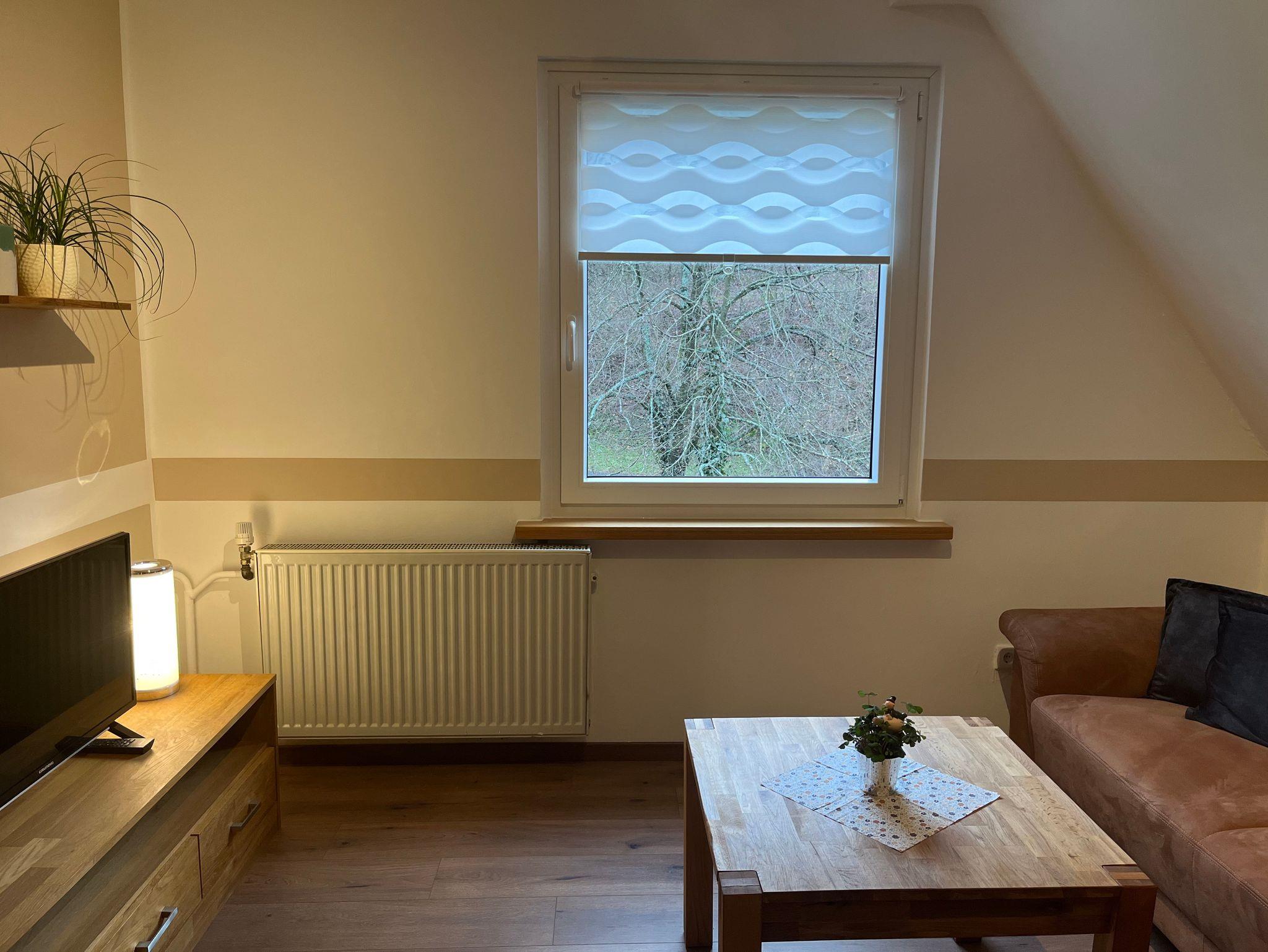 Die Ferienwohnung befindet sich im 2. Obergeschoss des Hauses. Die Wohnung verfügt über ein Schlafzimmer mit Doppelbett, eine Küchenzeile mit Kühlschrank (incl. kleinem Gefrierfach), 2 Plattenherd, Kaffeemaschine, Wasserkocher und Toaster. Das Badezimmer verfügt über Dusche, WC, Waschbecken und Föhn.