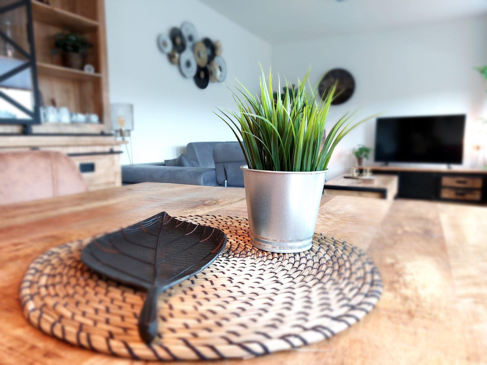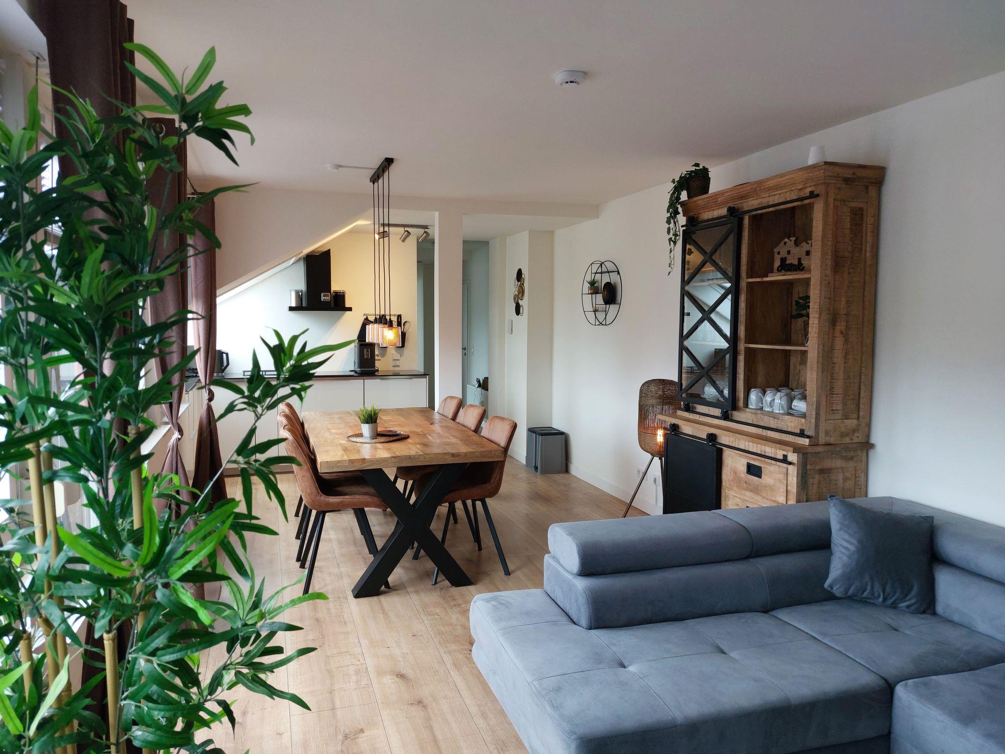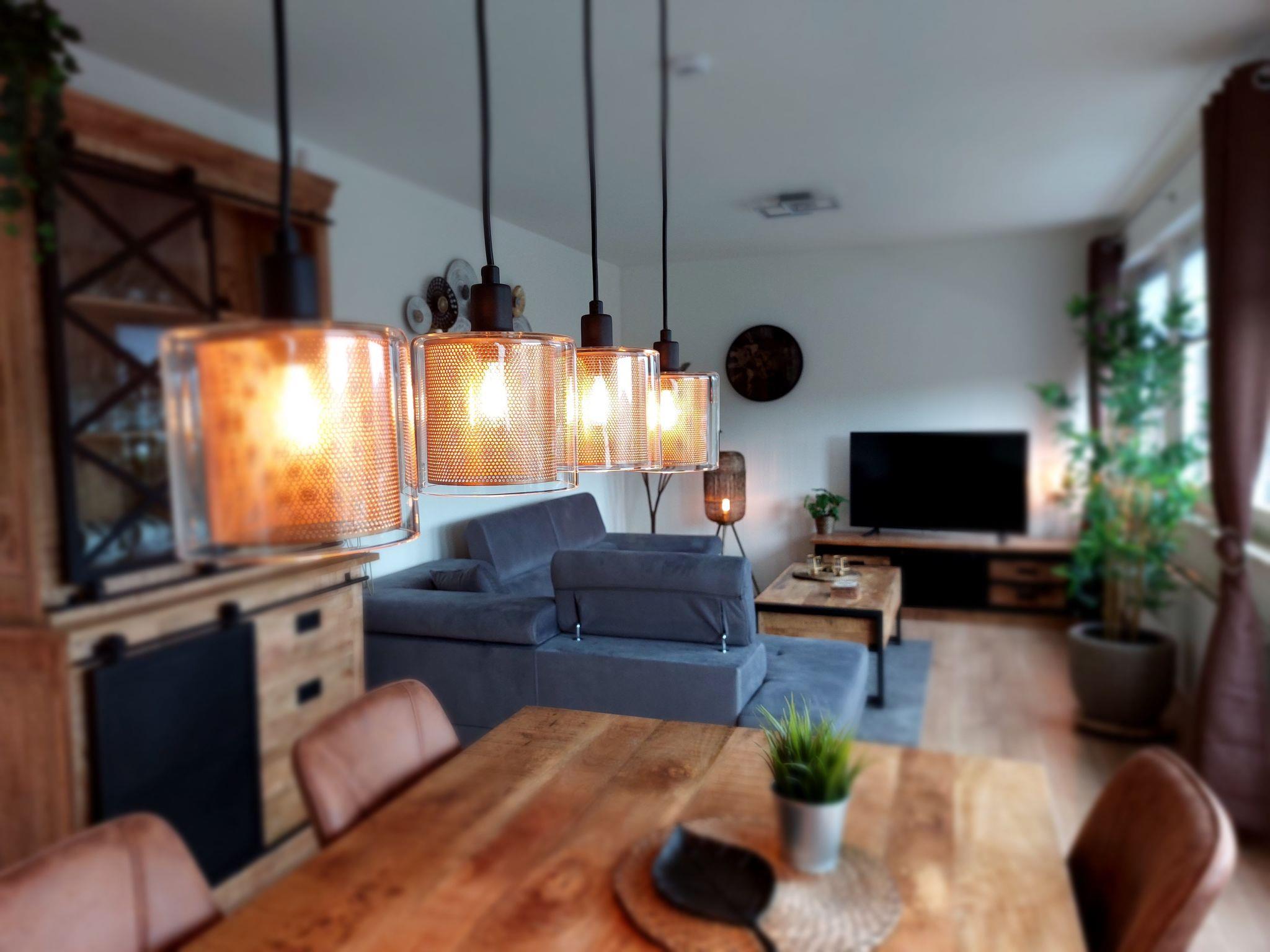 The living room is equipped with a large Smart TV (Netflix, NLZiet, Waipu TV) and shutters. The spacious living room also has a large dining table.