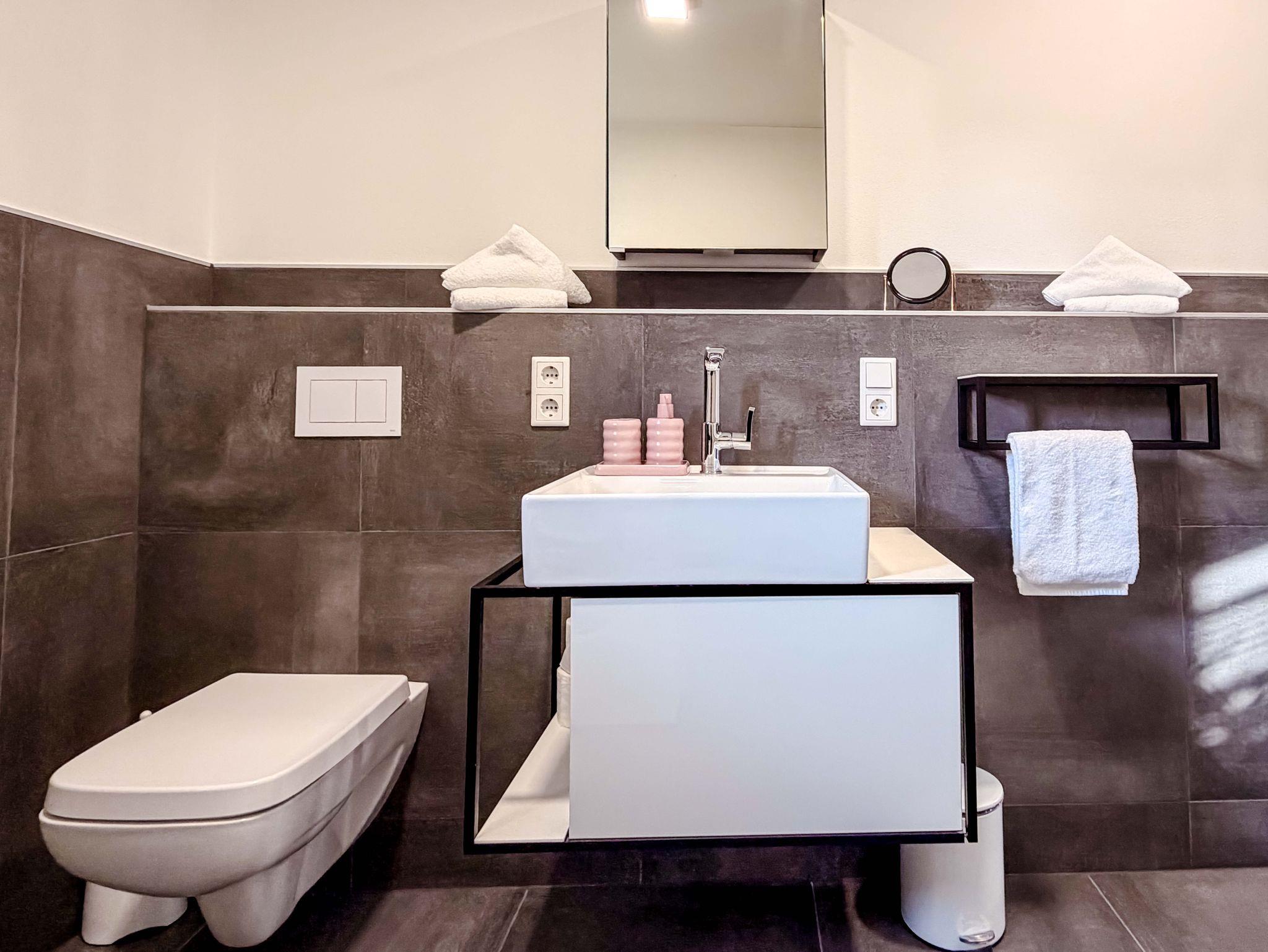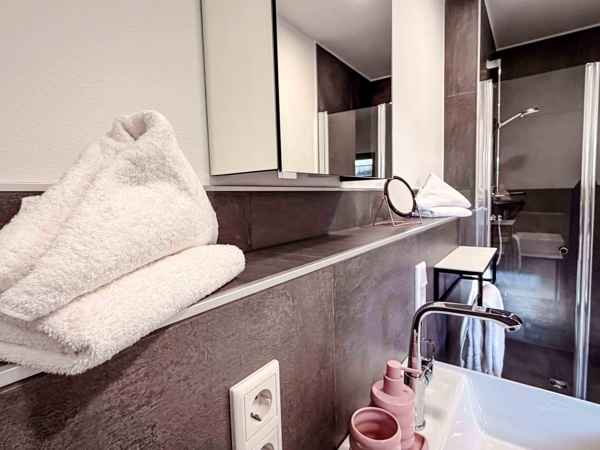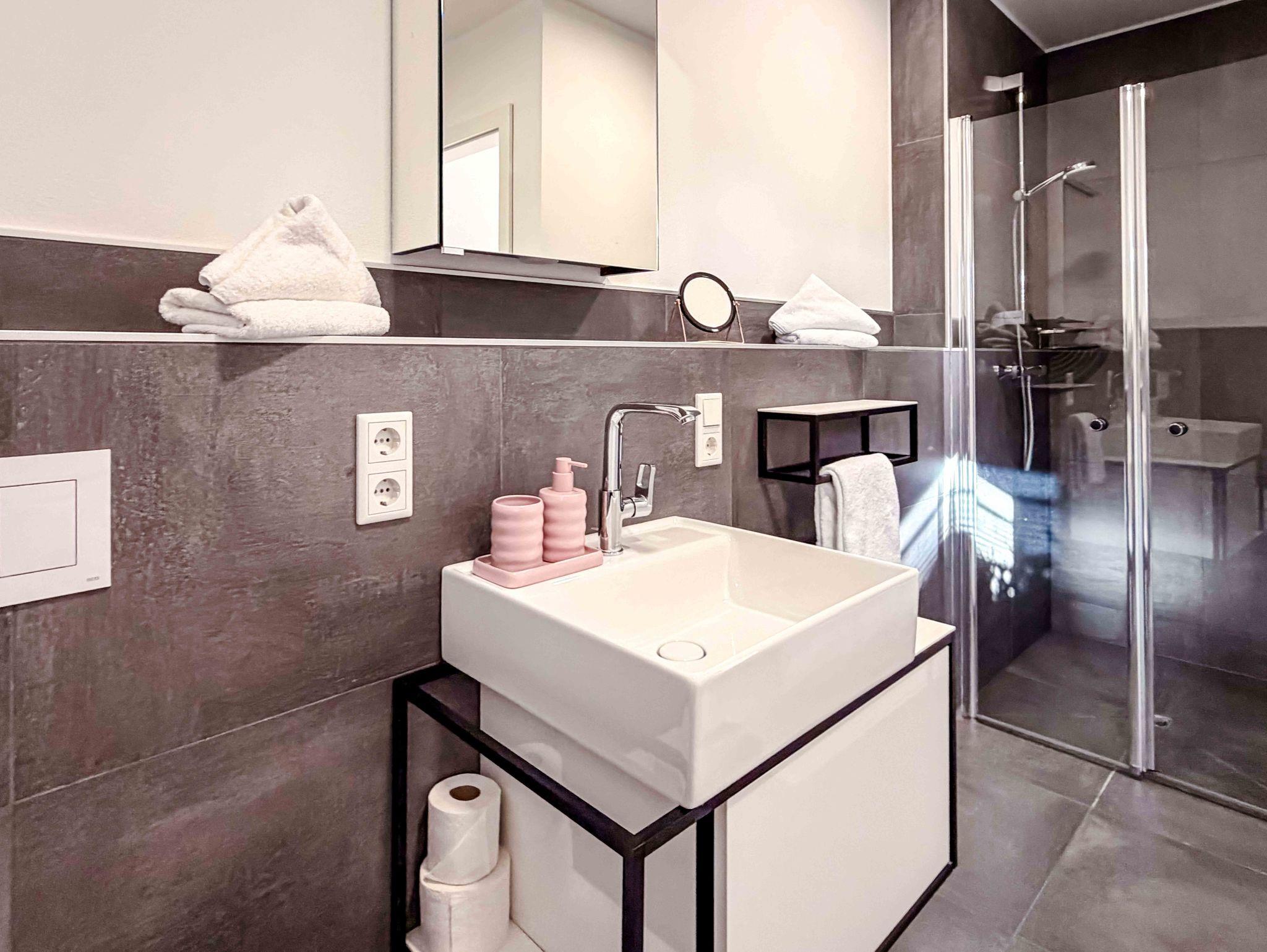 Das Bad ist hell und modern mit einer großzügigen Dusche. Ergänzt wird die Wohnung durch einen separaten Bereich für Kleidung sowie einen kleinen Eingangsbereich für Jacken und Schuhe.